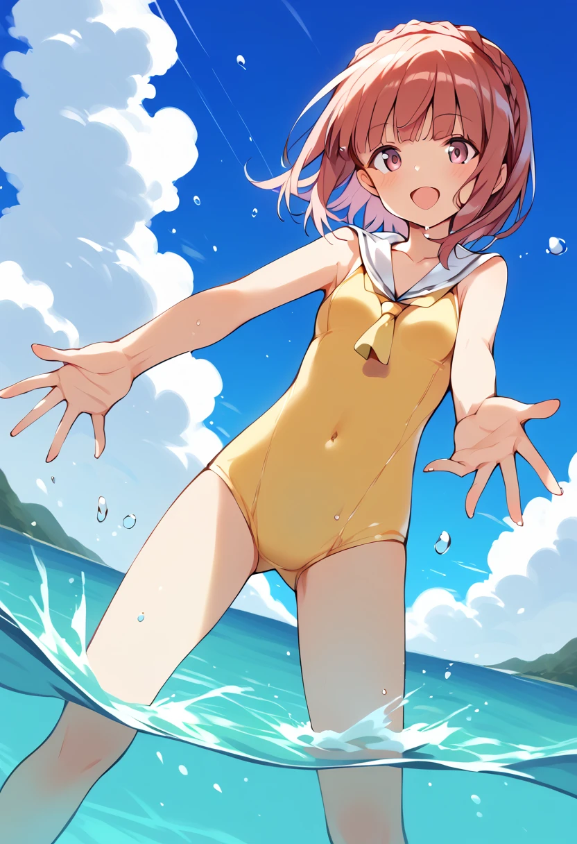 aikawa aika, prrll-smmr, french braid, crown braid, blunt bangs, short hair, red hair, pink hair, sidelocks, bob cut, eyebrows visible through hair, purple eyes, yellow one-piece swimsuit, casual one-piece swimsuit, yellow swimsuit, white sailor collar, yellow neckwear, yellow necktie, short necktie, bare arms, bare shoulders, collarbone, covered navel, bare legs