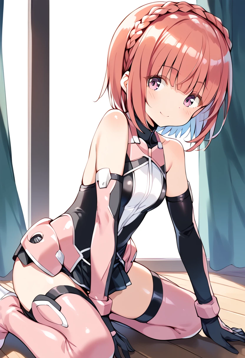 aikawa aika, ace suit, another gear, alice gear, french braid, crown braid, blunt bangs, short hair, red hair, pink hair, sidelocks, bob cut, eyebrows visible through hair, purple eyes, black leotard, pink leotard, two-tone leotard, armored leotard, pink collar, halterneck, black gloves, elbow gloves, microskirt, black skirt, black panties, faulds, pink footwear, thigh boots, knee boots, armored boots, headgear, vambraces, armor, greaves, mecha musume, bare shoulders