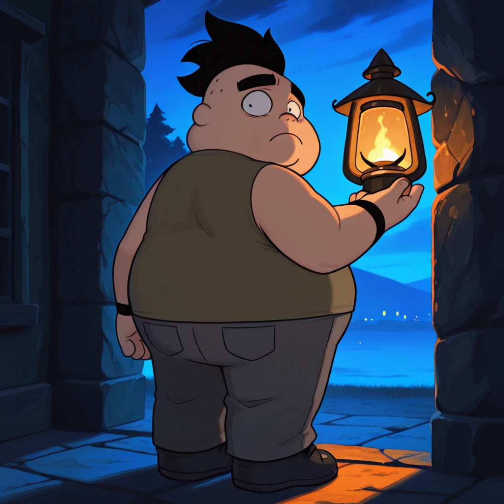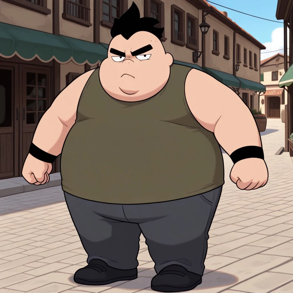p1n3appl3, black eyes, black hair, spiky hair, thick eyebrows, double chin, fat, plump, 1boy, male