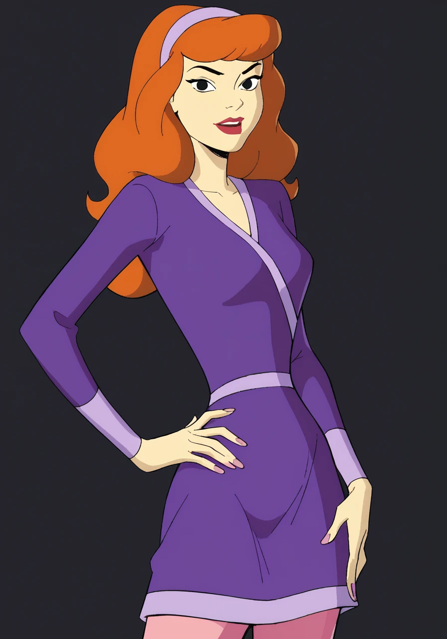 WhatsNewDaphne, (score_9, score_8_up), purple dress, hair band, red hair