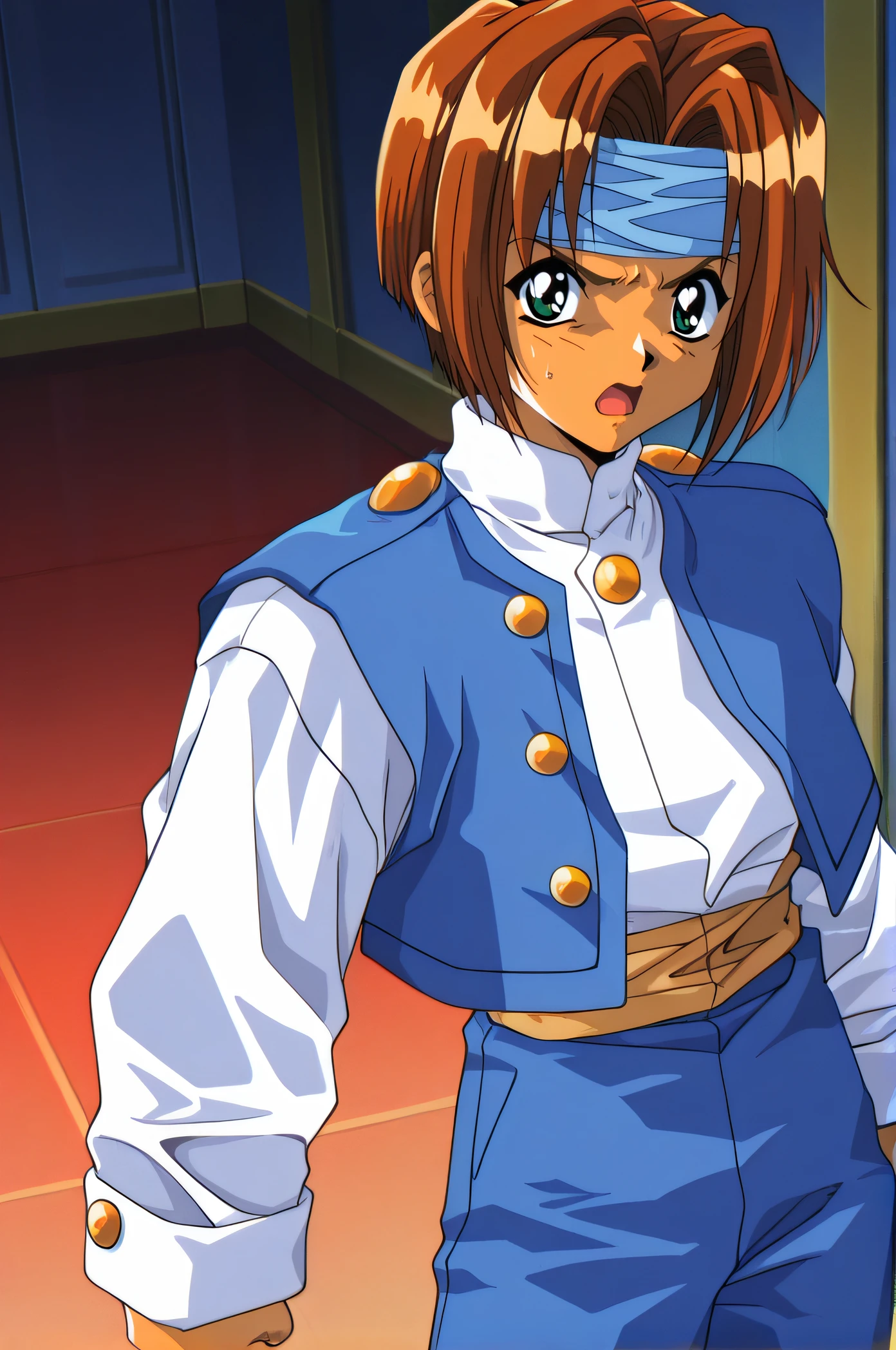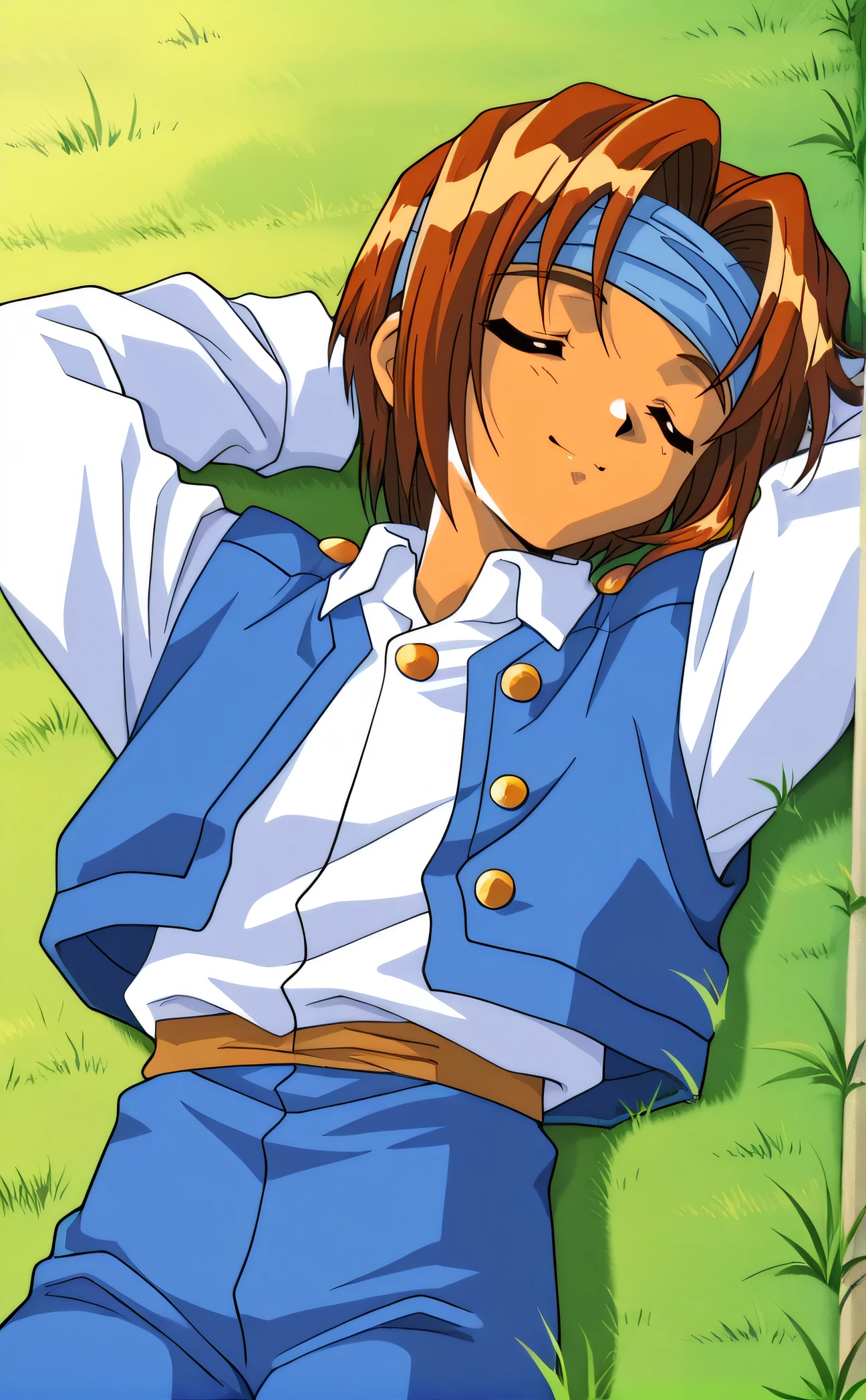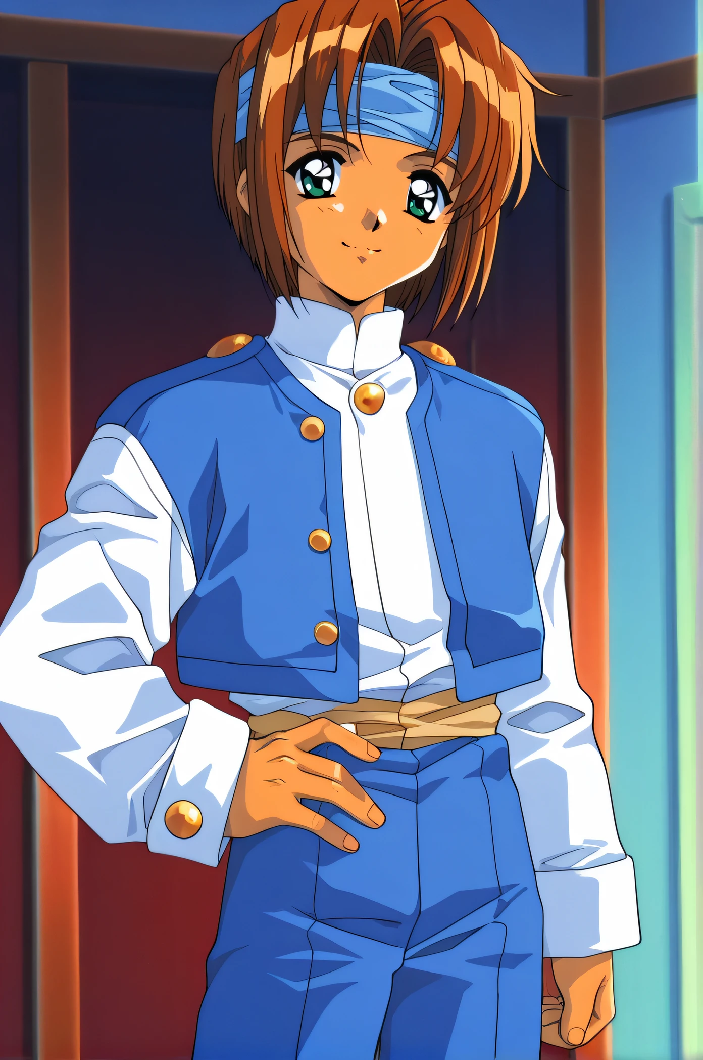 cain, brown hair, blue headband, green eyes, short hair, medium hair, white shirt, blue vest, white long sleeves, blue pants