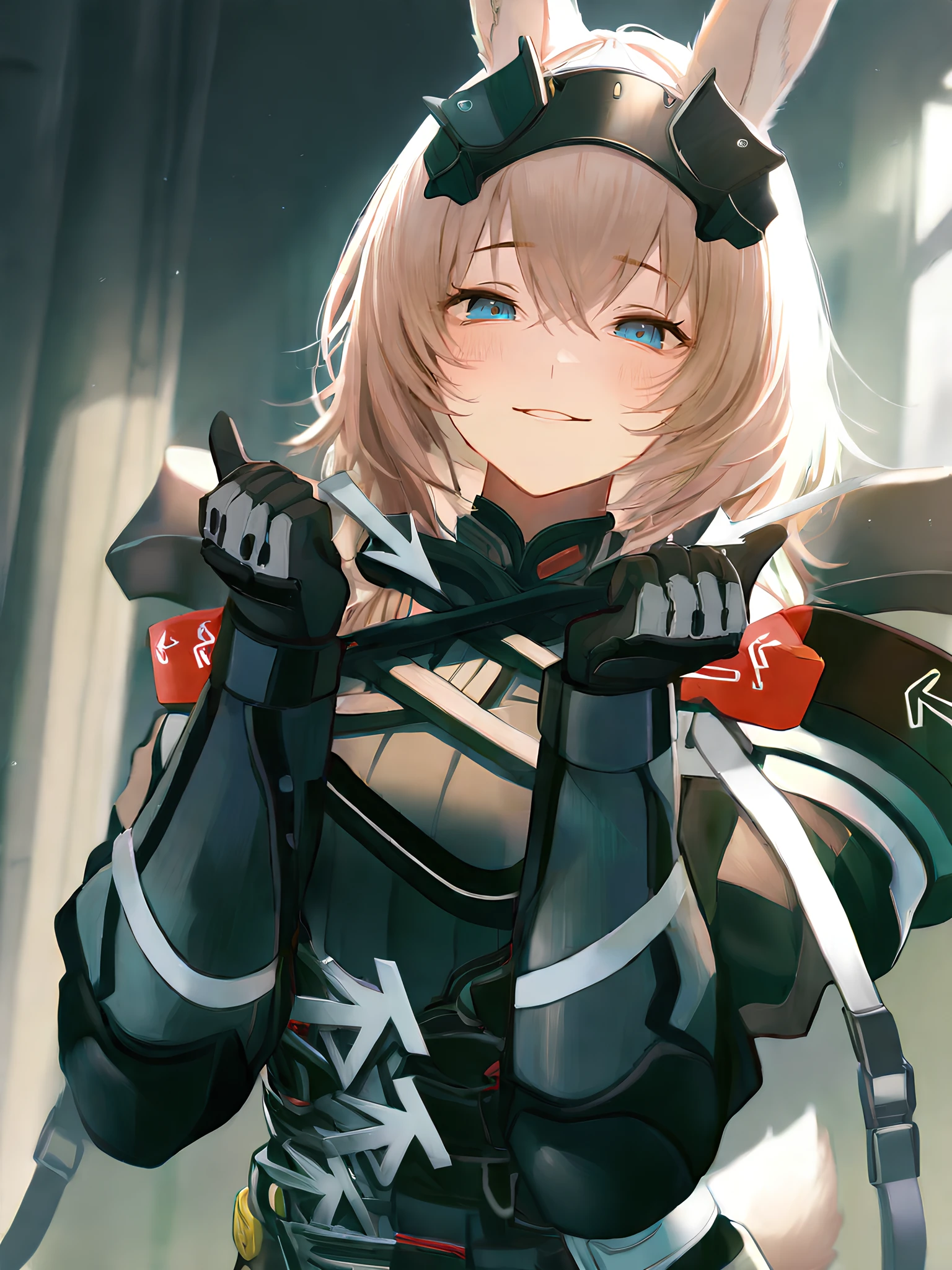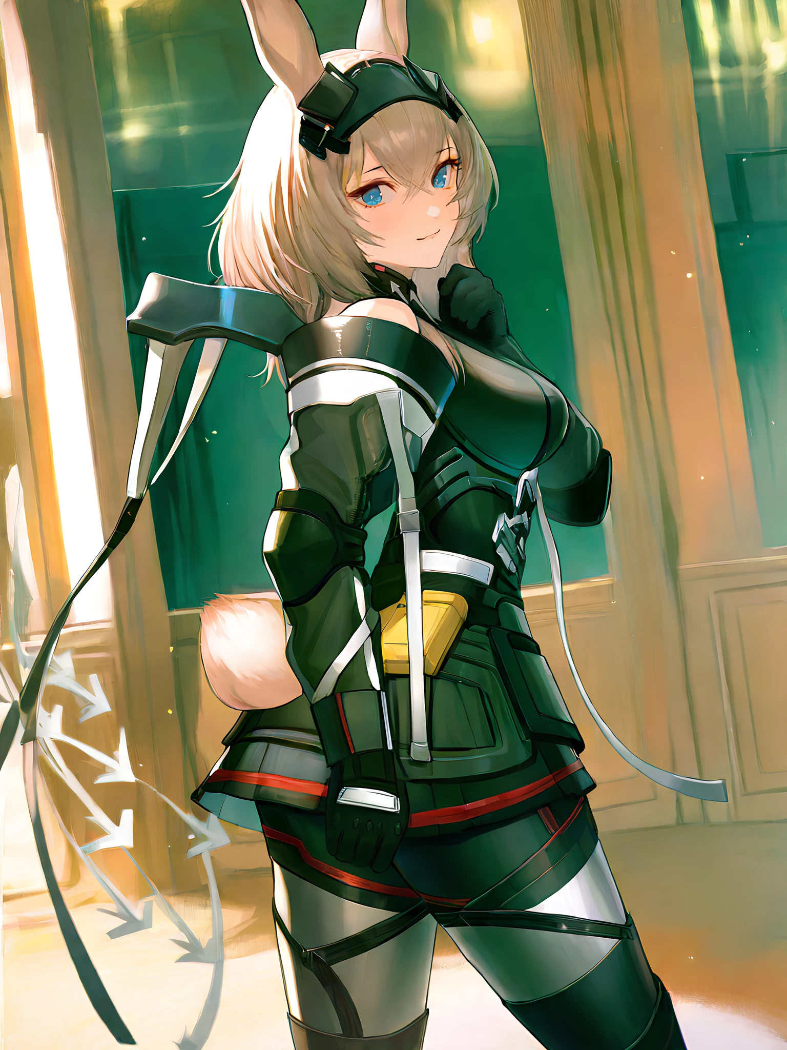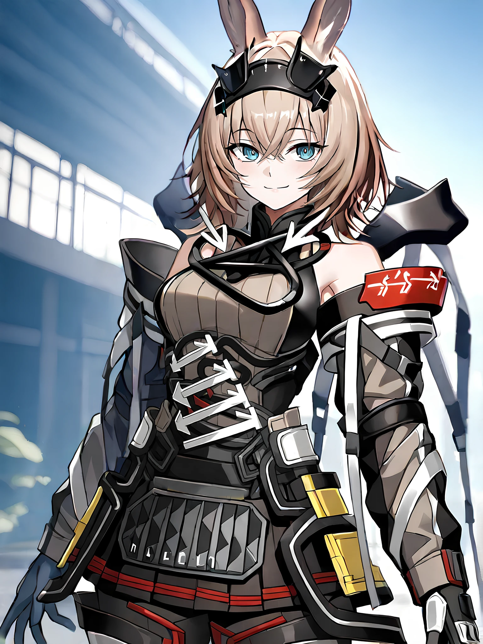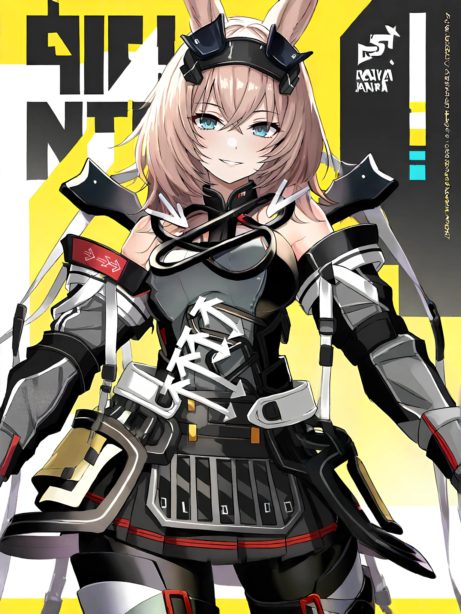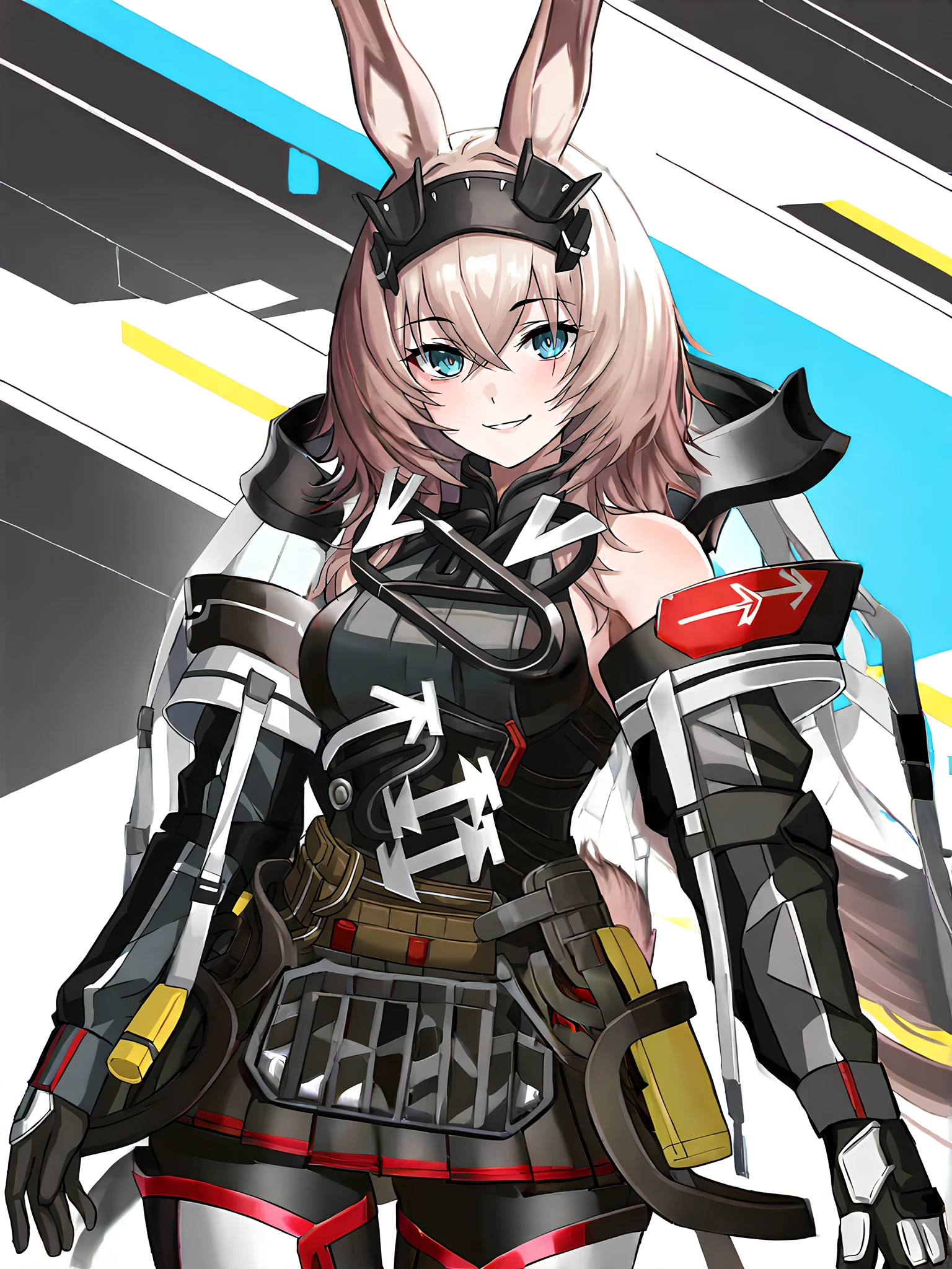 Full: Avywenna, girl with long rabbit ears, short light brown hair with bangs, bright blue eyes, black patch on her head with angular metal plates, black and gray tactical jumpsuit with white arrows on the chest, white arrows on the stomach, bare shoulders, long sleeves with straps, red accent stripes, black gloves with reinforced knuckles, rounded frames on the sides of the hips on the skirt, black armored thigh-length leggings with red trim, black army boots with silver buckles, yellow waist bag, rabbits tail.
