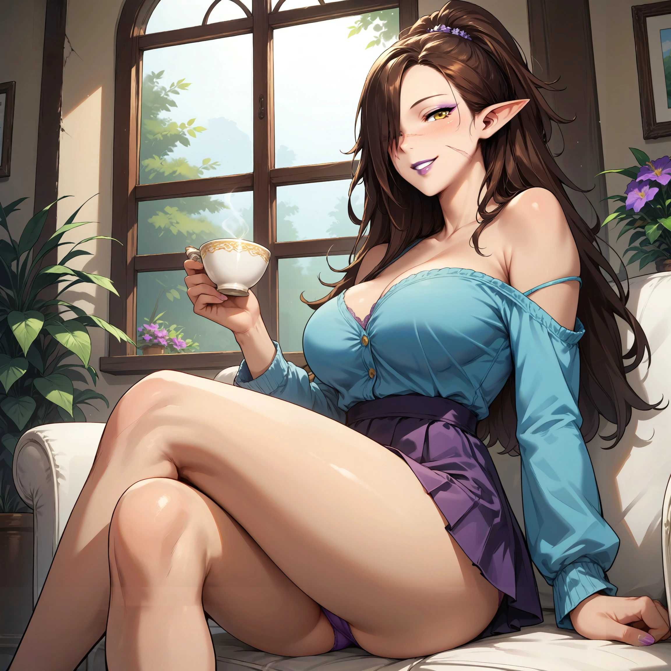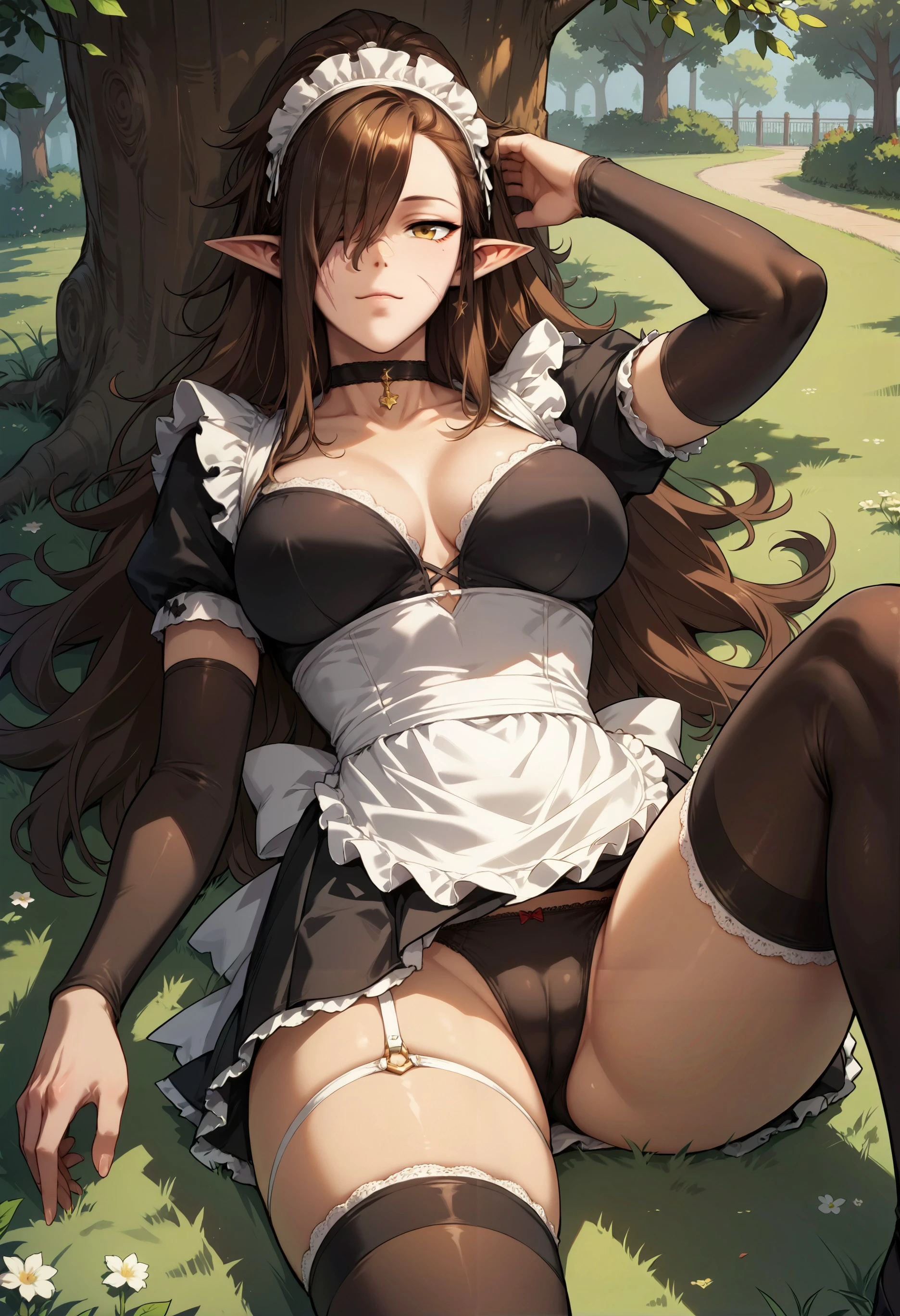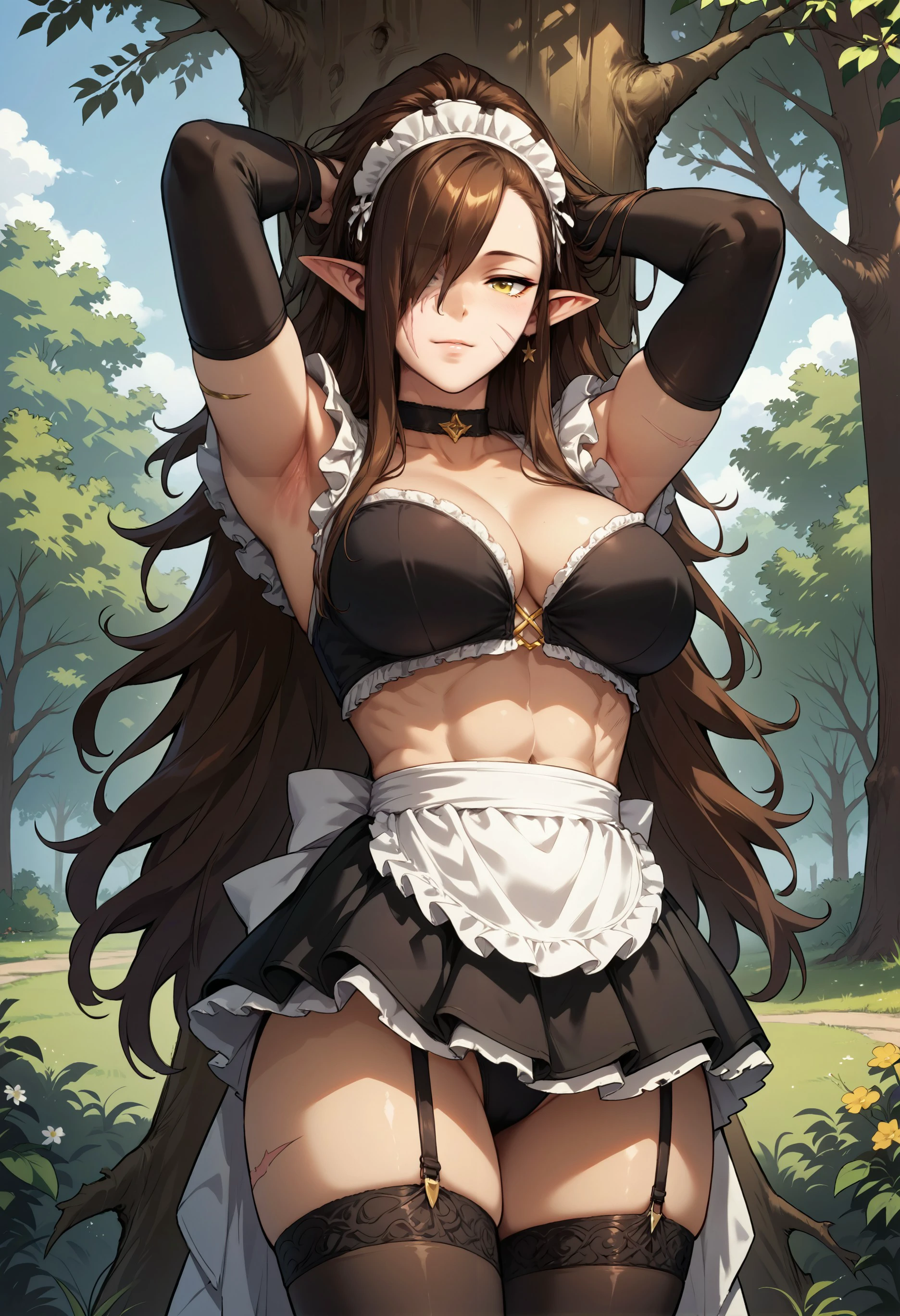 akwilla, long hair, pointy ears, brown hair, scar, scar on face, yellow eyes, hair over one eye, ponytail, solo, muscular, dark skin, bandages, muscular female,