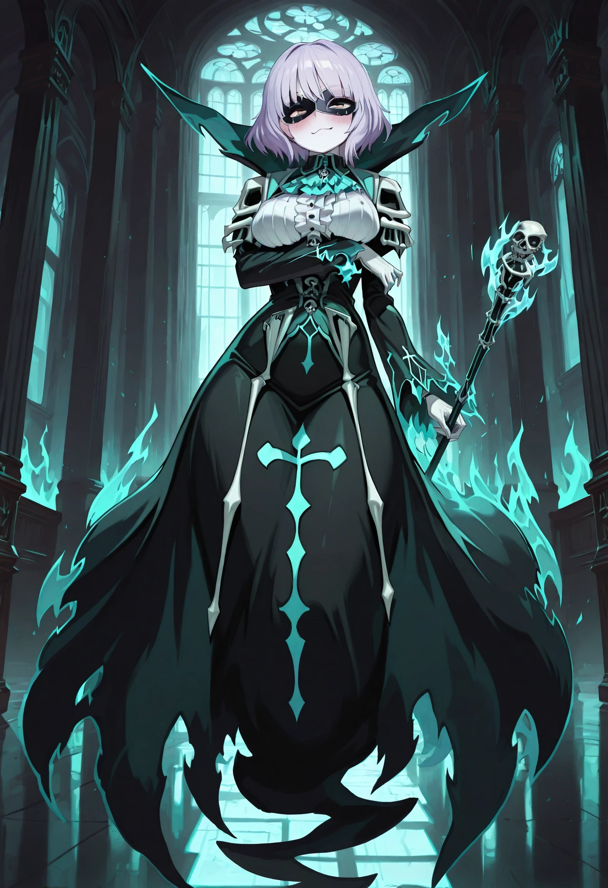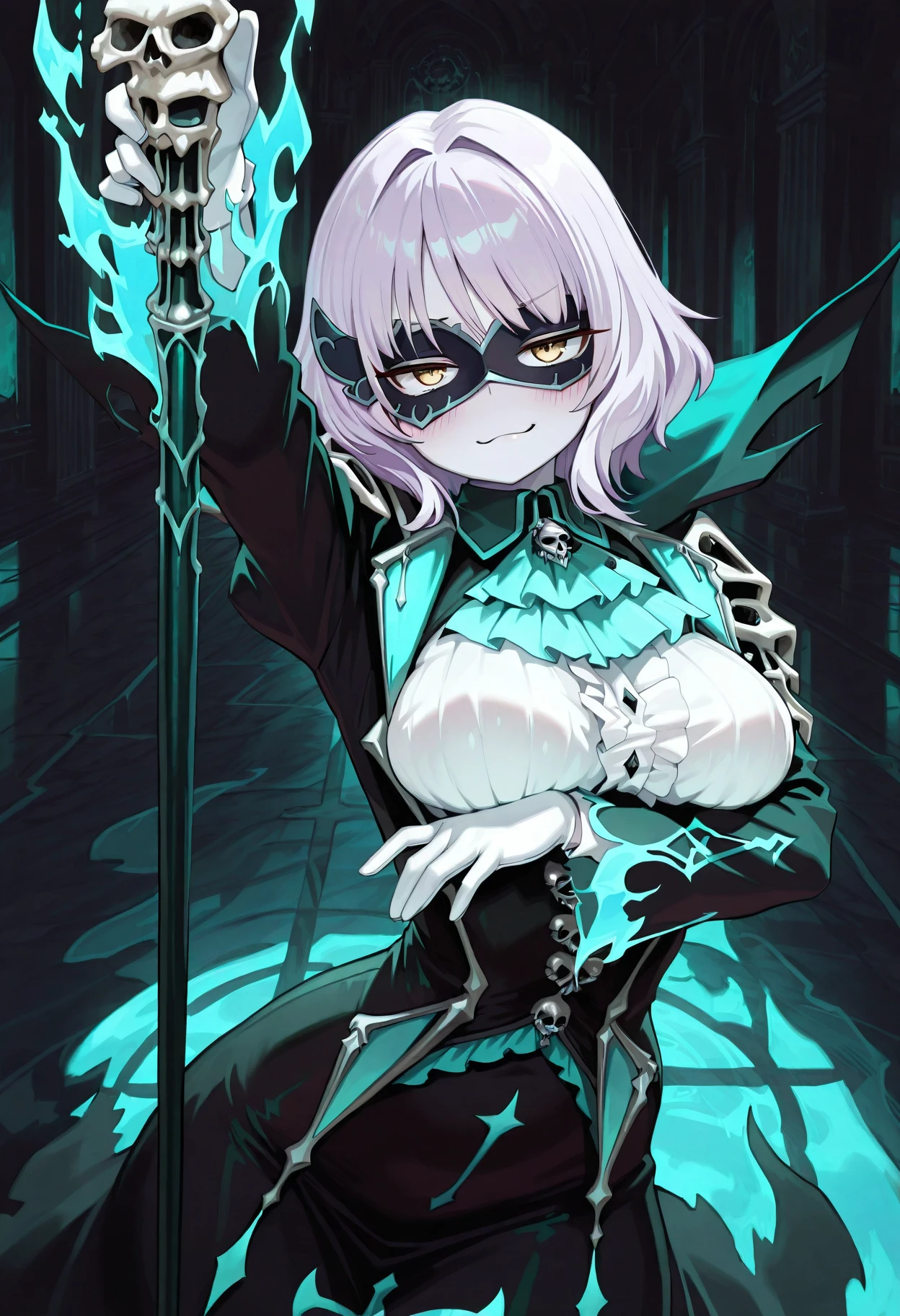 eye mask, asymmetrical mask, white top, black cape, multicolored cape, teal cape, torn clothes, translucent dress, black dress, high collar, white gloves, teal ascot, teal trim, cross print, skull ornamentπ Gothic Accessories: