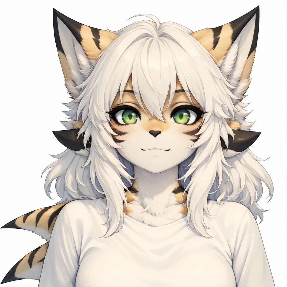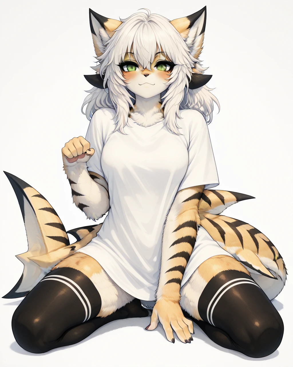 works gud with: <lora:Desert_Tiger_Shark_Girl_r2:1>, masterpiece, best quality, hires, high resolution, absurdes, 1girl, solo, furry, desert tiger shark, tiger stripes, short white hair, shark tail, green eyes, perfect eyes, thighs, white t-shirt, black thigh highs, two white stripes on thigh highs,