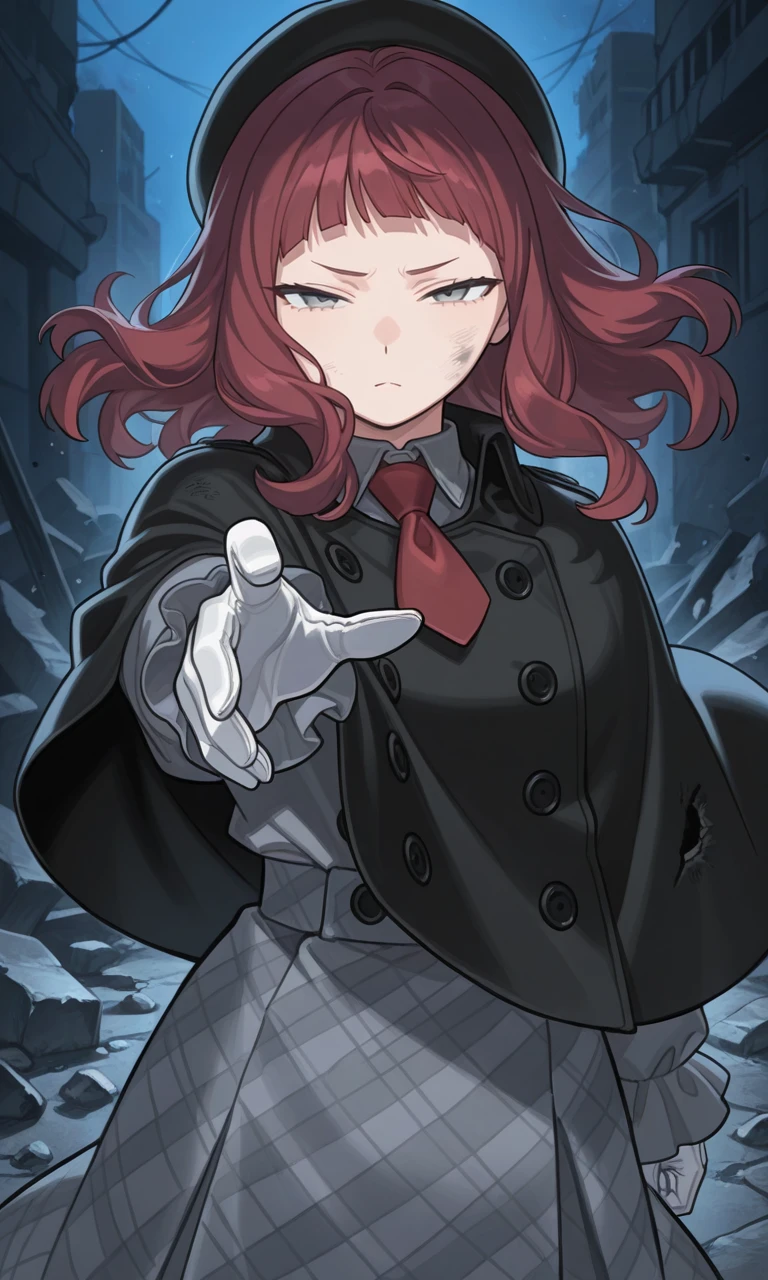 beret, dress shirt, short necktie, double-breasted poncho, gloves, gingham skirt, pantyhose, knee rain boots