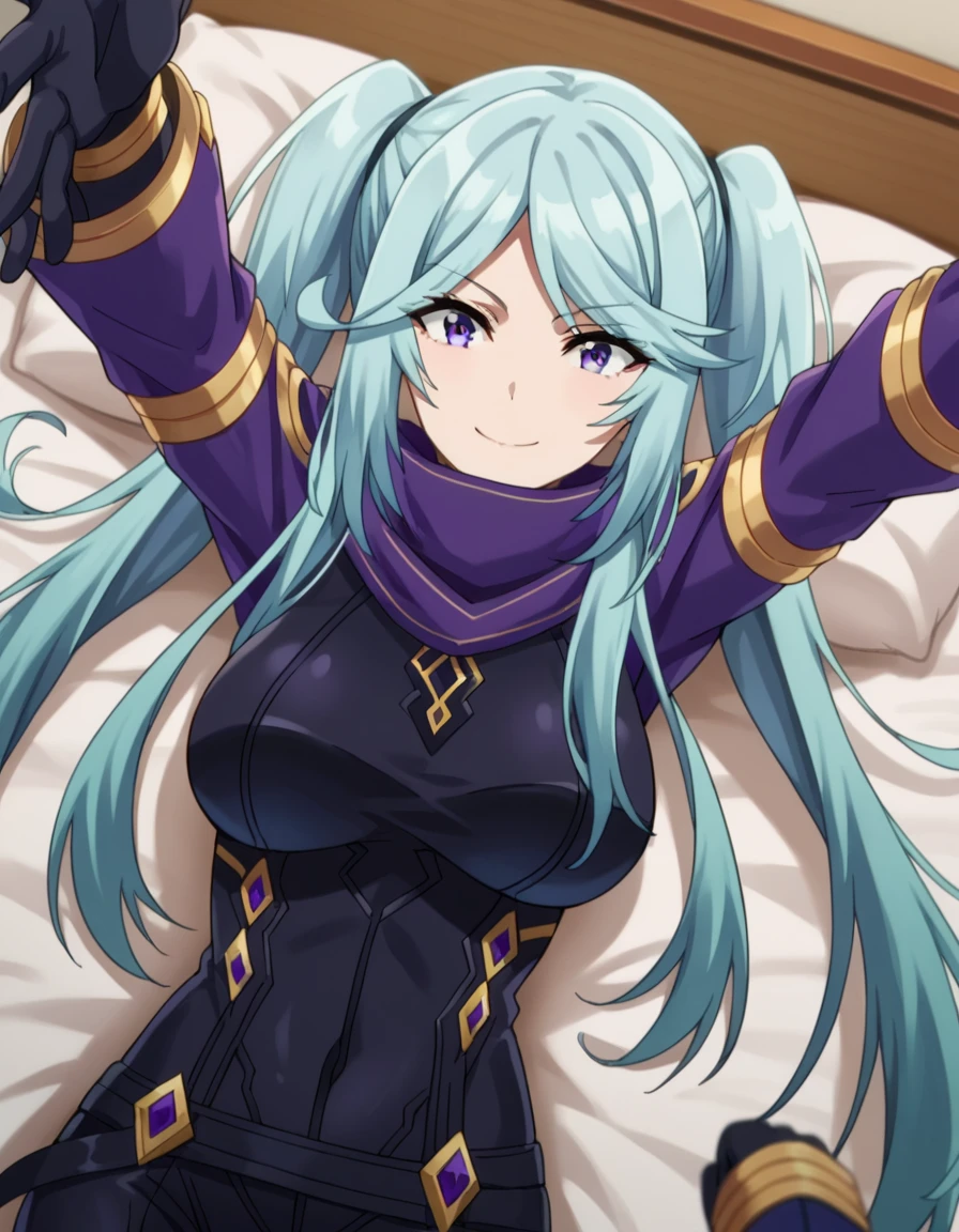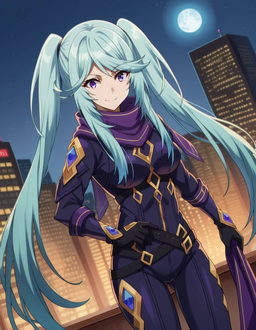 bodysuit, scarf, purple scarf, gloves, black gloves,