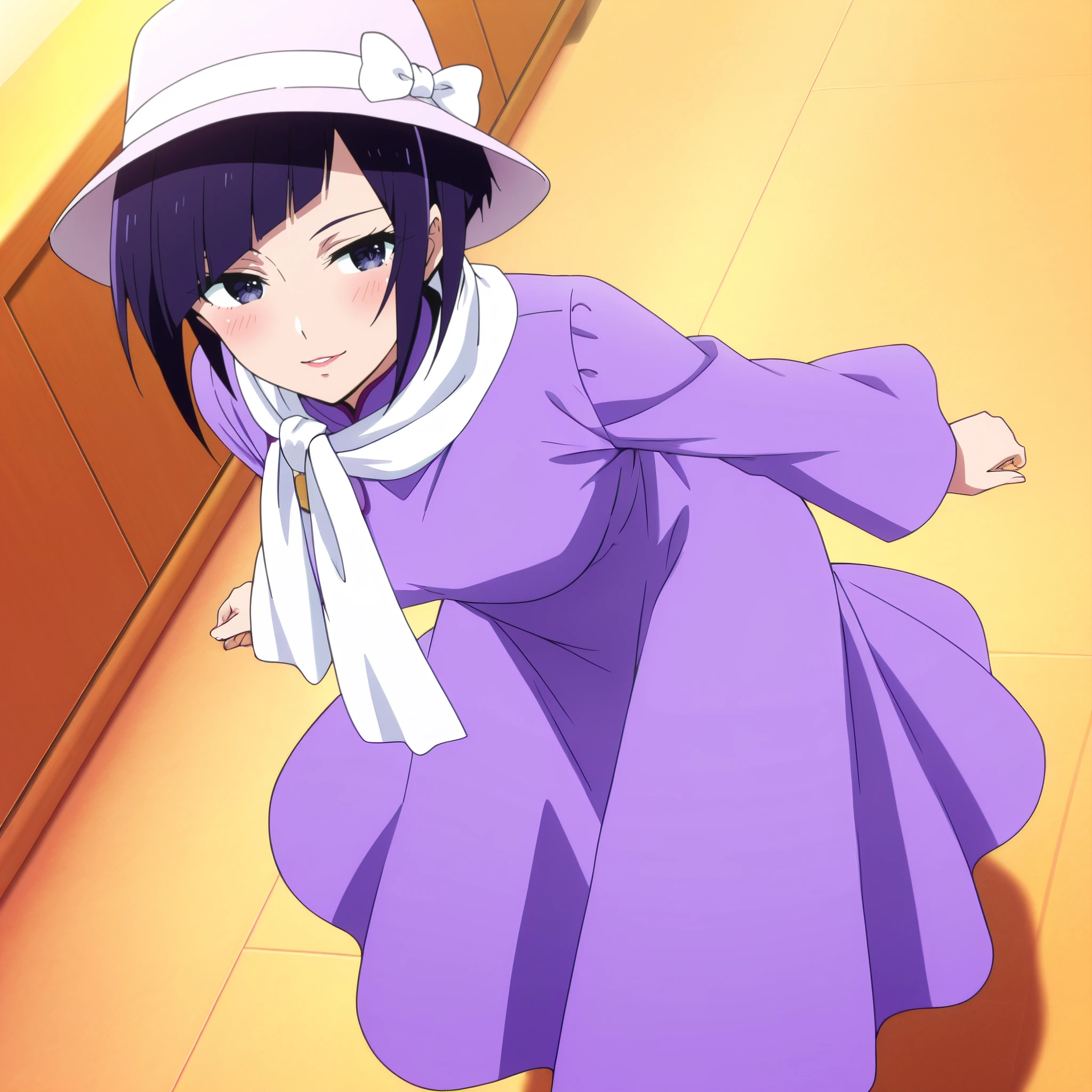RankoDress, bow, hat, bag, long sleeves, dress, white bow, scarf, hat bow, purple dress, long dress,