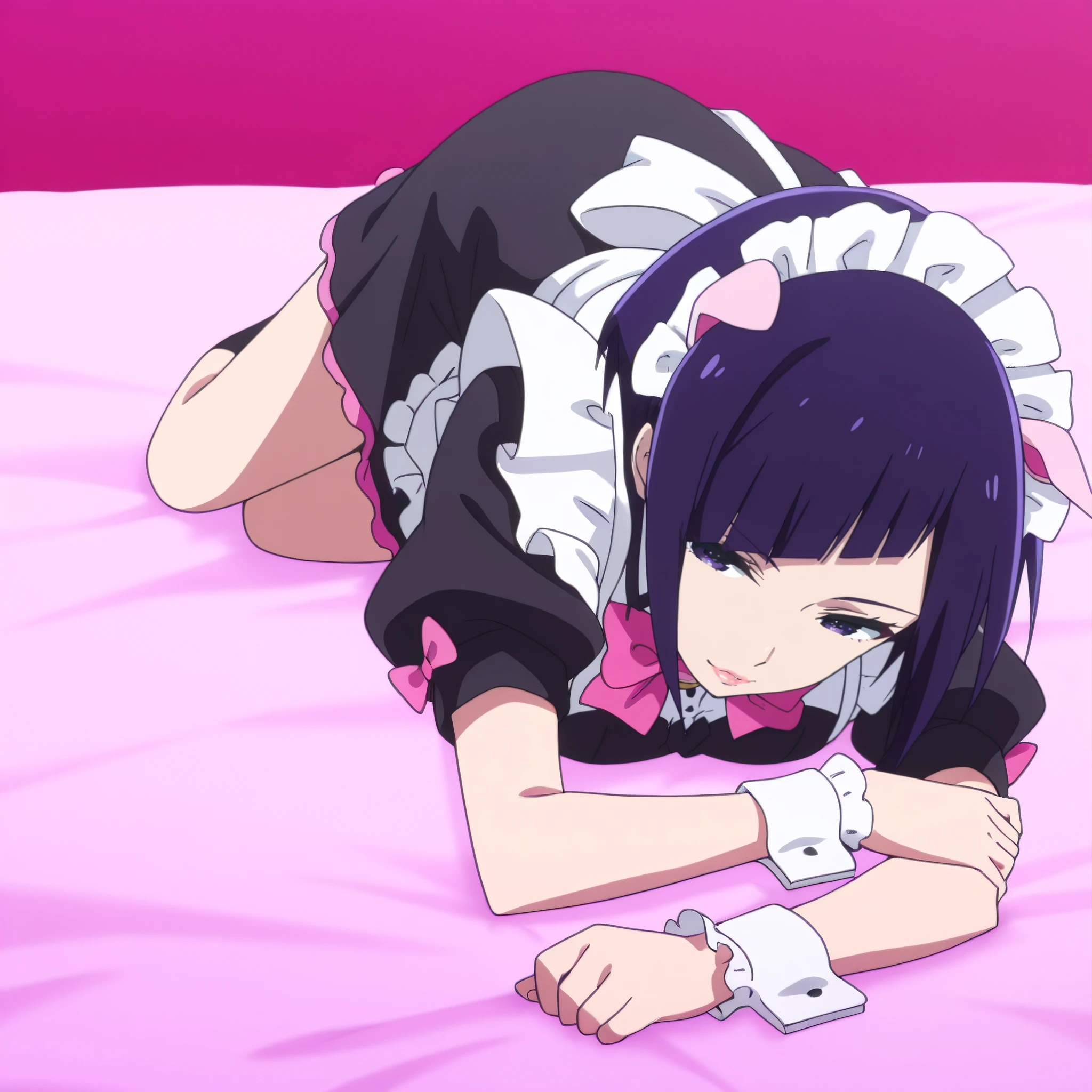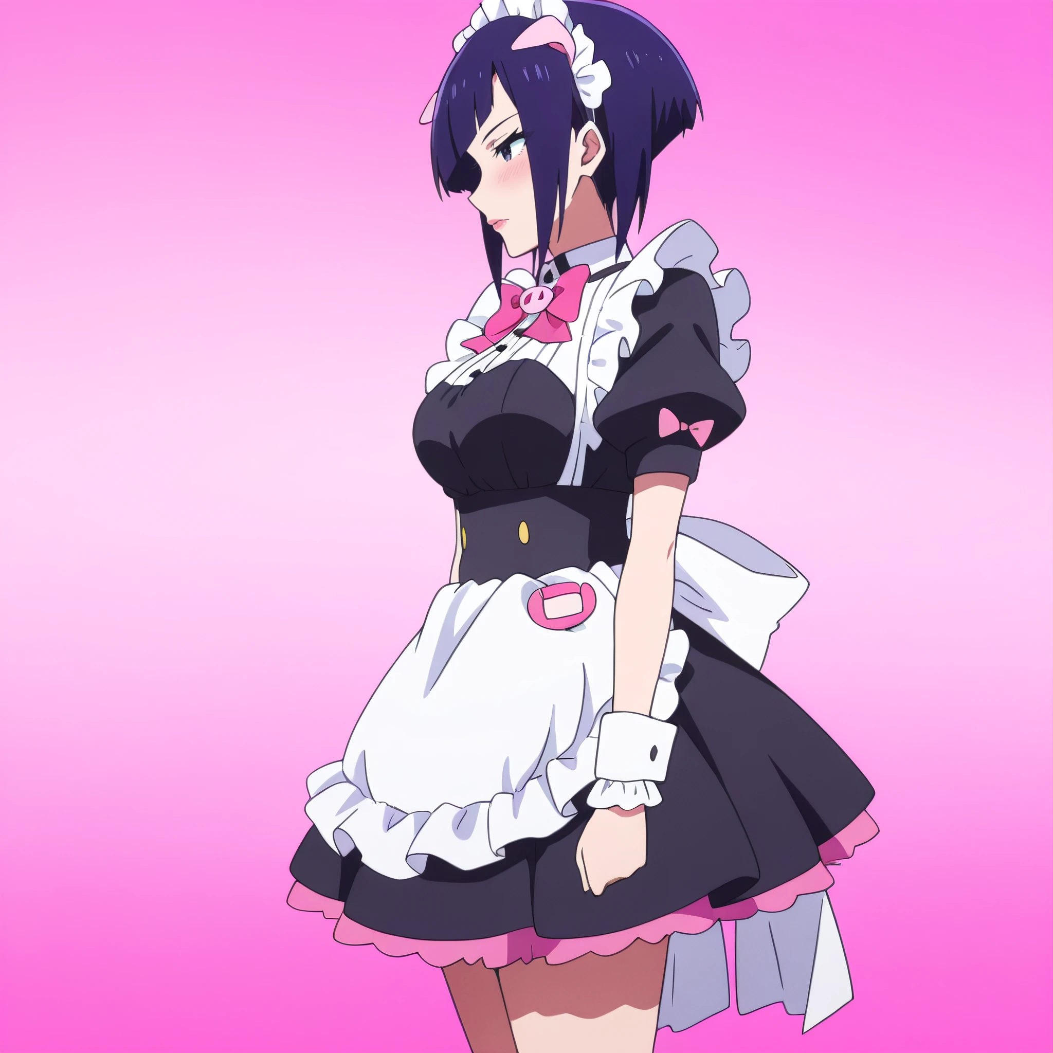 RankoMaid, maid, maid headdress, bow, apron, maid apron, enmaided, frills, pink bow, puffy sleeves, white apron, bowtie, dress, short sleeves, pink bowtie, wrist cuffs,