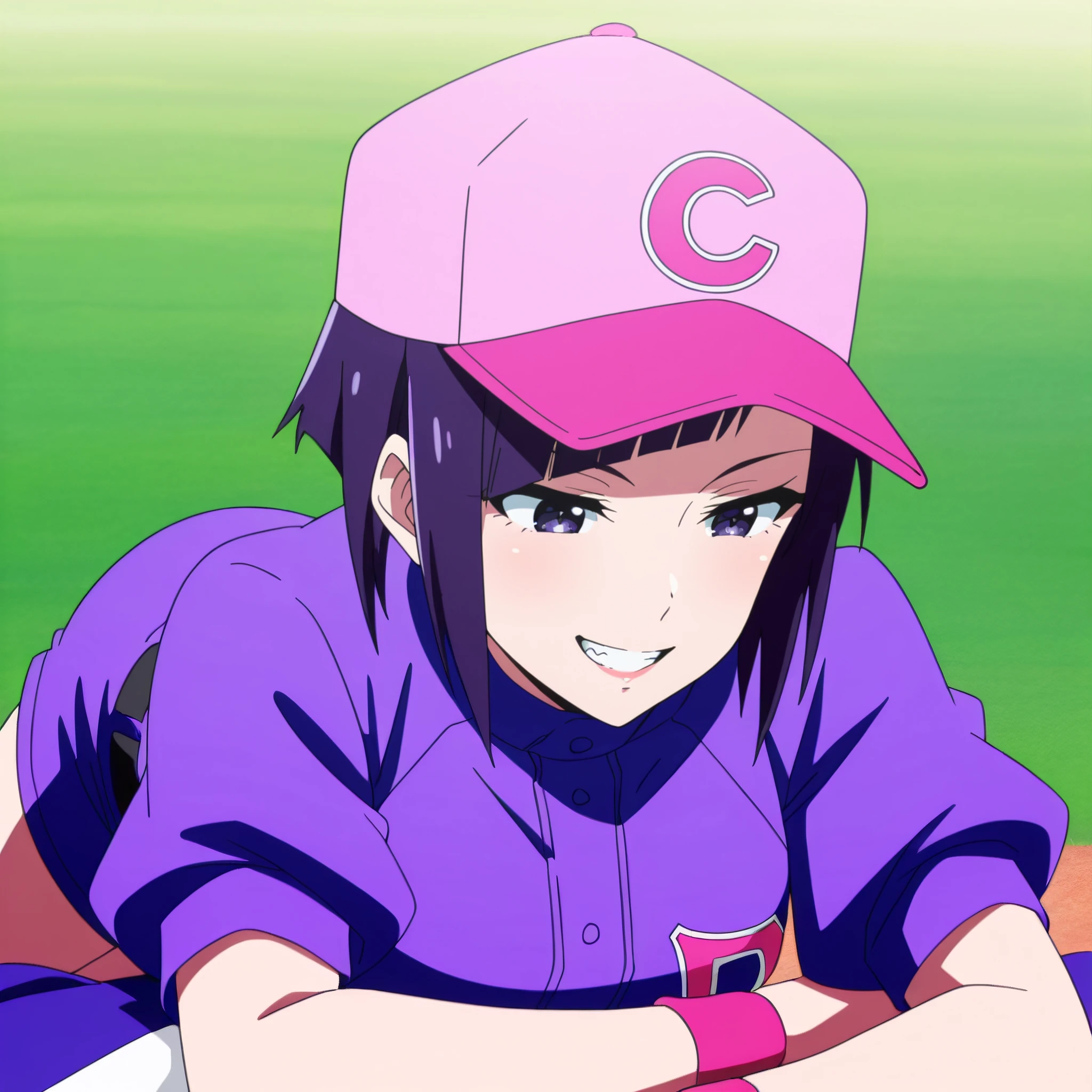 RankoBaseball, hat, short sleeves, puffy sleeves, belt, purple skirt, purple shirt, pink headwear, shirt,