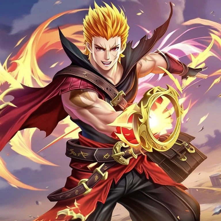 Valir(mlbb)orange yellow hairred colour eyescapeloose fitting brown pantsmid calf bootsscar on right side of face