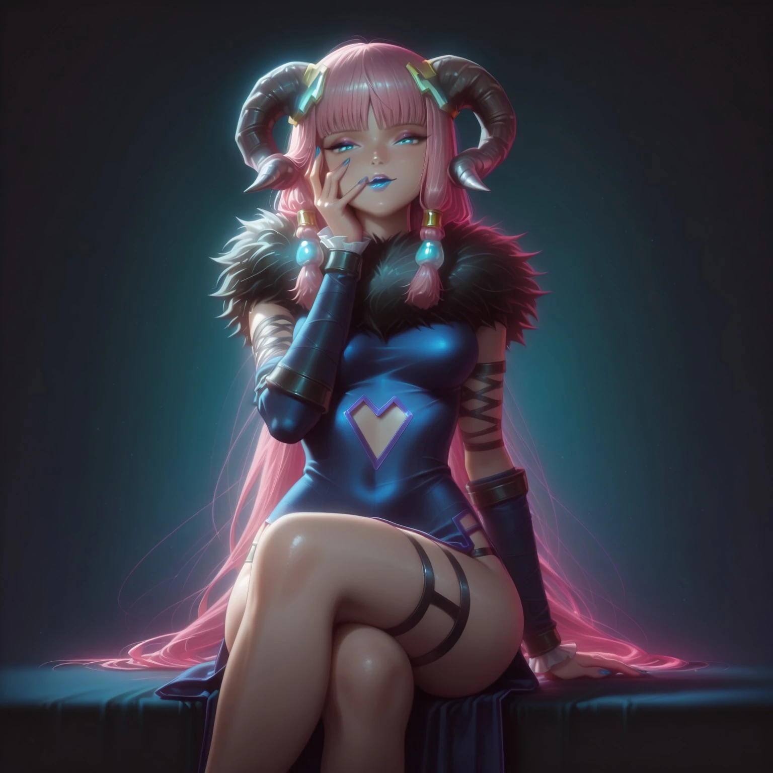 Chalis, blue eyes, blue lipstick, pink hair, blunt bangs, long hair, horns, hair ornament, hair tubes,