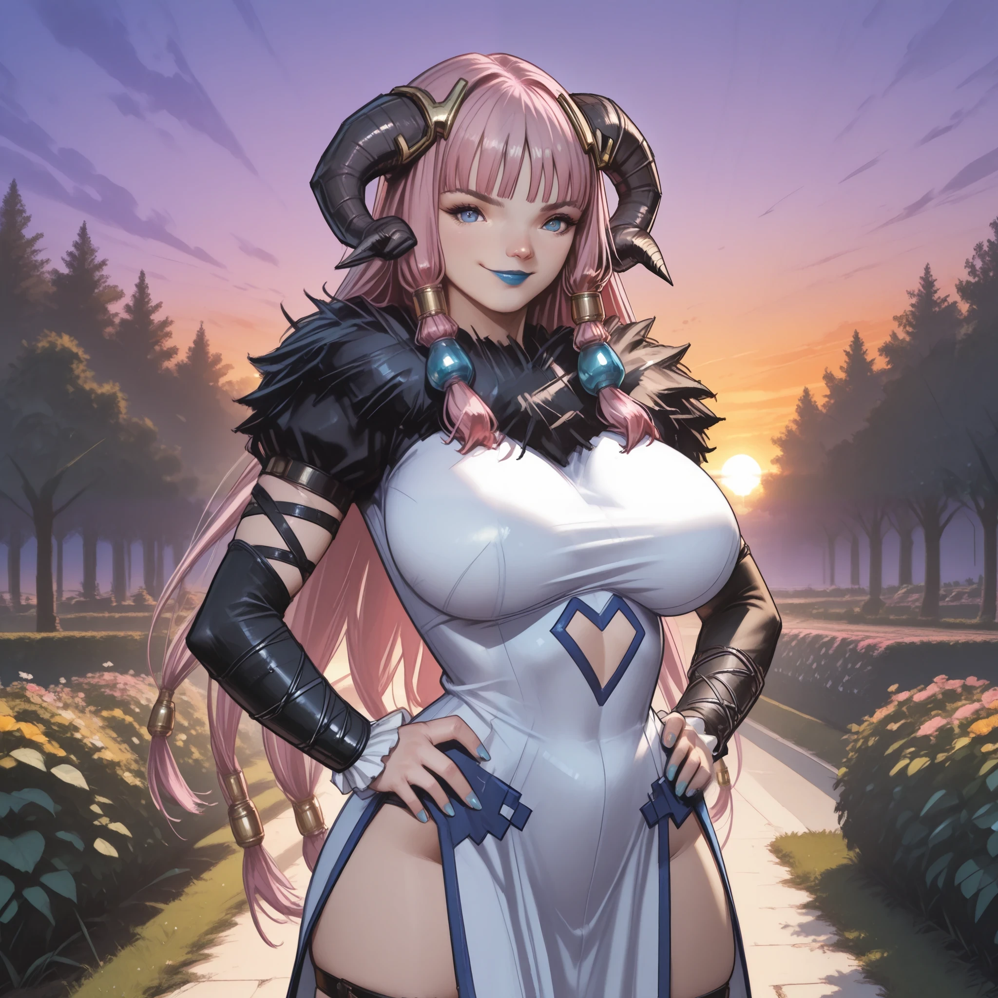 Trigger words: Chalis, blue eyes, blue lipstick, pink hair, blunt bangs, long hair, horns, hair ornament, hair tubes,