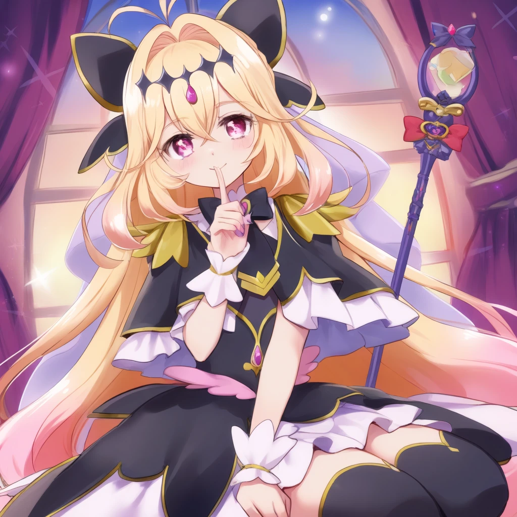 for better consistency effect, it is recommended to use prompt words:moria_luluka,1girl, antenna hair, black bow, black capelet, black dress, blonde hair, bow, brooch, capelet, crossed bangs, diamond hairband, dot nose, dress, frills, gradient hair, hair intakes, heart, heart brooch, heart in eye,jewelry, long hair, magical girl, multicolored hair, pink hair, purple eyes, purple veil, symbol in eye, tear arcana rod, upper body, veil