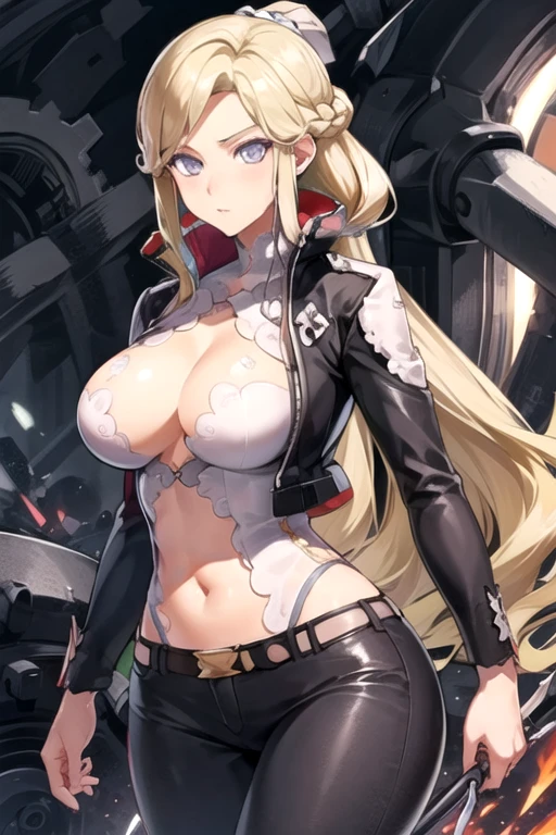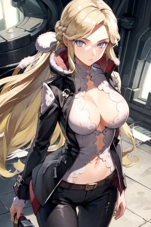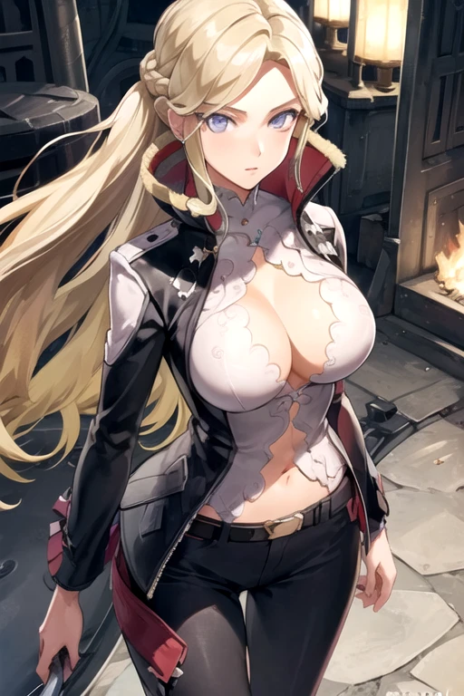HildaHenriquez, 1girl, solo, very long hair, blue eyes, blonde hair, large breasts, navel, cleavage, jewelry, purple eyes, jacket, braid, glasses, belt, black pants, clothing cutout, wavy hair,