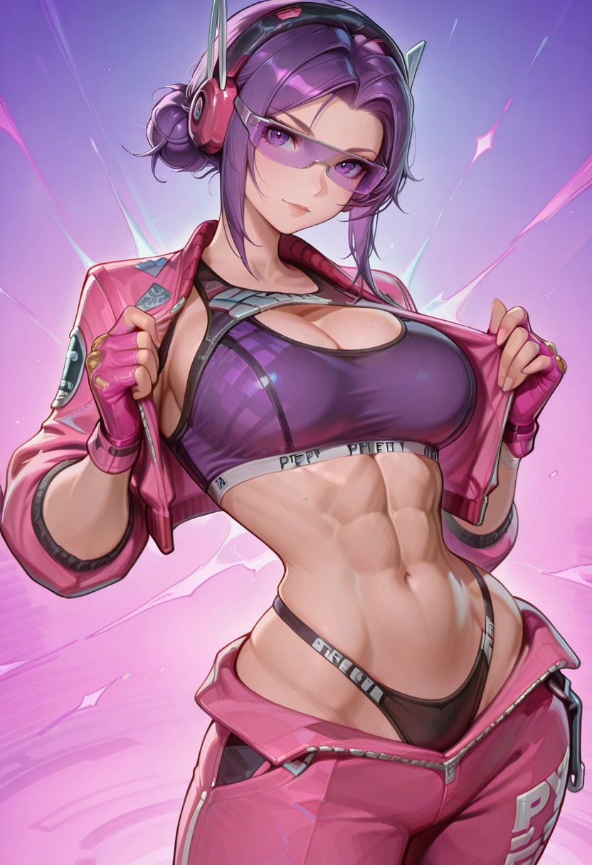 psyformula, 1girl, breasts, purple hair, solo, navel, gloves, abs, headphones, jacket, fingerless gloves, toned, sports bra, looking at viewer, black underwear, ((purple tinted eyewear)), cleavage, sunglasses, open clothes, black panties, lips, highleg, smile, pants, hair bun,