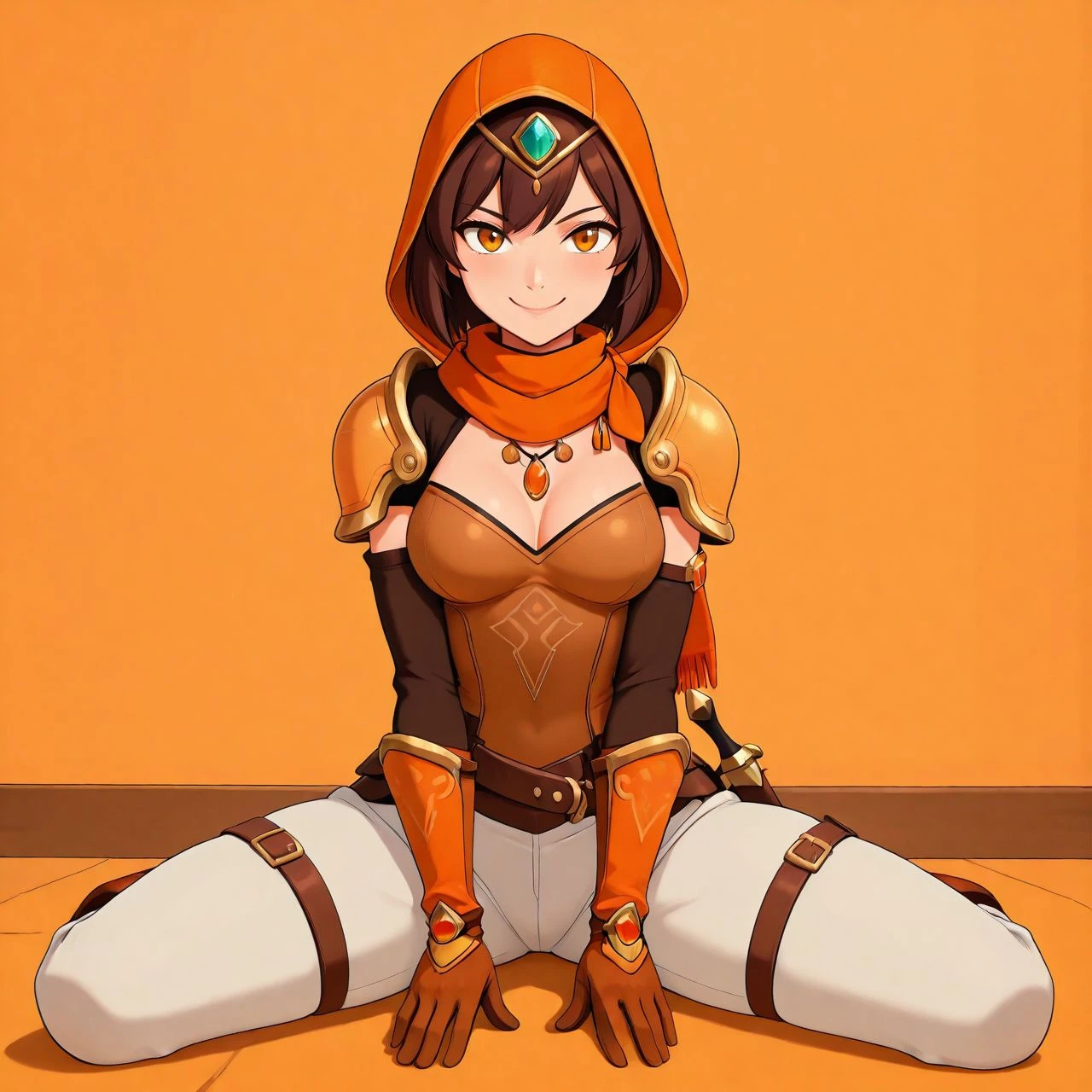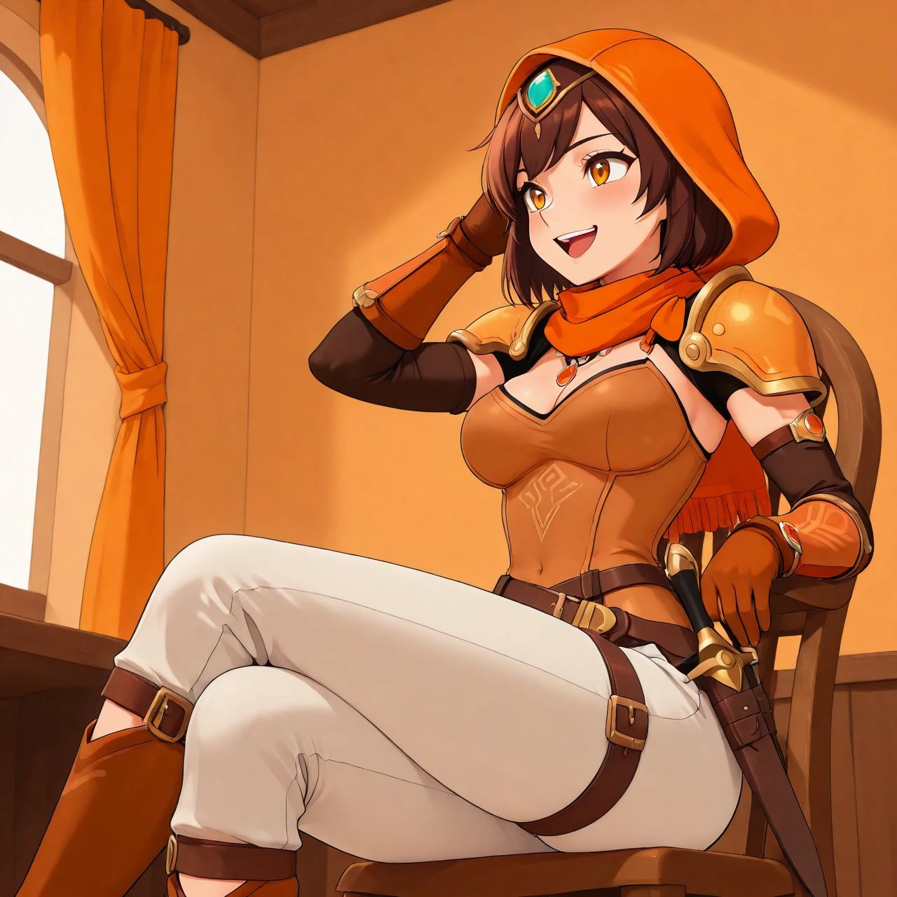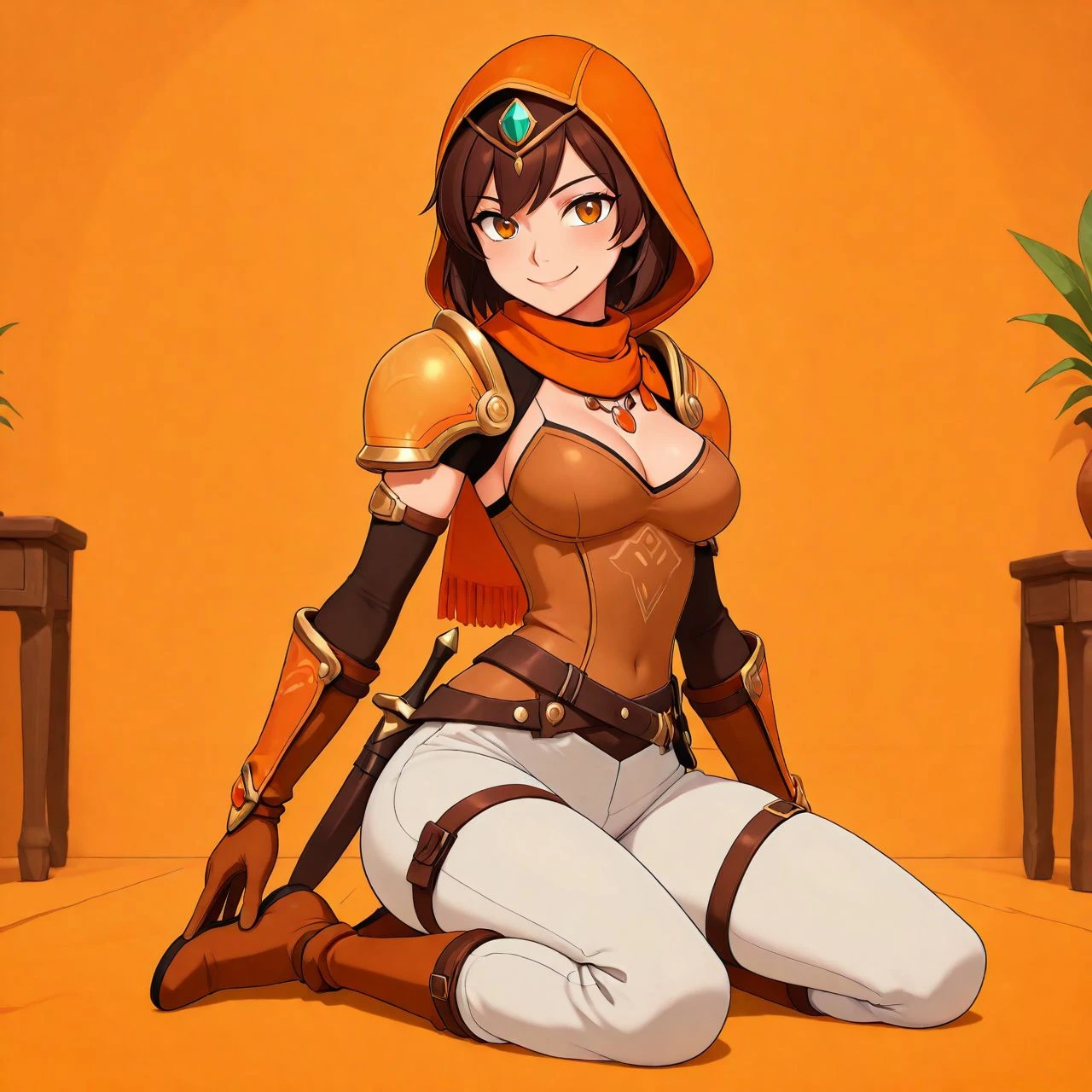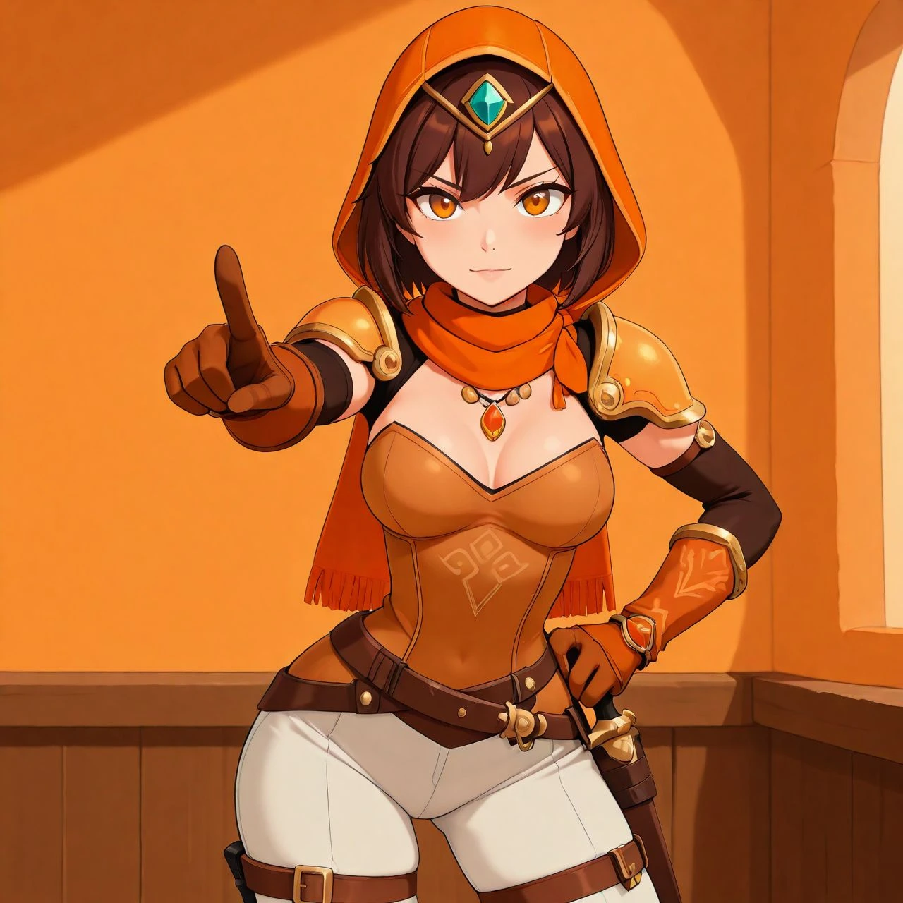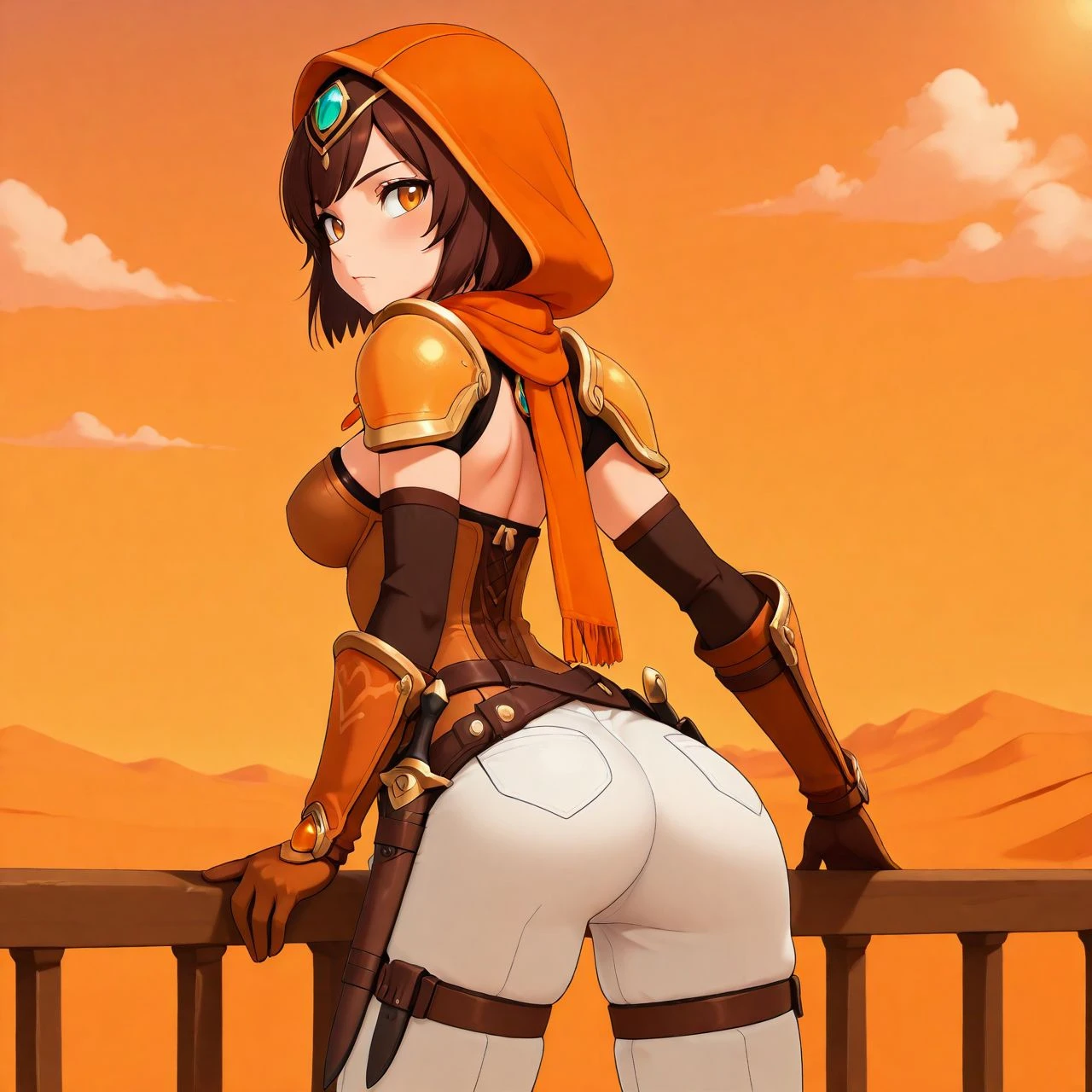 orlaya_oc, thief desert woman, orange light armor, white pants, scarf, dagger at hip, brown short hair, orange eyes, belt, leg straps, leather boots,