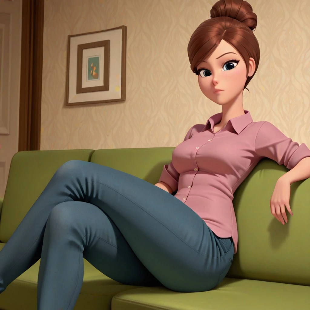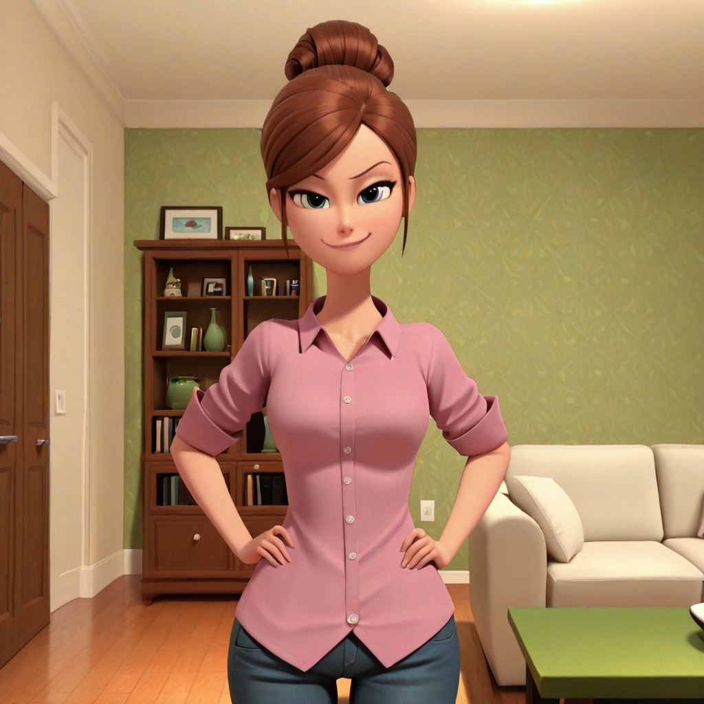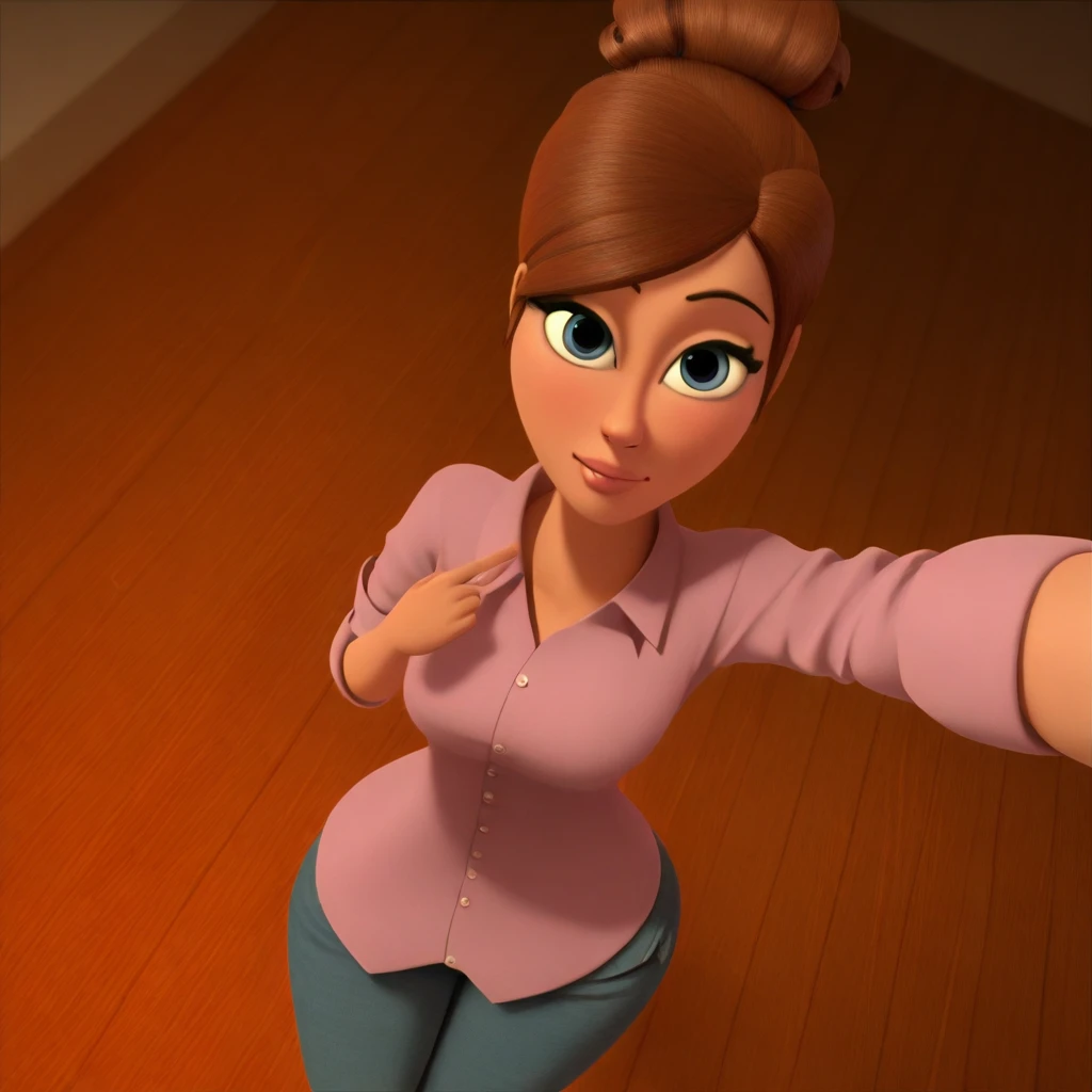 janice_bb, brown hair, single hair bun, blue eyes, collared shirt, jeans