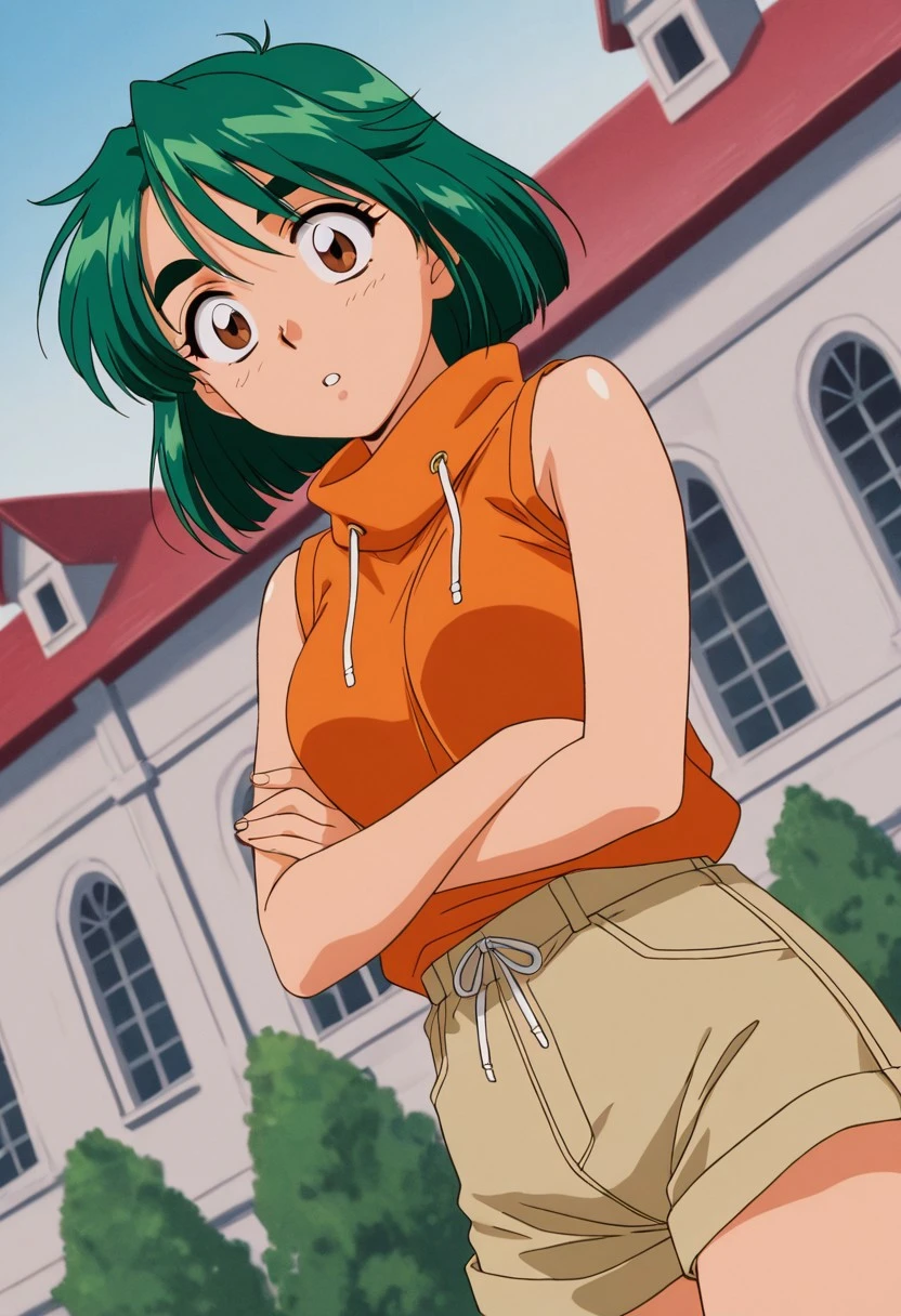 Outfit 06 (Summer Camp): sleeveless, orange sweatshirt with high neck and adjustable drawstring, light brown shorts,