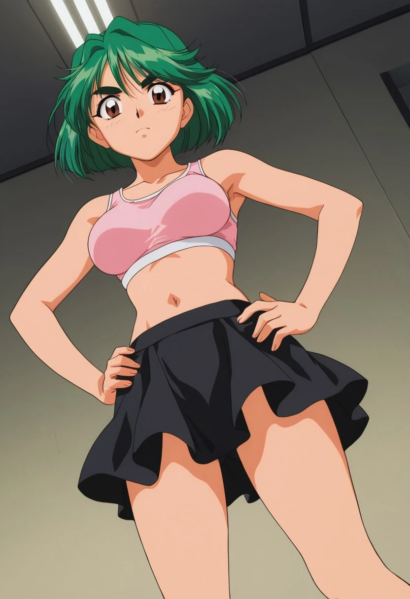 Outfit 04 (Summer Camp): light pink sleeveless sports bra, navel, short black skirt,