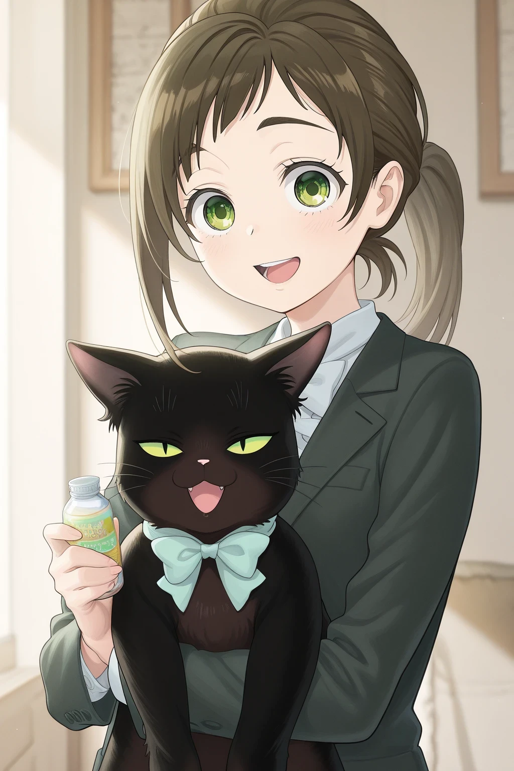 masterpiece, best quality, amazing quality, groupimg, SakuFuz, SakuHair, SakuFormal, indoors, holding, smile, BREAK, SakuCat, small size cat, furry, being held, black cat, happy, high detail, depth of field
