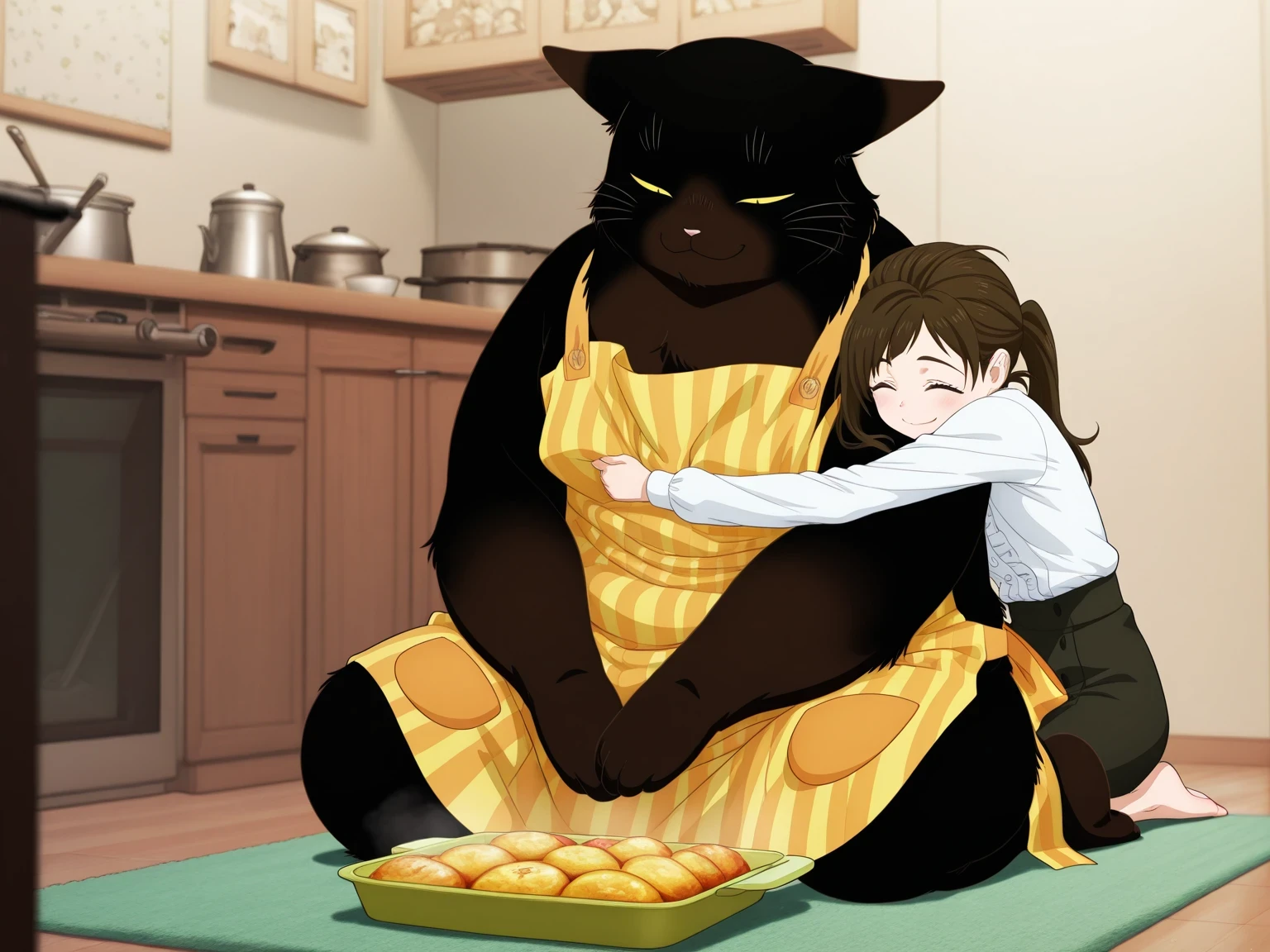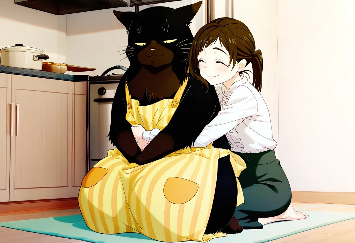masterpiece , best quality , amazing quality groupimg, sakucat, human size cat , 1girl, sakufuz, sakufromal, ponytail, apron, food, sitting, brown hair, skirt, seiza, smile, indoors, hugging long hair,BREAK, sakucat, sakucatapron ,happy, sitting, at home, high detail, depth of field, nice perspective shot