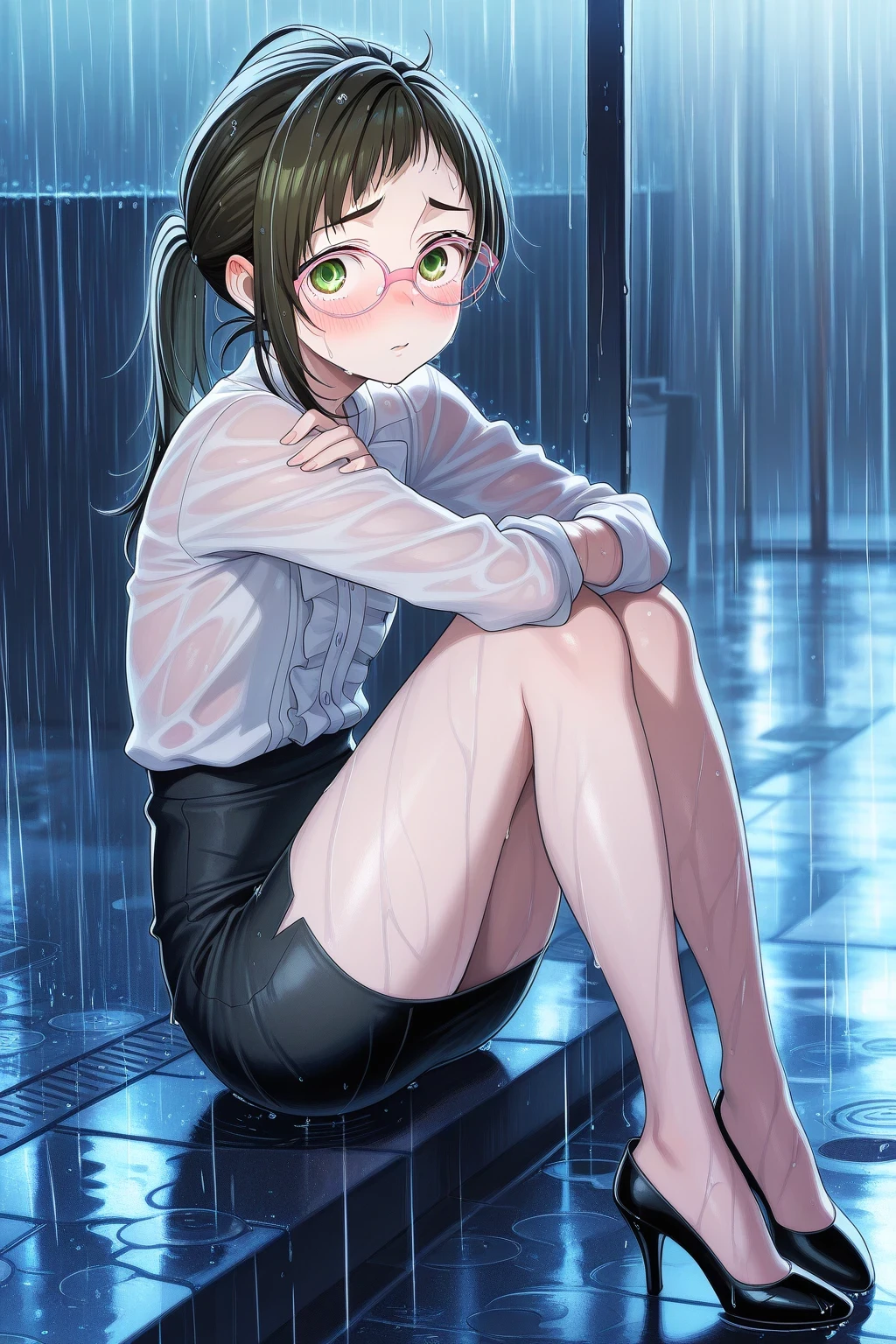 masterpiece, best quality, amazing quality, SakuFuz, SakuHair, SakuFormal, 1girl, green eyes, white shirt, pencil skirt, black footwear, high heels, pink glasses, indoors, sitting, looking at viewer, blush, high detail, depth of field