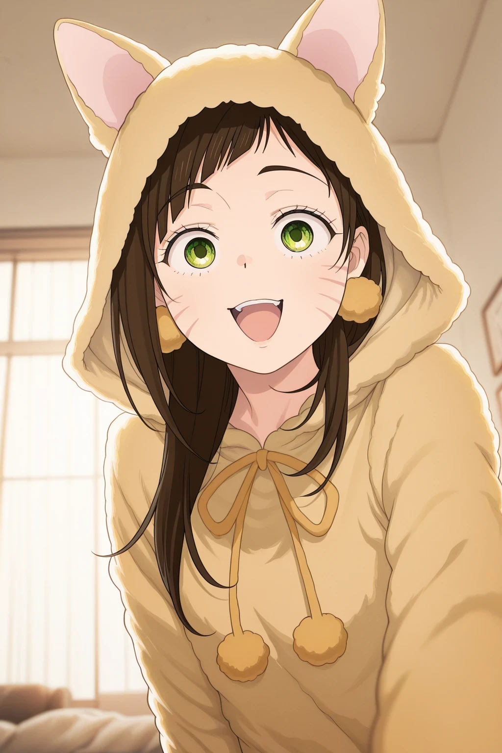 masterpiece, best quality, amazing quality, SakuFuz, SakuHair, SakuCuiteHoody, animal ears, catmakeup, fluffy earrings, whisker markings, green eyes, brown hair, indoors, upper body, open mouth, happy, high detail, depth of field