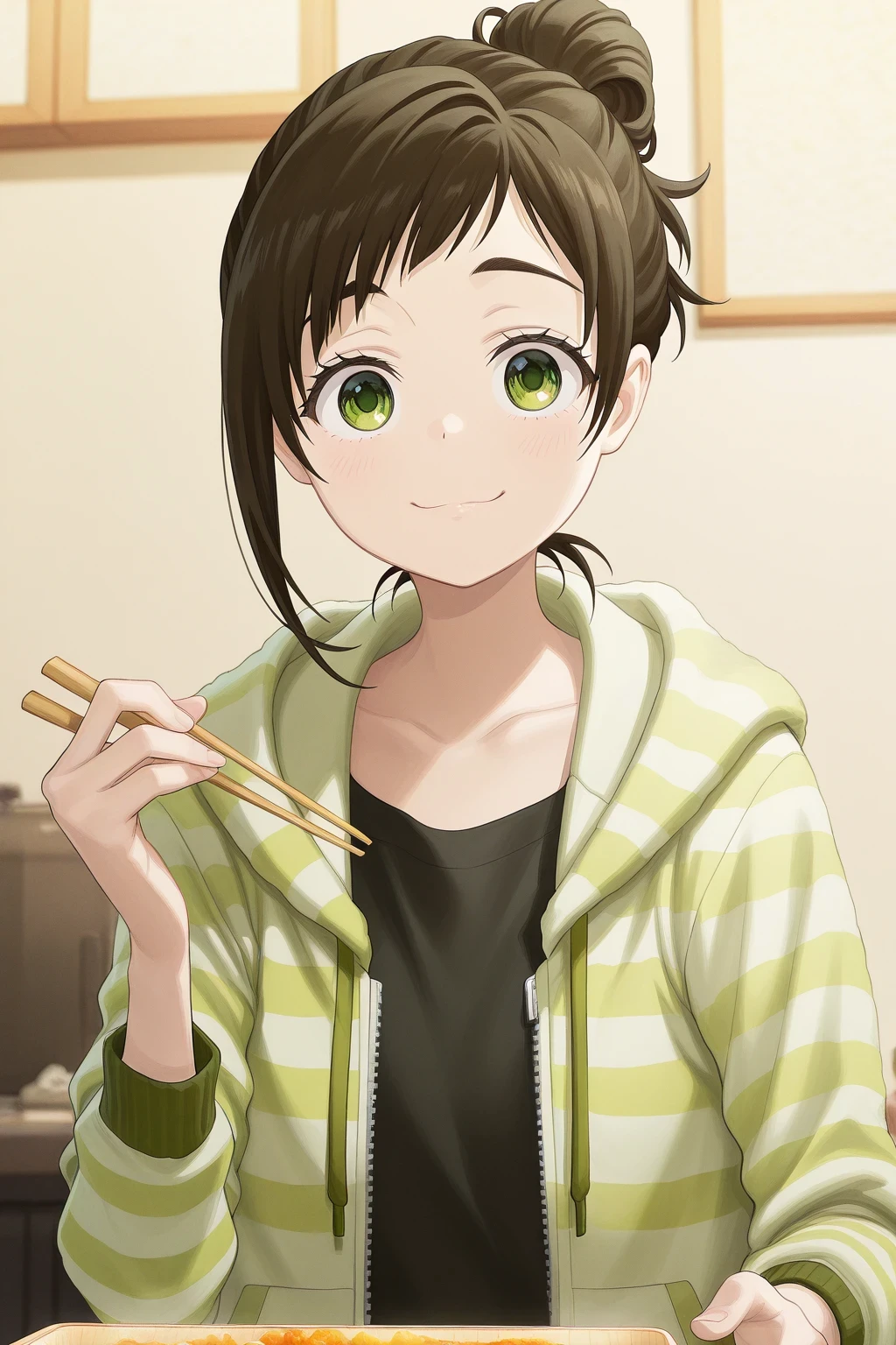 masterpiece, best quality, amazing quality, SakuFuz, SakuHair, SakuHomie, striped hoodie, shorts, thighhighs, 1girl, solo, lying on bed, green eyes, black shirt, hair bun, happy, indoors, high detail, depth of field
