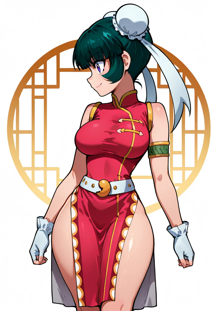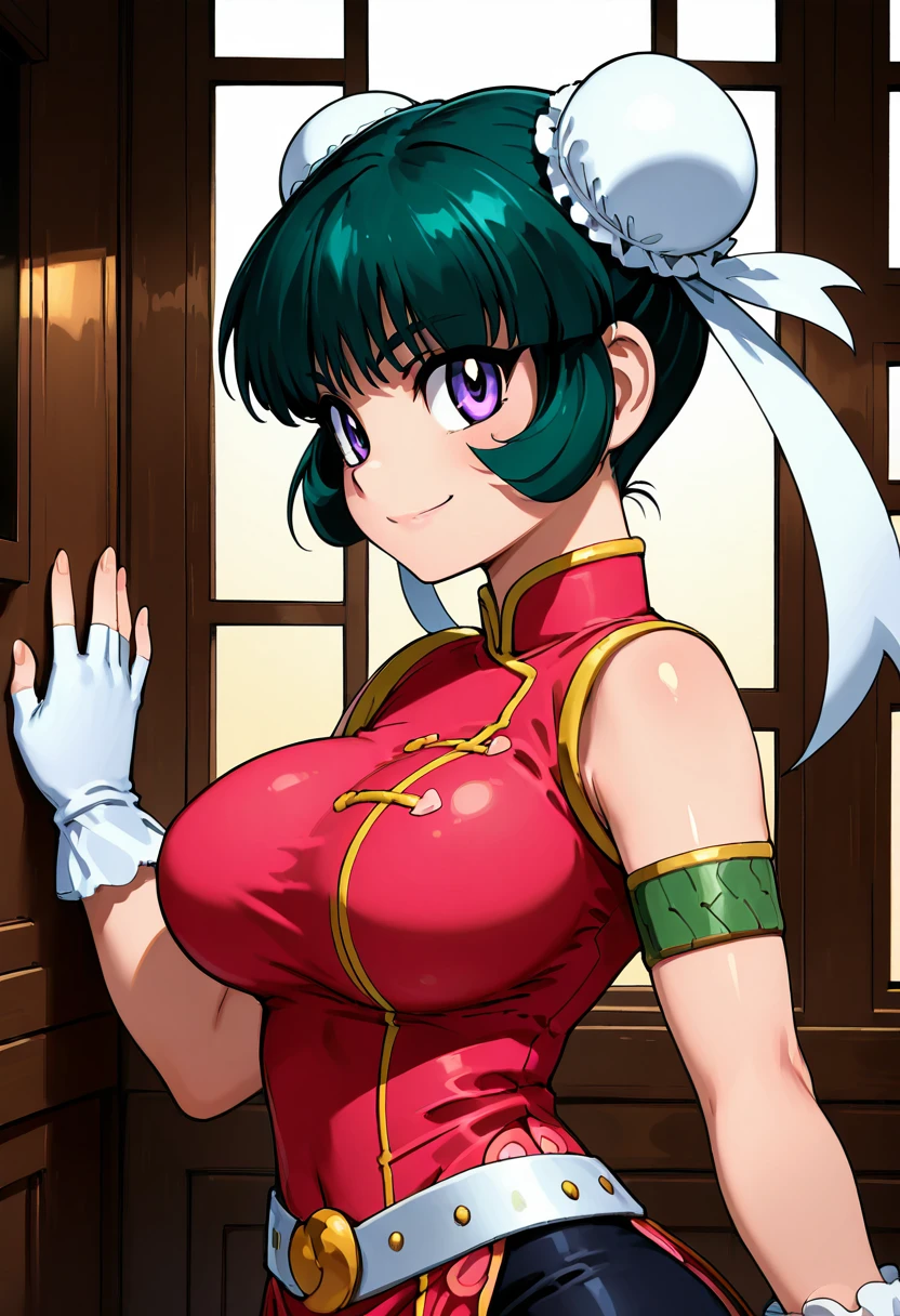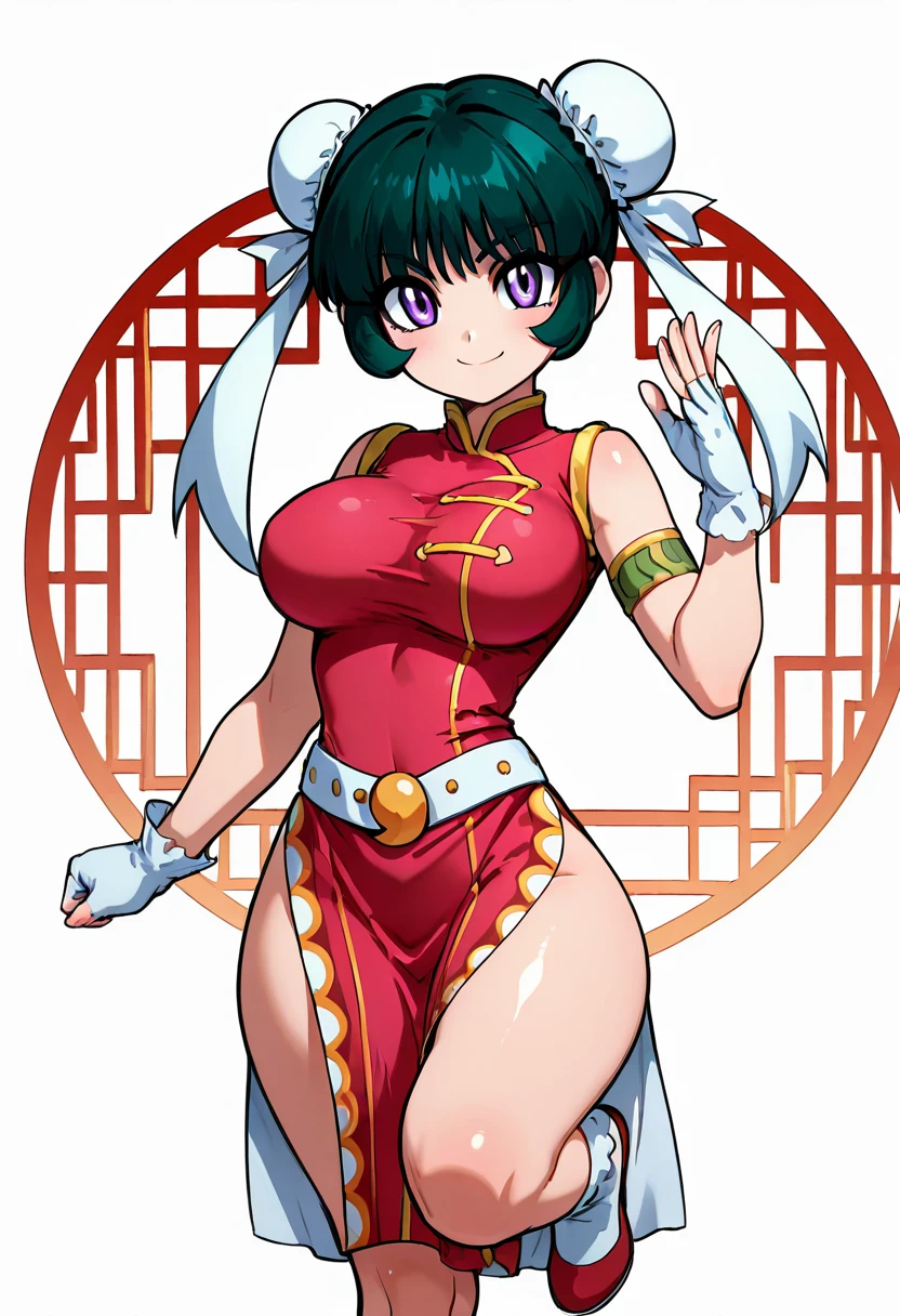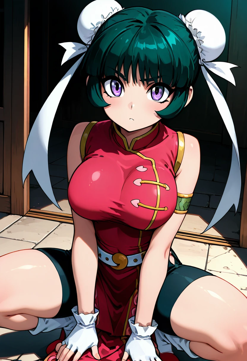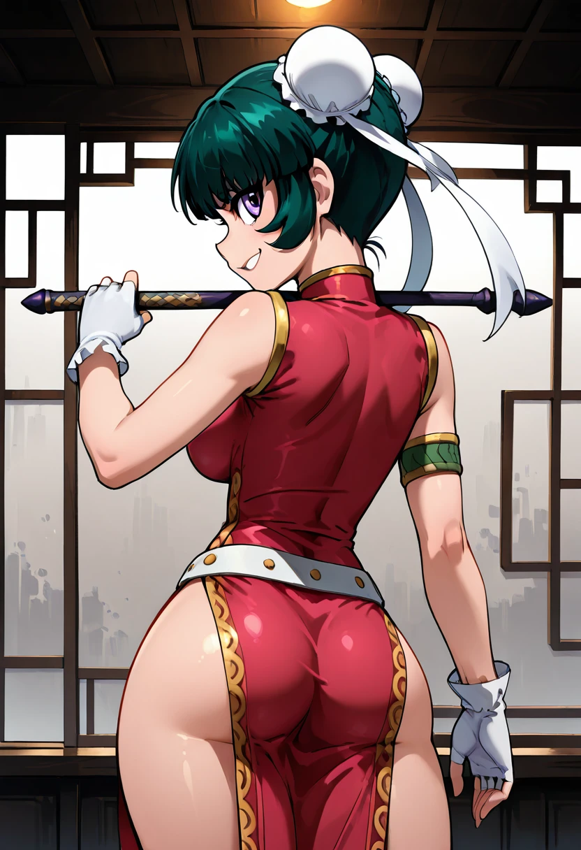 zzMeiMei, 1girl, purple eyes, green hair, hair bun, bun cover, chinese clothes, pink china dress, fingerless gloves,