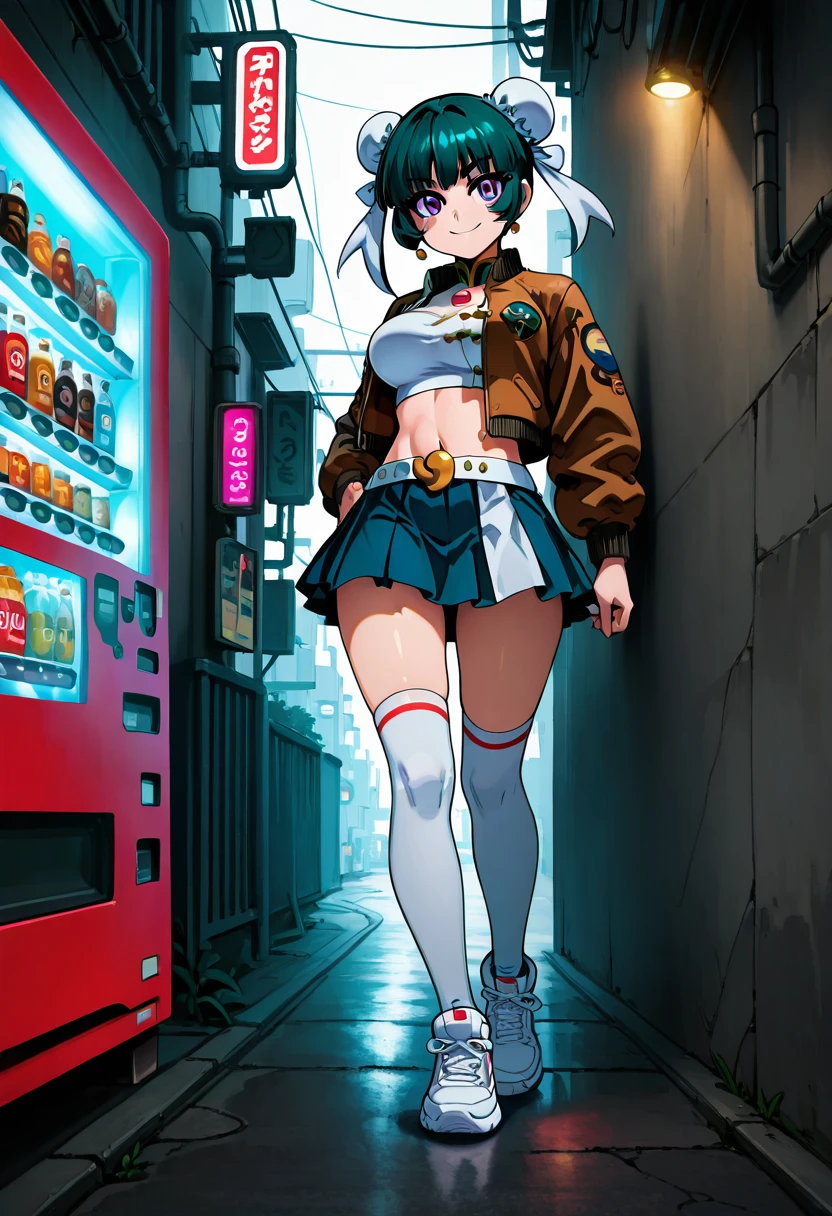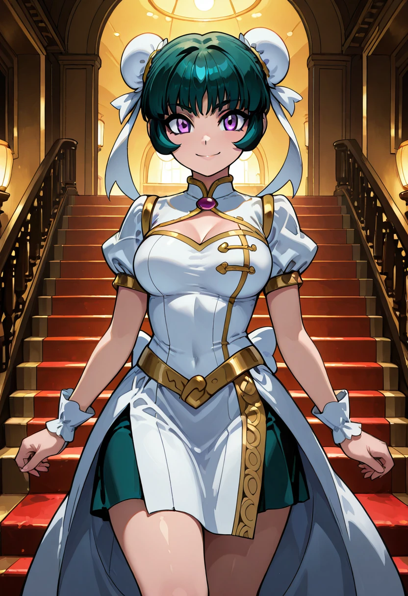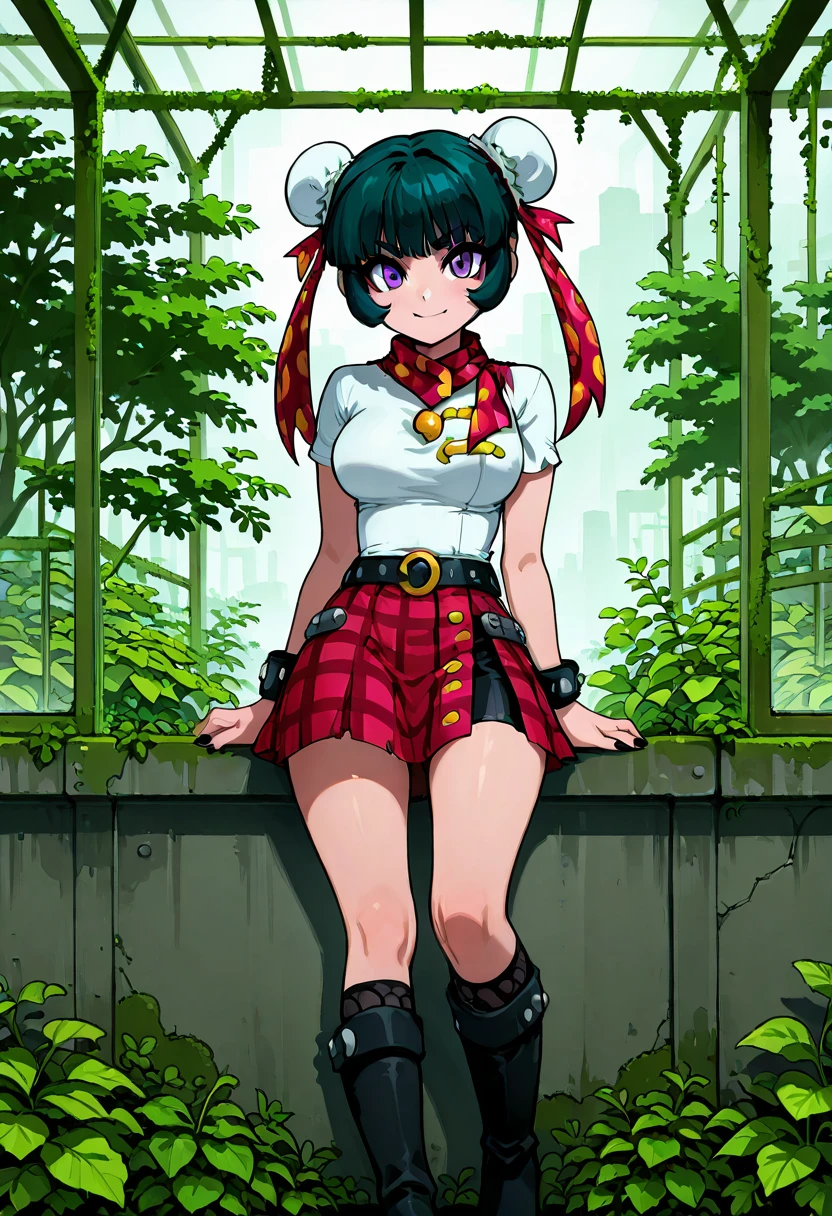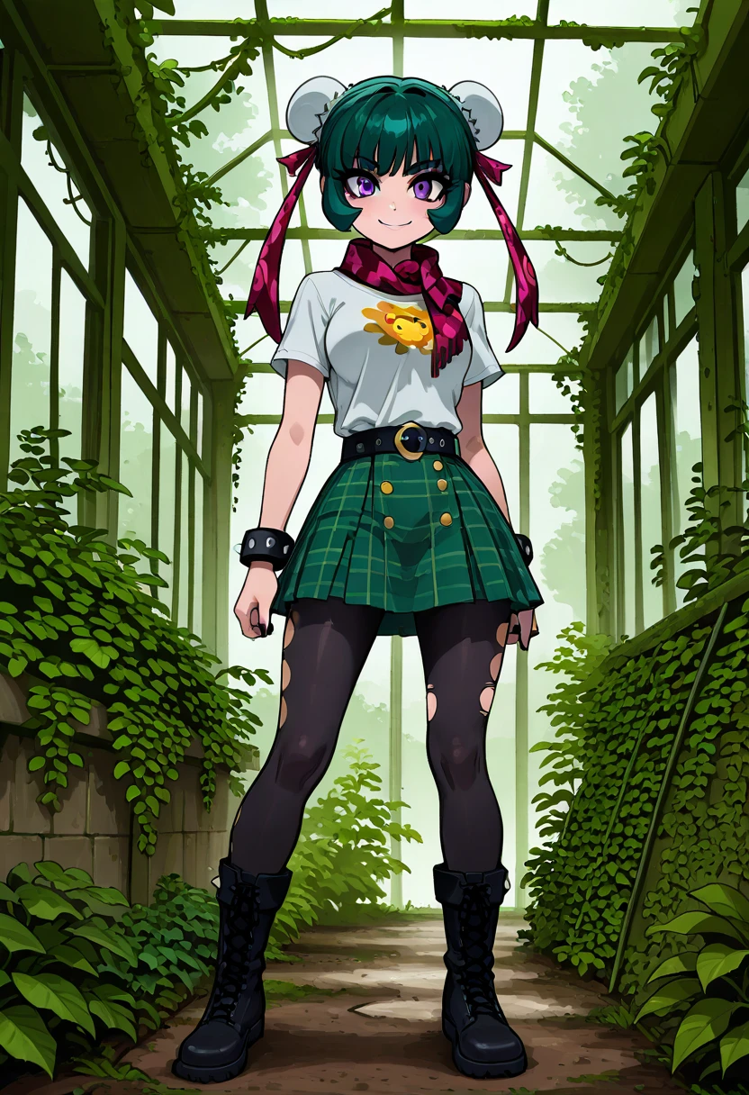 zzMeiMei, 1girl, purple eyes, green hair, hair bun, bun cover,