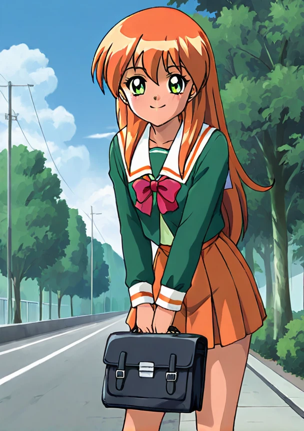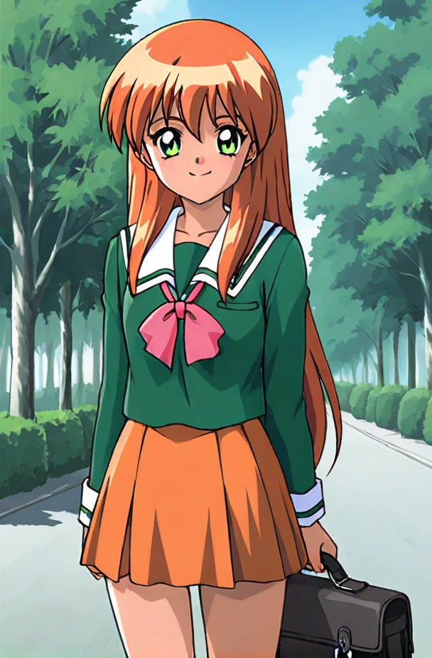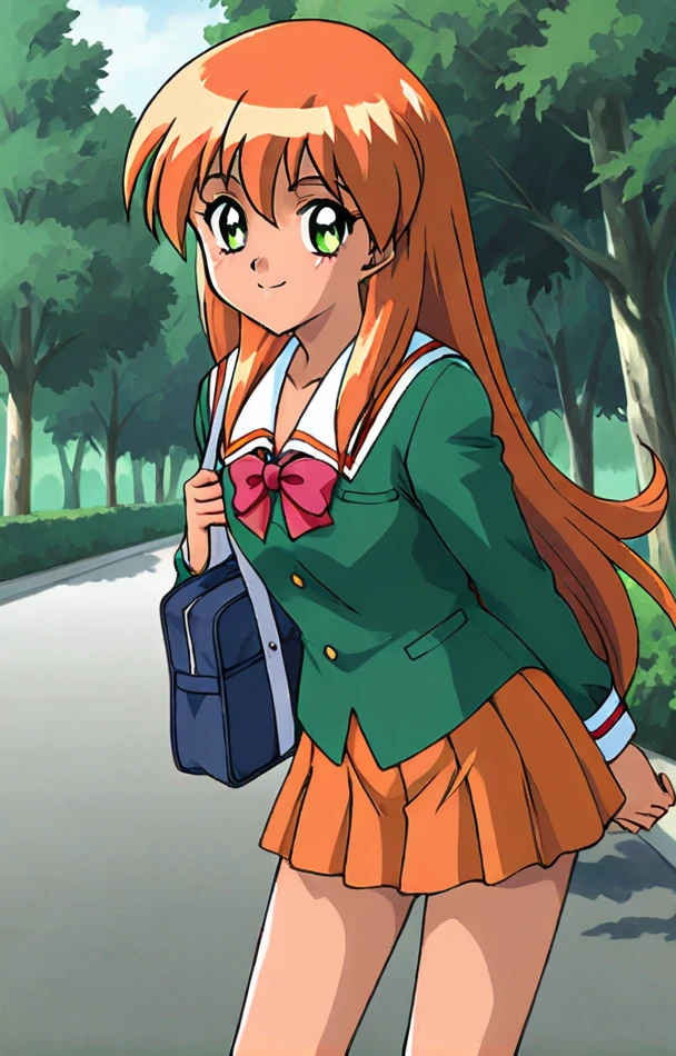 <lora:Homura Akai_Tokimeki_Memorial 2 v1:0.8>Homura Akai,1girl, solo, green eyes, long hair, orange hair, smile, retro artstyle