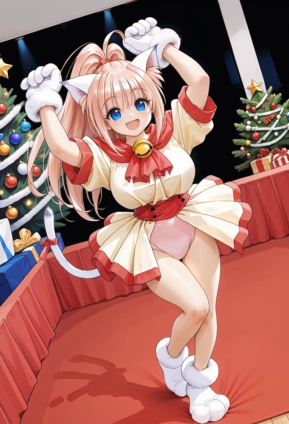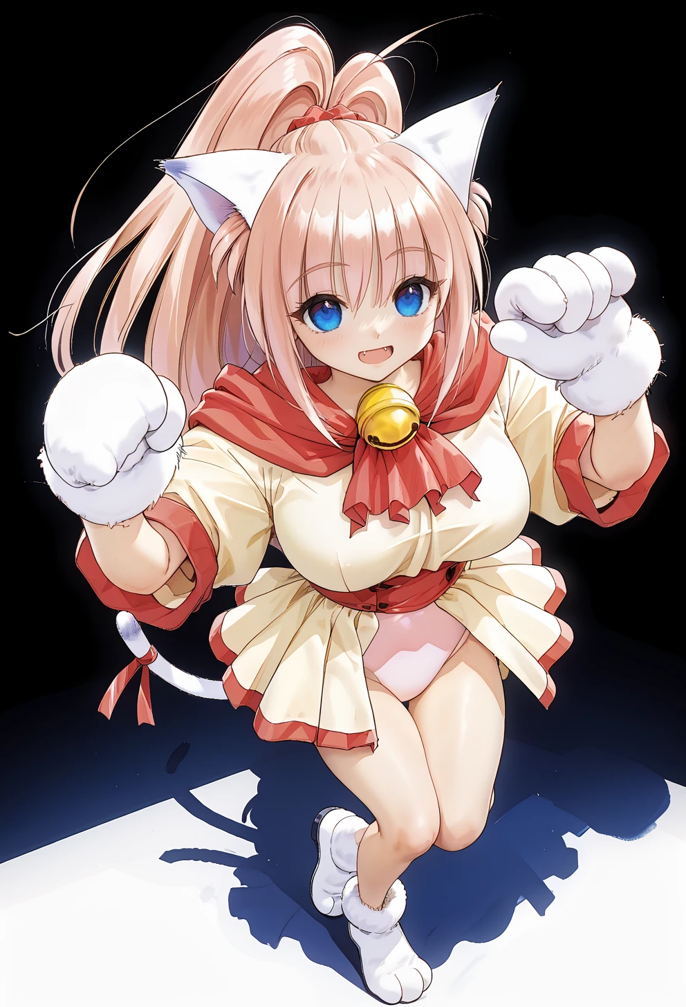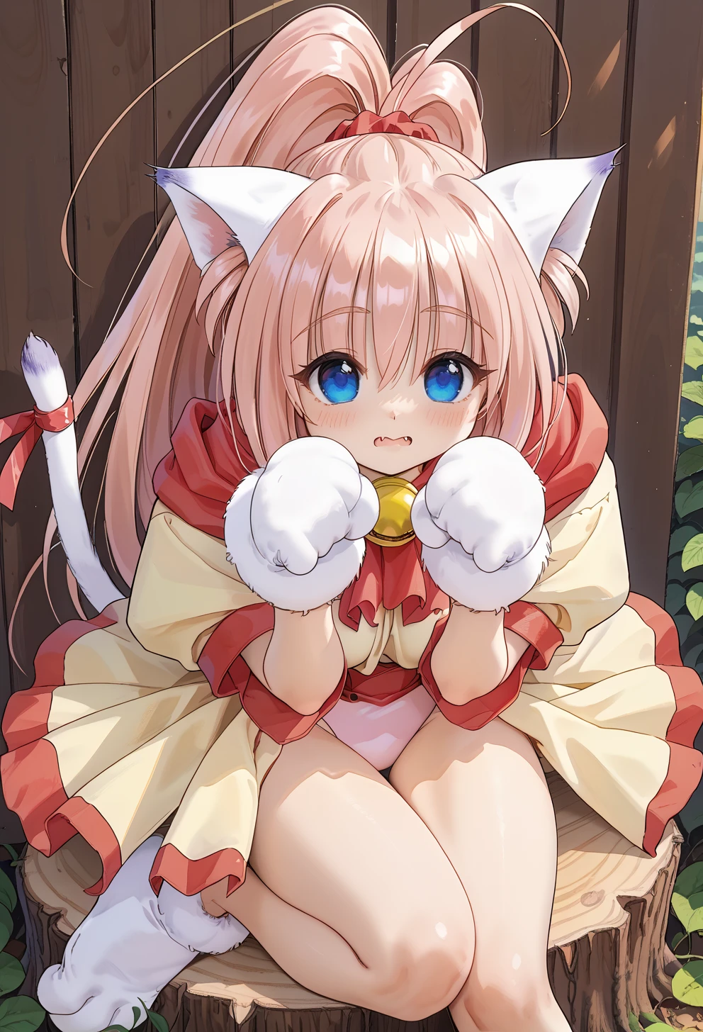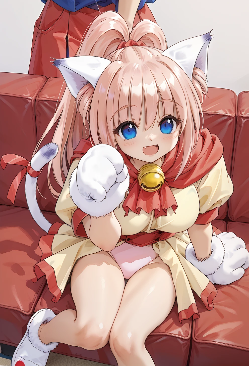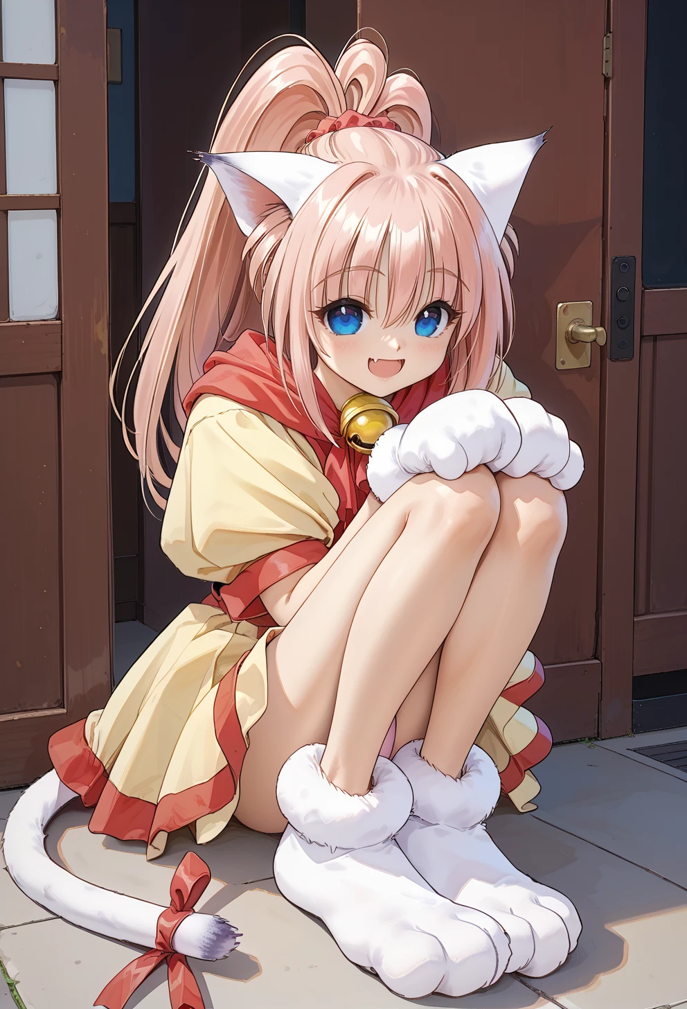 red scrunchie, red scarf, neck bell, yellow dress, red sash, yellow skirt, pink leotard, cat tail, tail ribbon, paw shoesNegative Word: