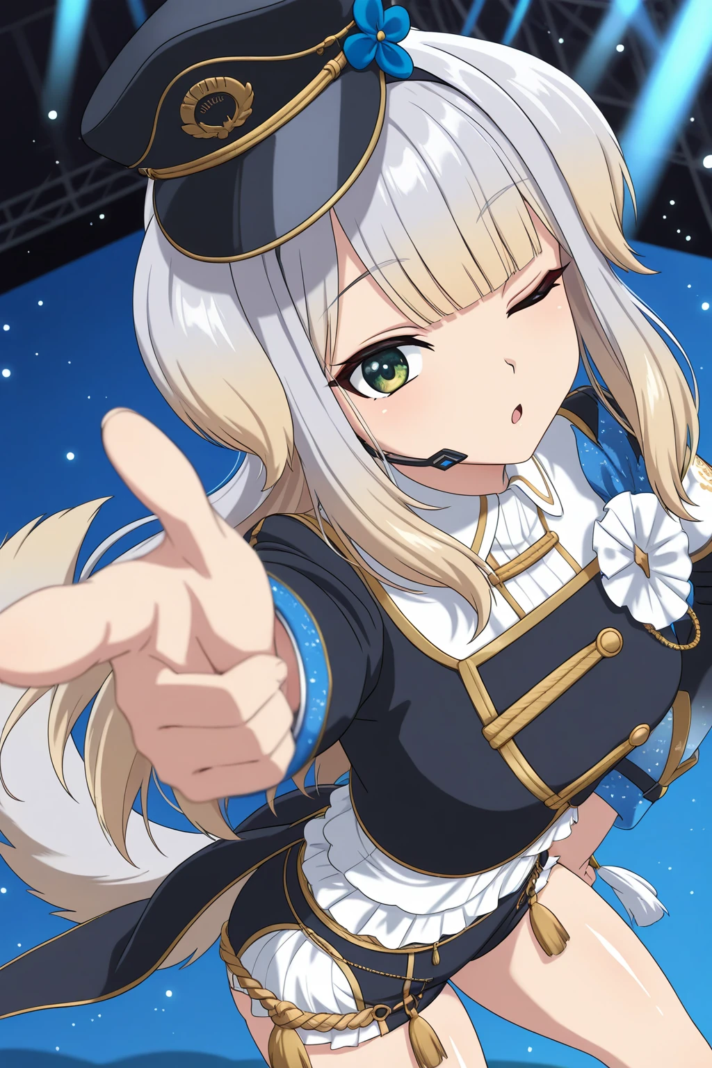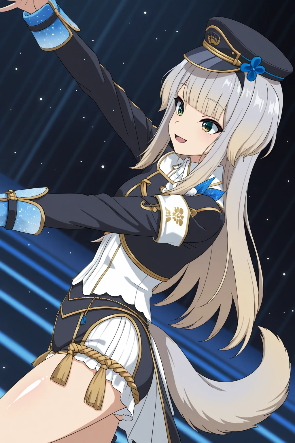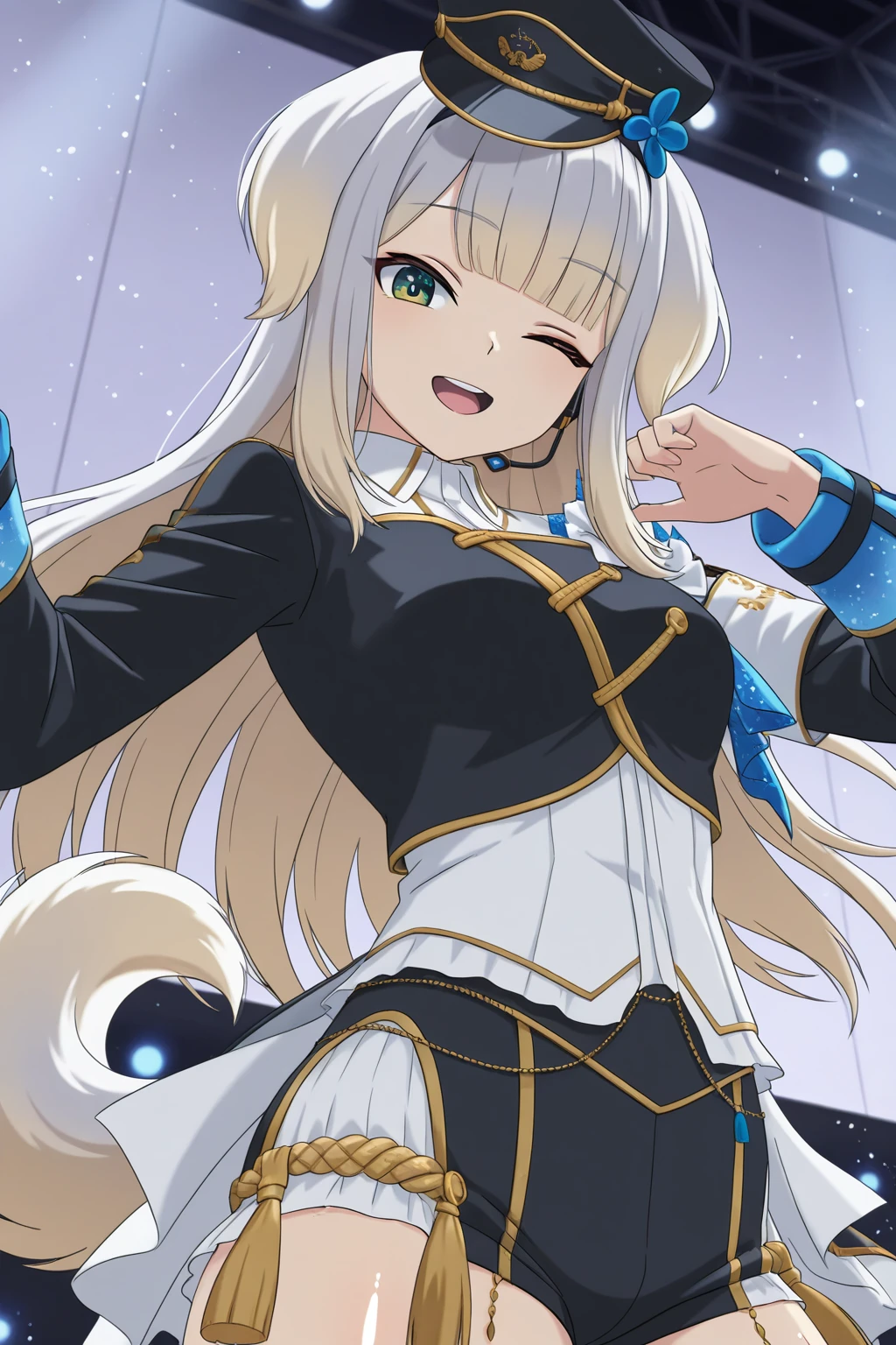 SRNJ, dog ears, long hair, light grey hair, gradient hair, blonde hair, blunt bangs, green eyes, gradient eyes, eyelashes, dog tail, peaked cap, hat flower, headset, collared shirt, white shirt, gold trim, black jacket, dress flower, long sleeves, armband, short shorts, two-tone shorts, aiguillette, tassel, thigh strap, knee boots