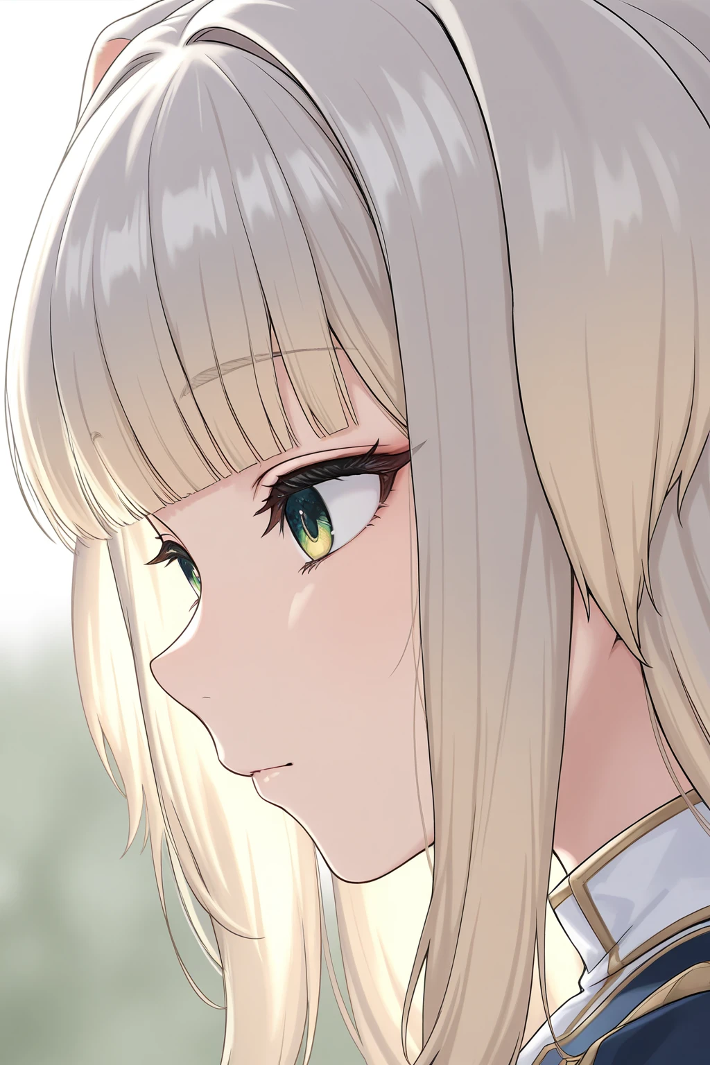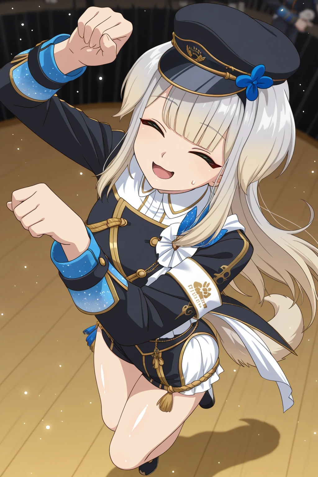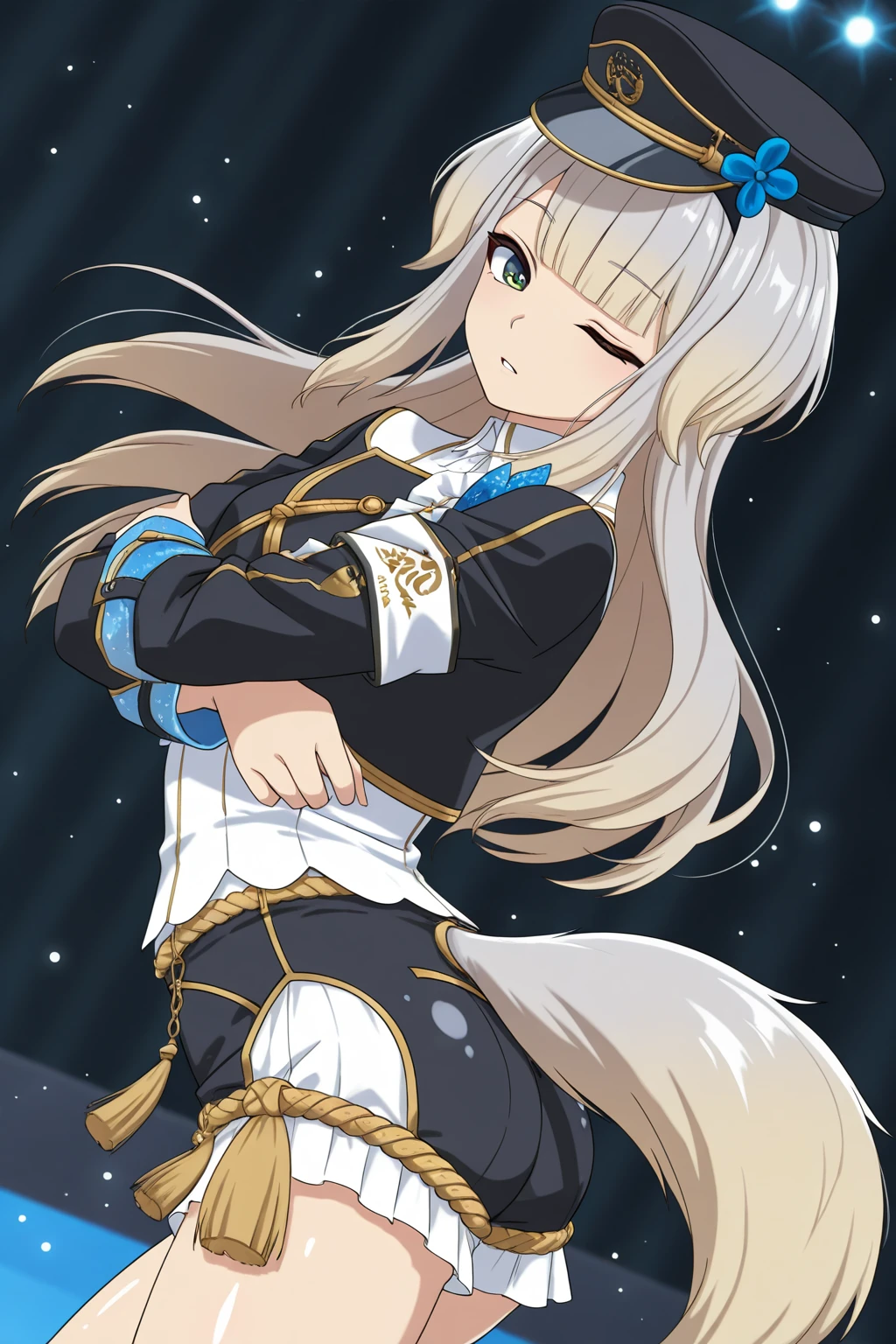 SRNJ, dog ears, long hair, light grey hair, gradient hair, blonde hair, blunt bangs, green eyes, gradient eyes, eyelashes, dog tail, peaked cap, hat flower, headset, collared shirt, white shirt, gold trim, black jacket, dress flower, long sleeves, armband, short shorts, two-tone shorts, aiguillette, tassel, thigh strap, knee boots