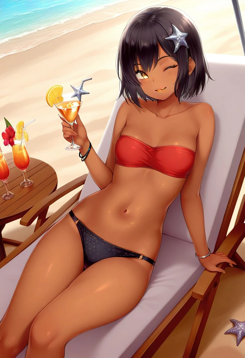 Bikini "Infinity": short hair, red bandeau, bracelet, infin bikini bottom, silver starfish in hair