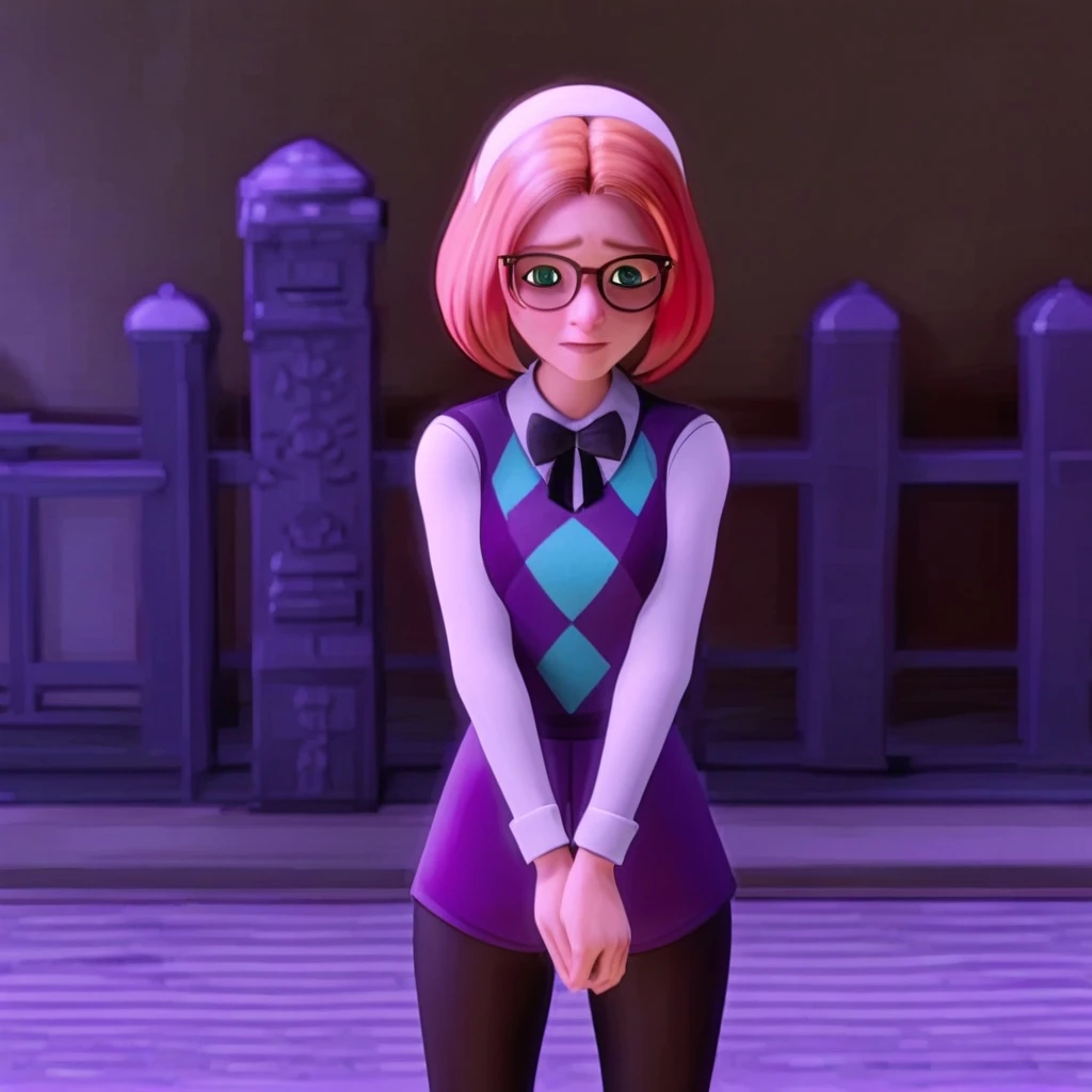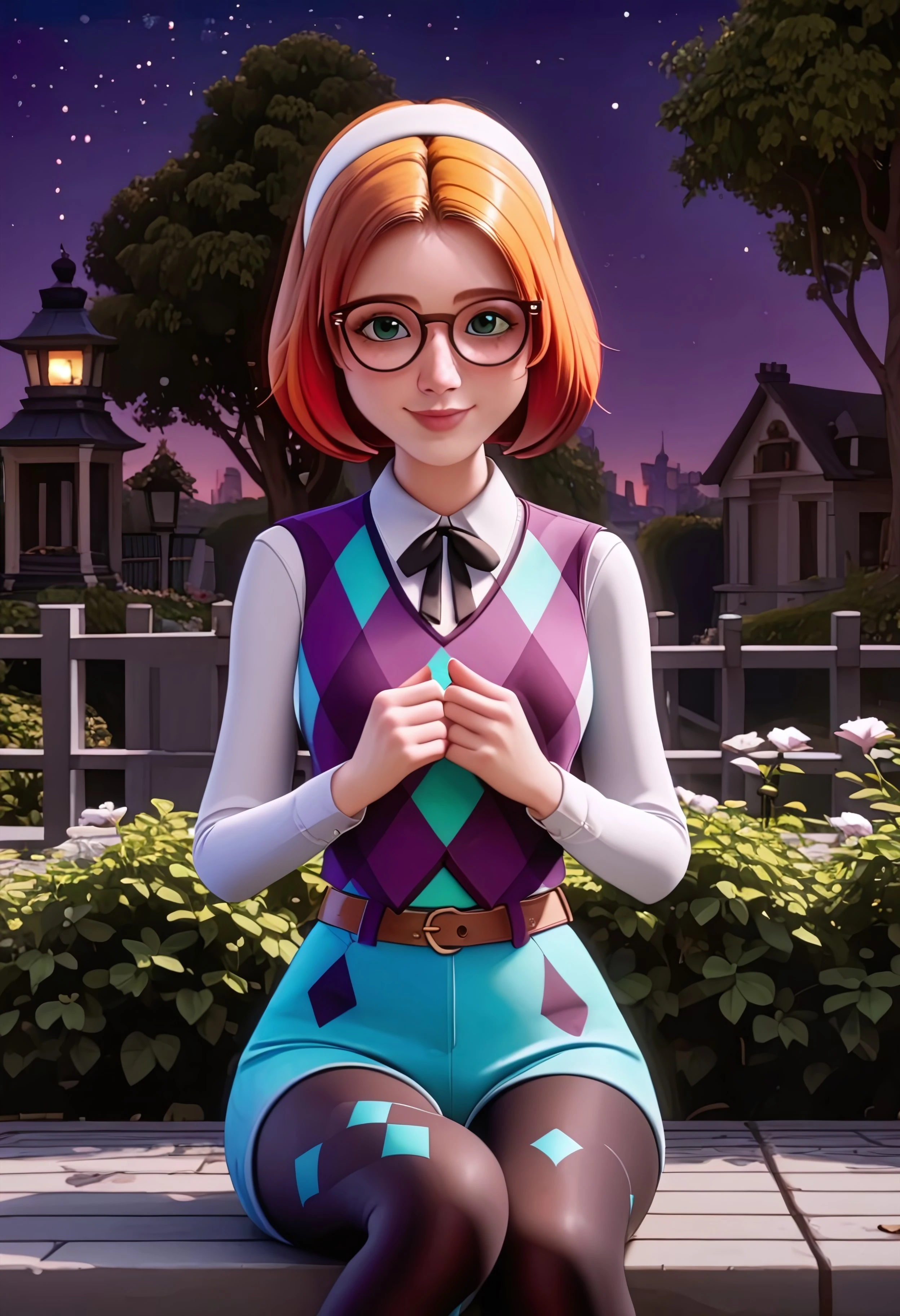 purple vest, teal argyle vest, white dress shirt with long sleeves, black ribbon, light-blue shorts, brown belt, black leggings, argyle leggings, light-blue socks