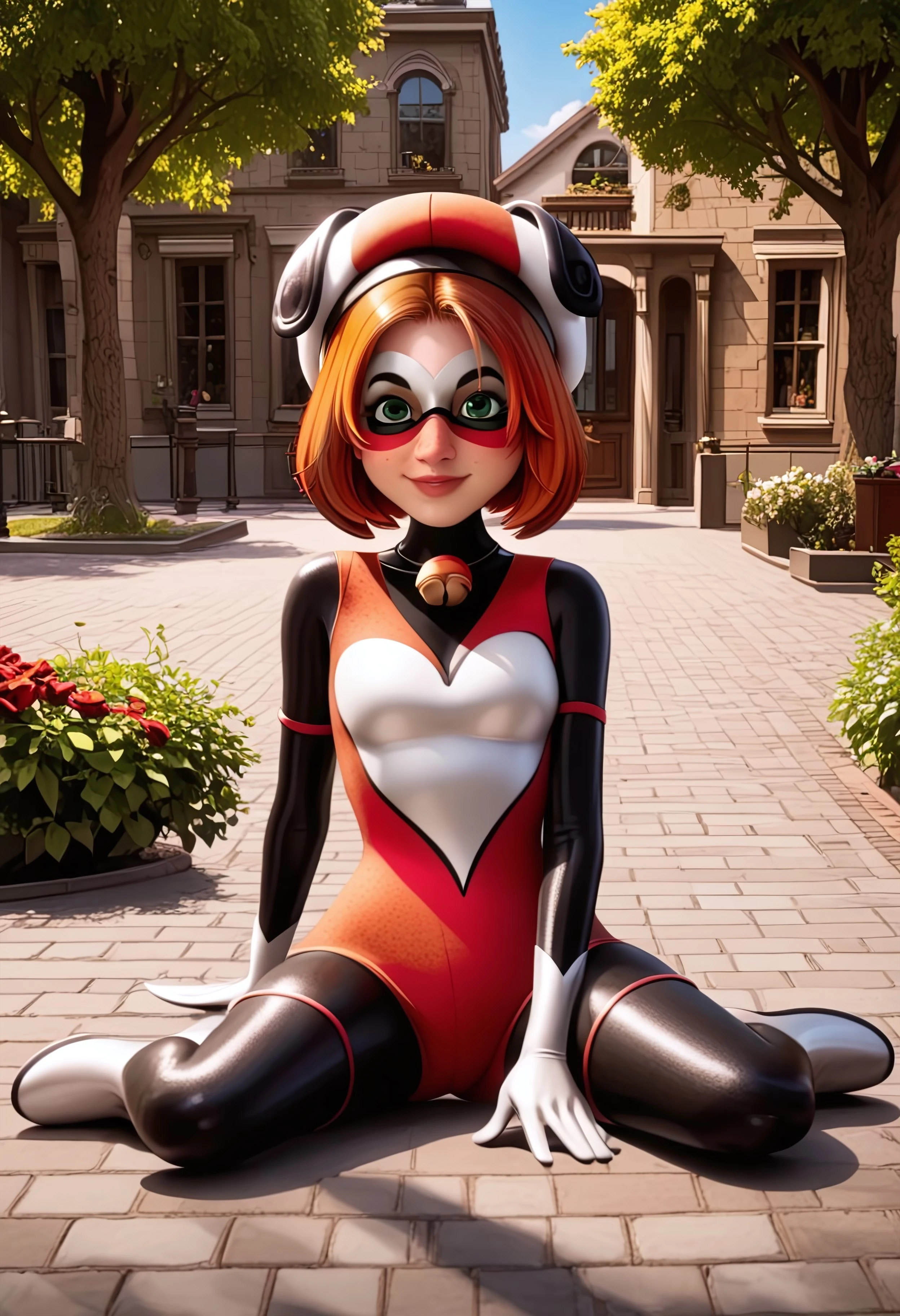 hat, gloves, mask, boots, white footwear, thighhighs, thigh boots, domino mask, , white glove, bell
