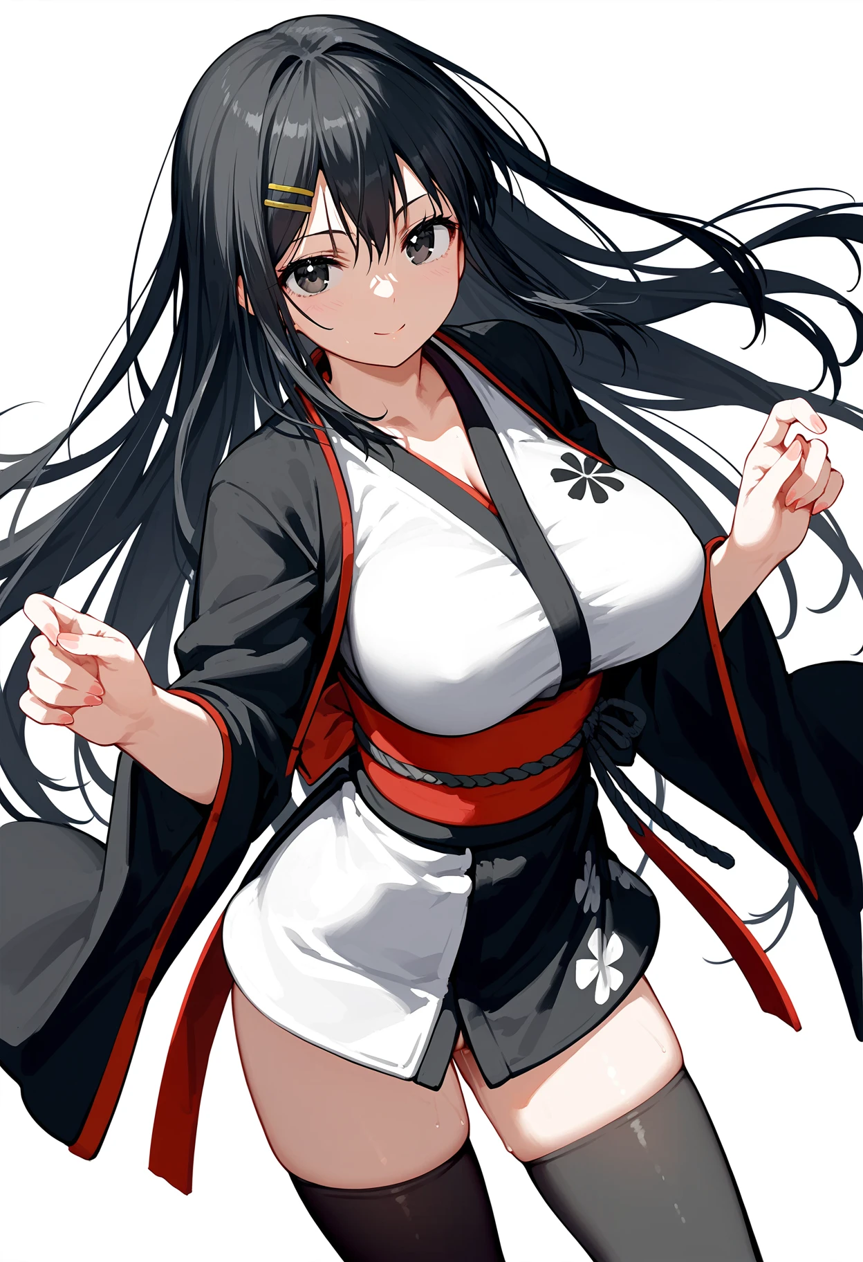 hair ornament, hairclip, black thighhighs, short kimono, japanese clothes