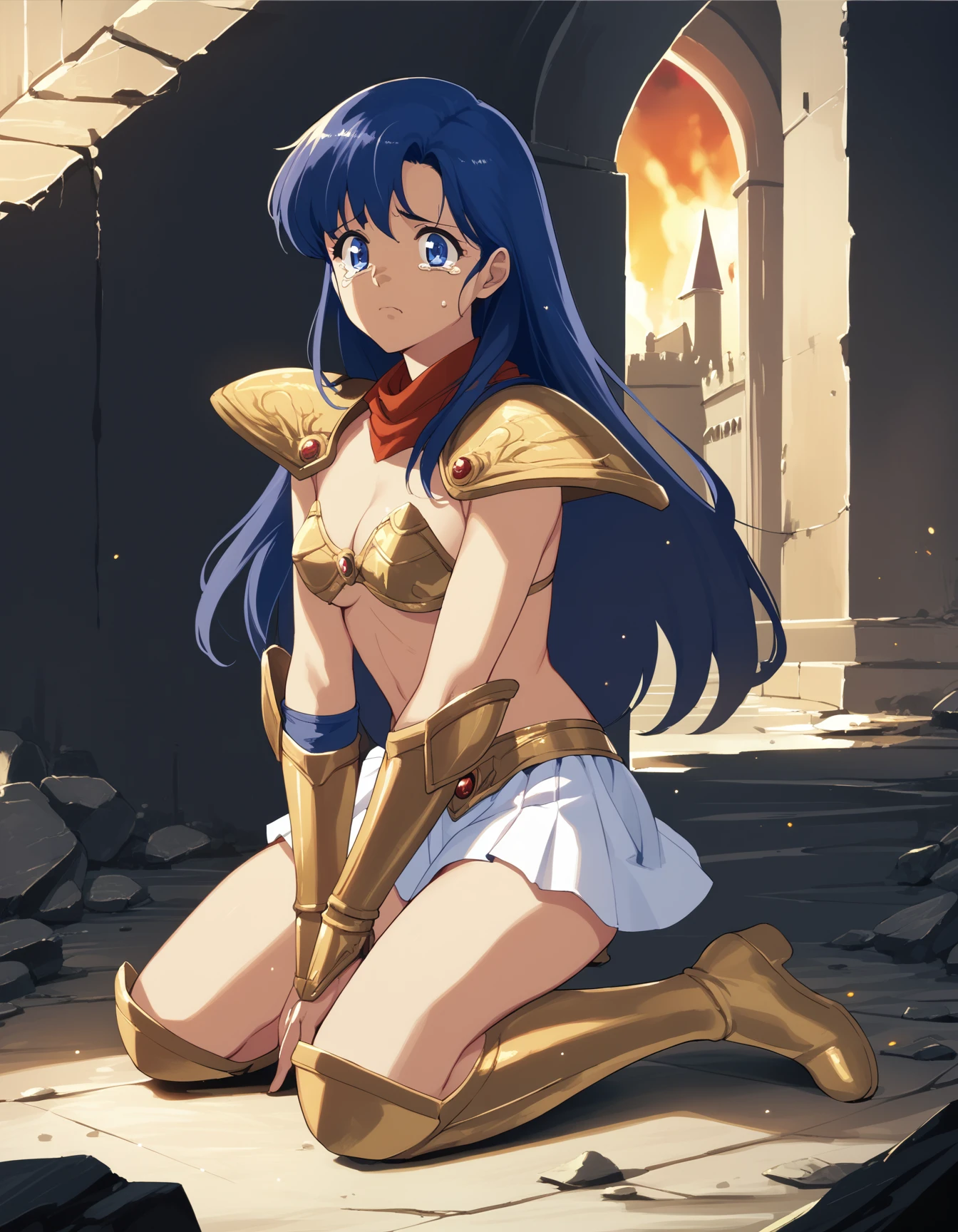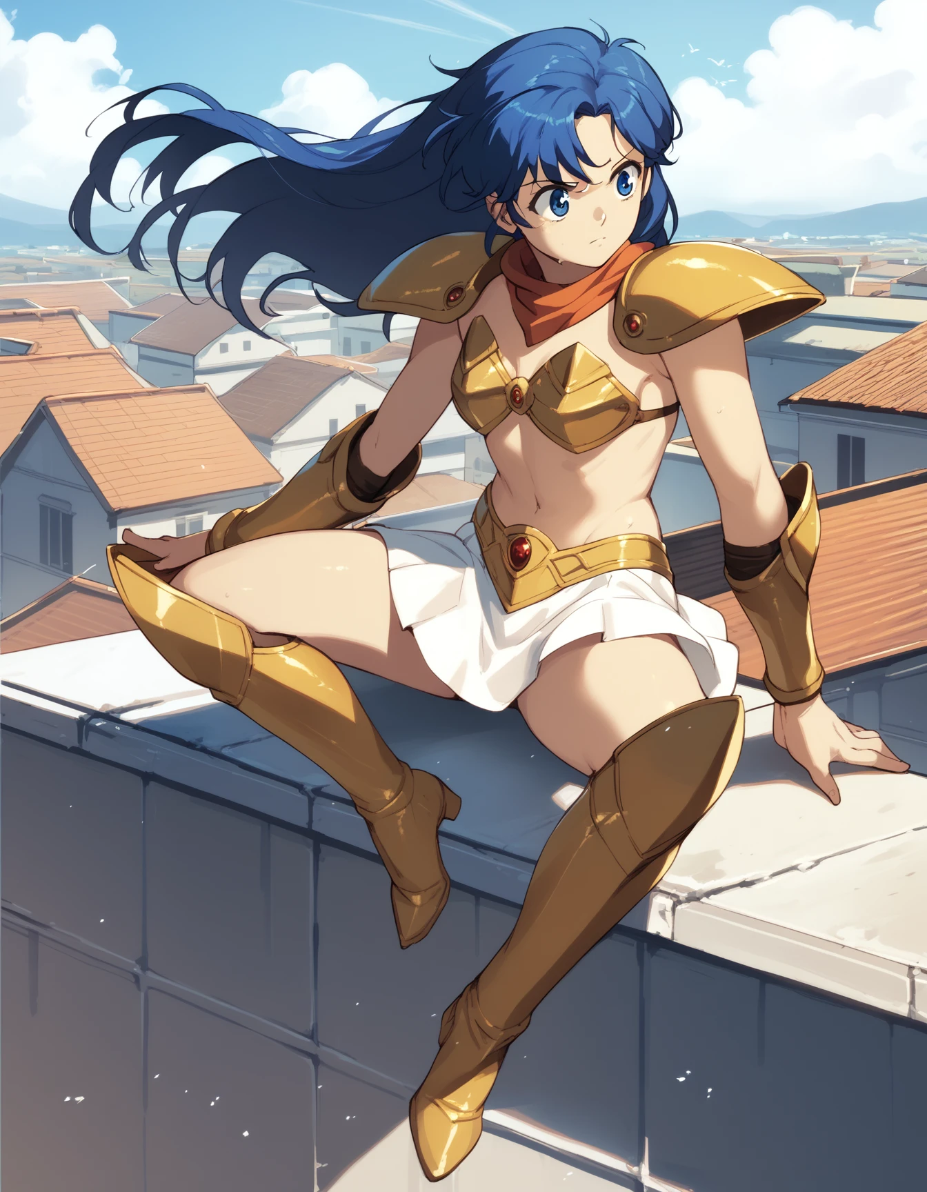 armor: asou yuuko, bikini armor, gold bikini, miniskirt, white skirt, shoulder armor, vambraces, knee boots