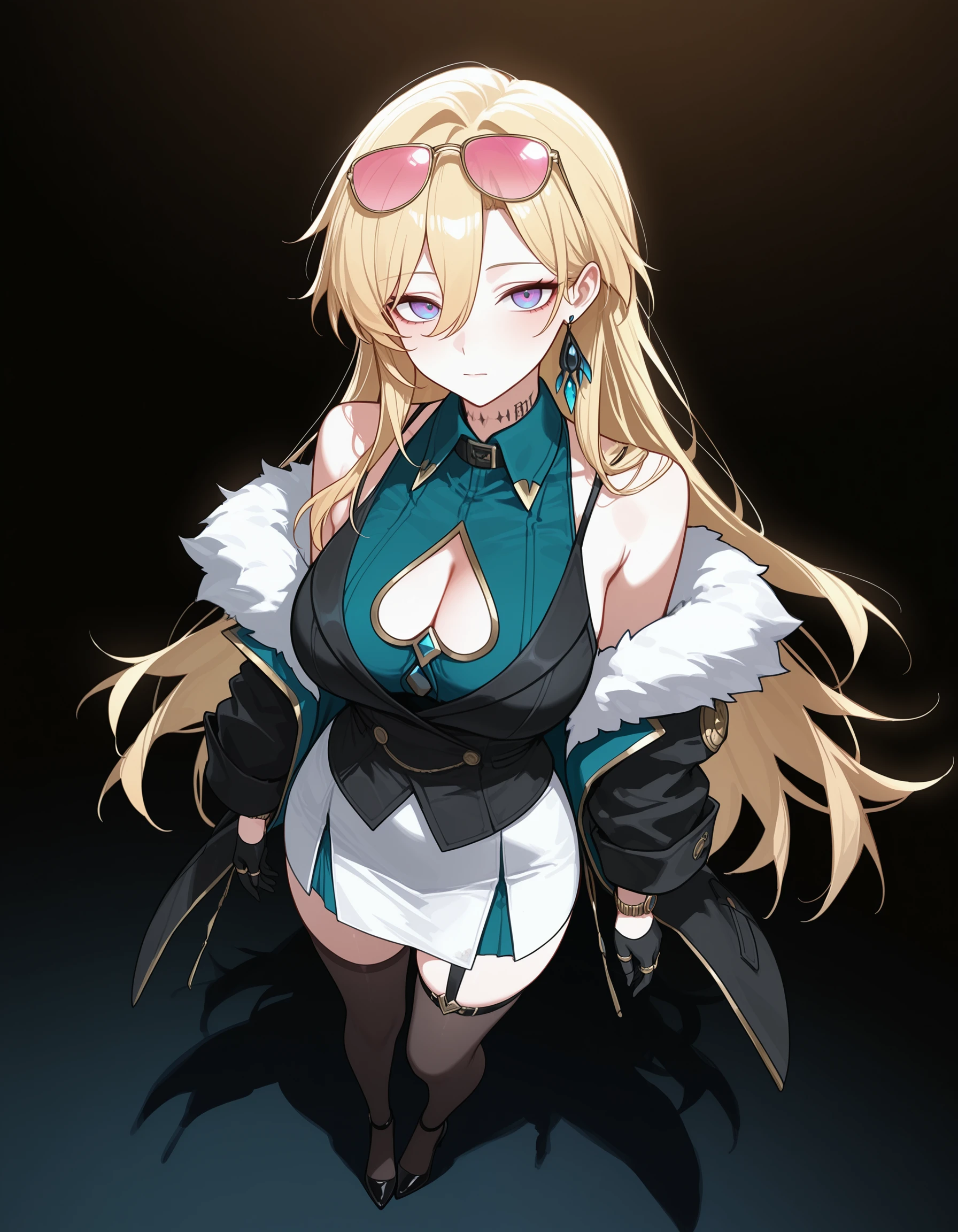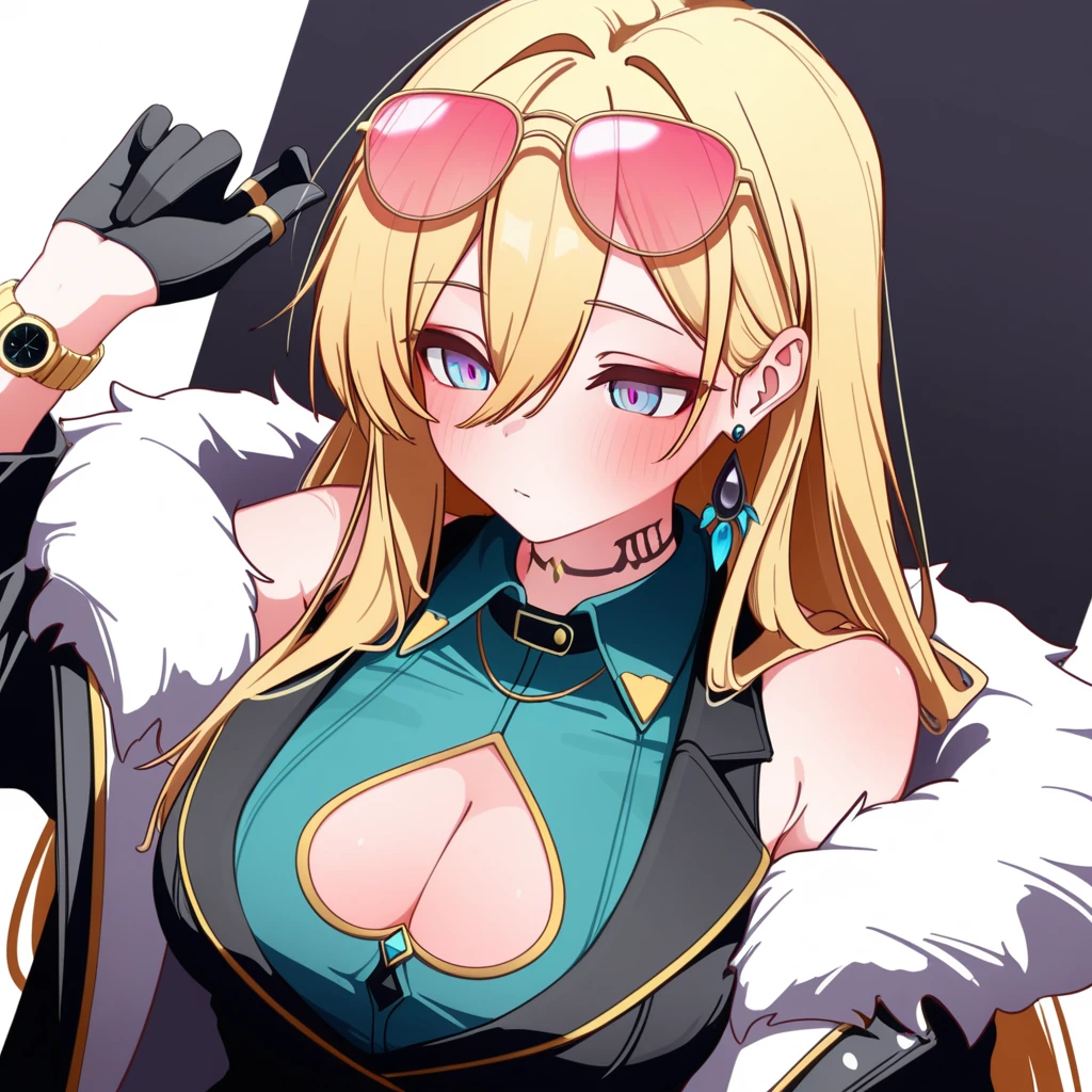 1girl, large breasts, blonde hair, hair between eyes, very long hair, two-tone eyes, purple eyes, blue eyes, eyelashes, makeup, neck tattoo, jewelry, single earring, bracelet, wristwatch, multiple rings,