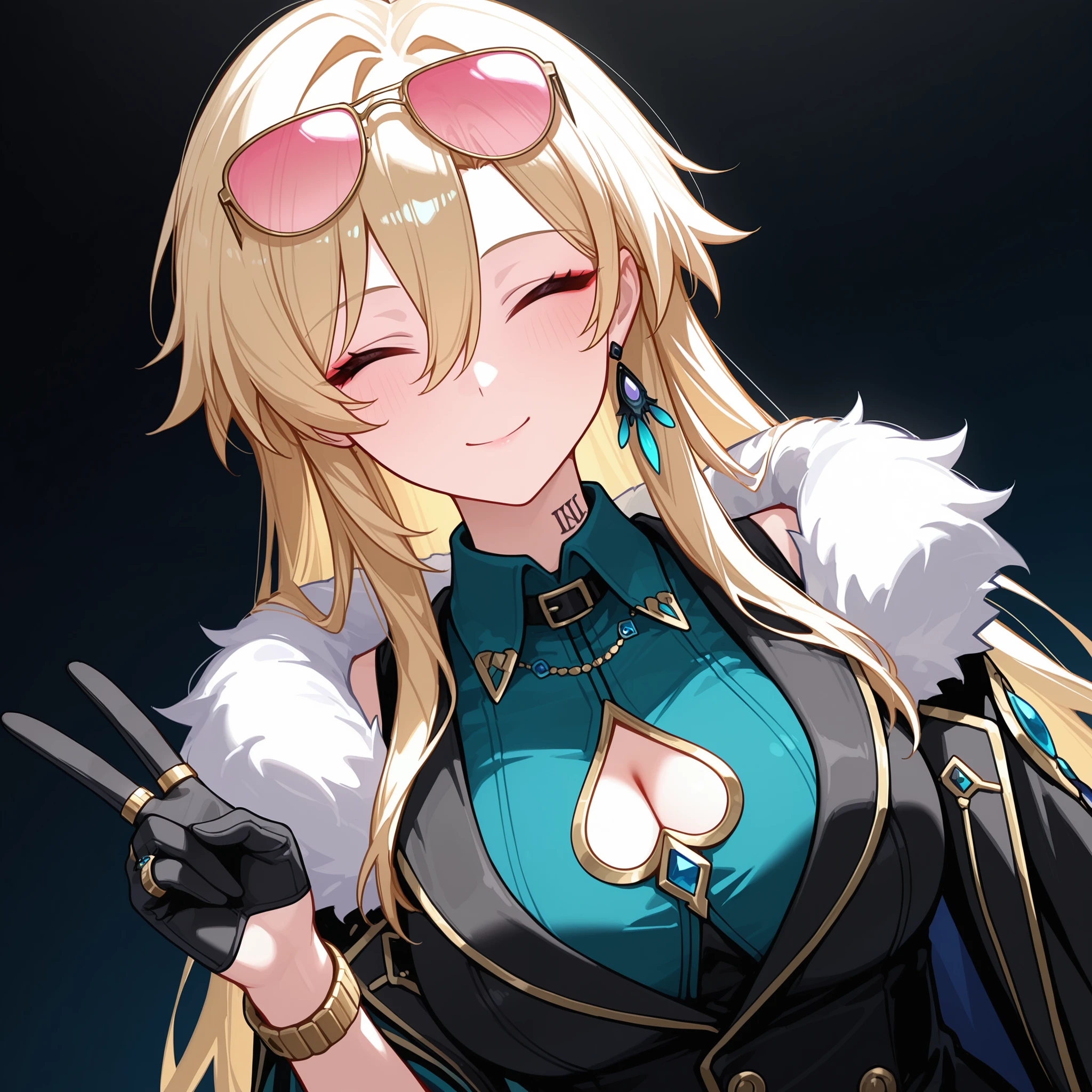 black gloves, half gloves, cleavage cutout, clothing cutout, spade cutout, aqua shirt, collared shirt, black vest, fur-trimmed jacket, black jacket