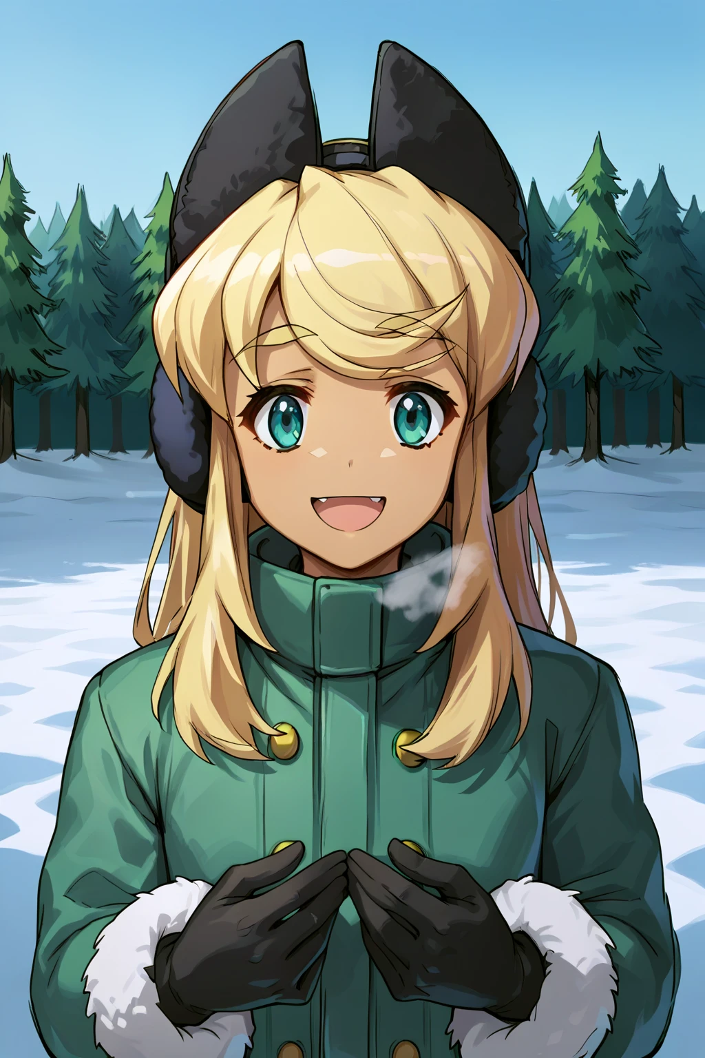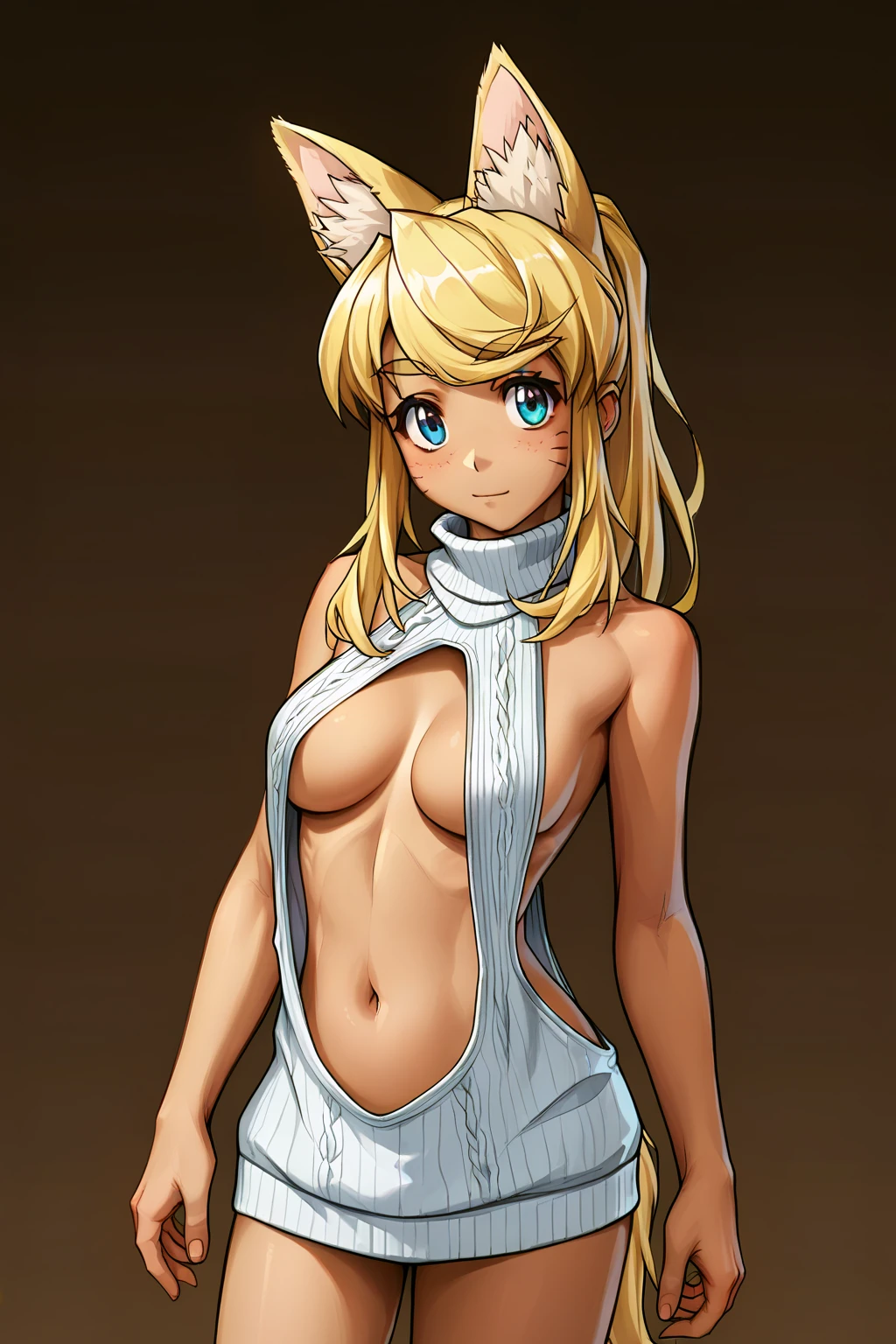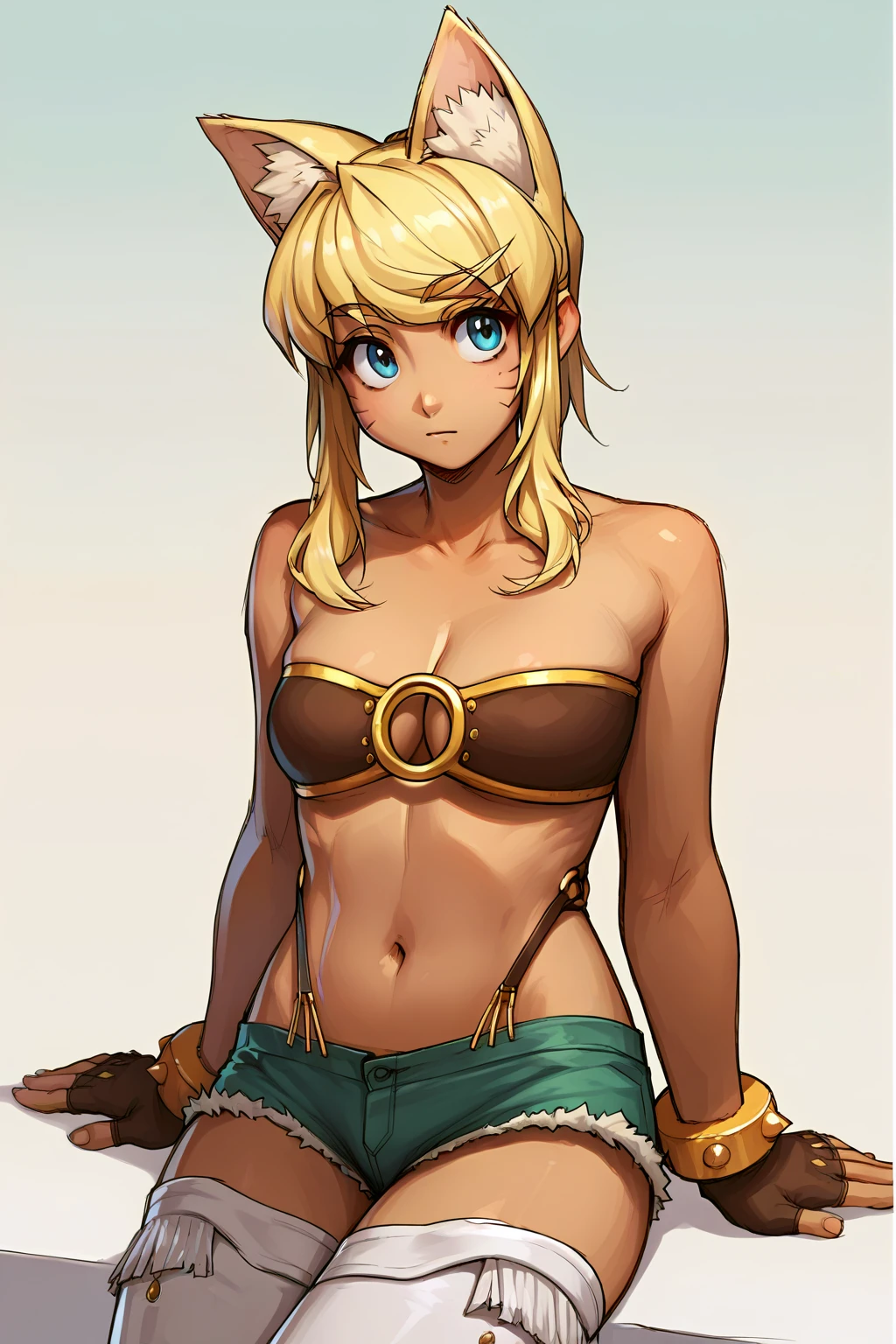 V1: blonde hair, beltbra, dark skin, whisker markings