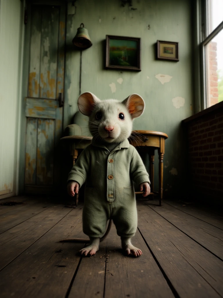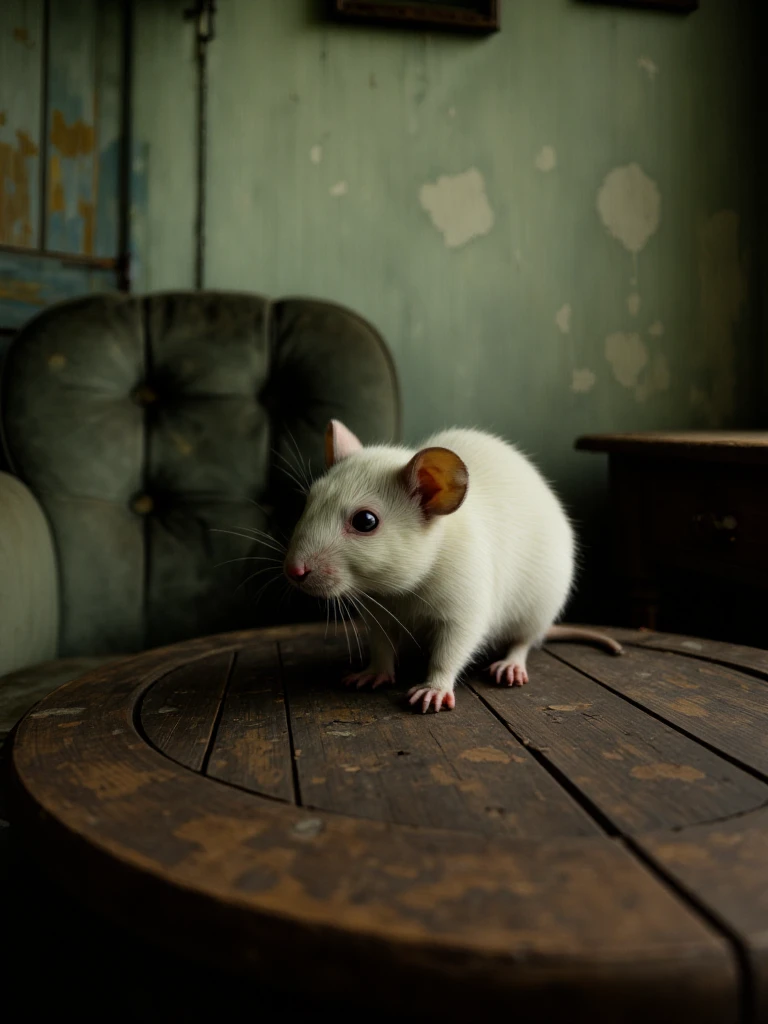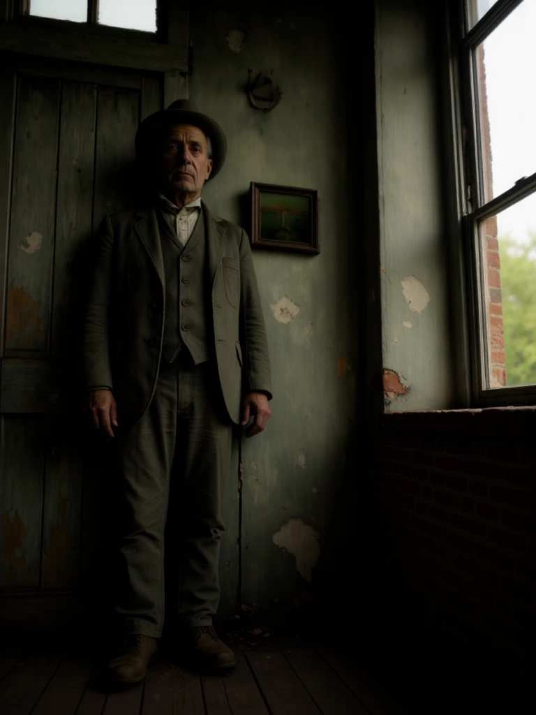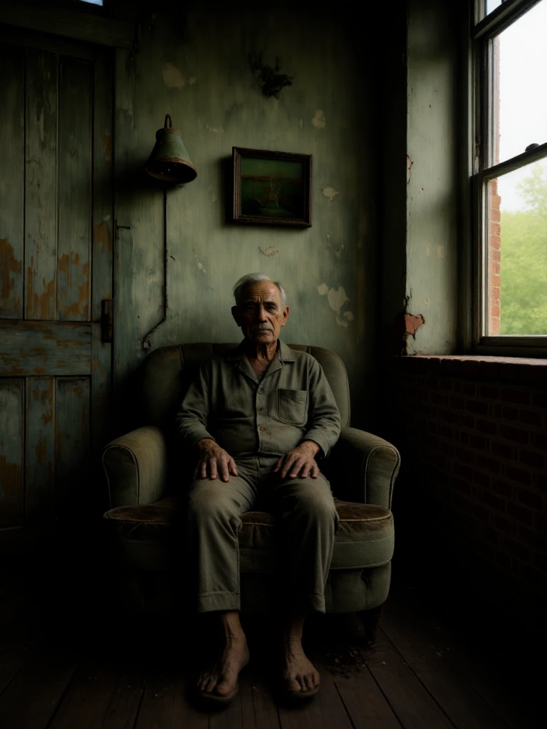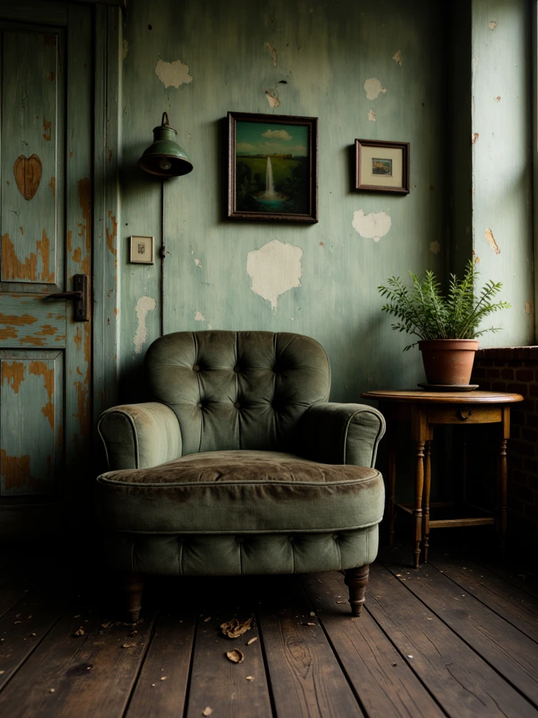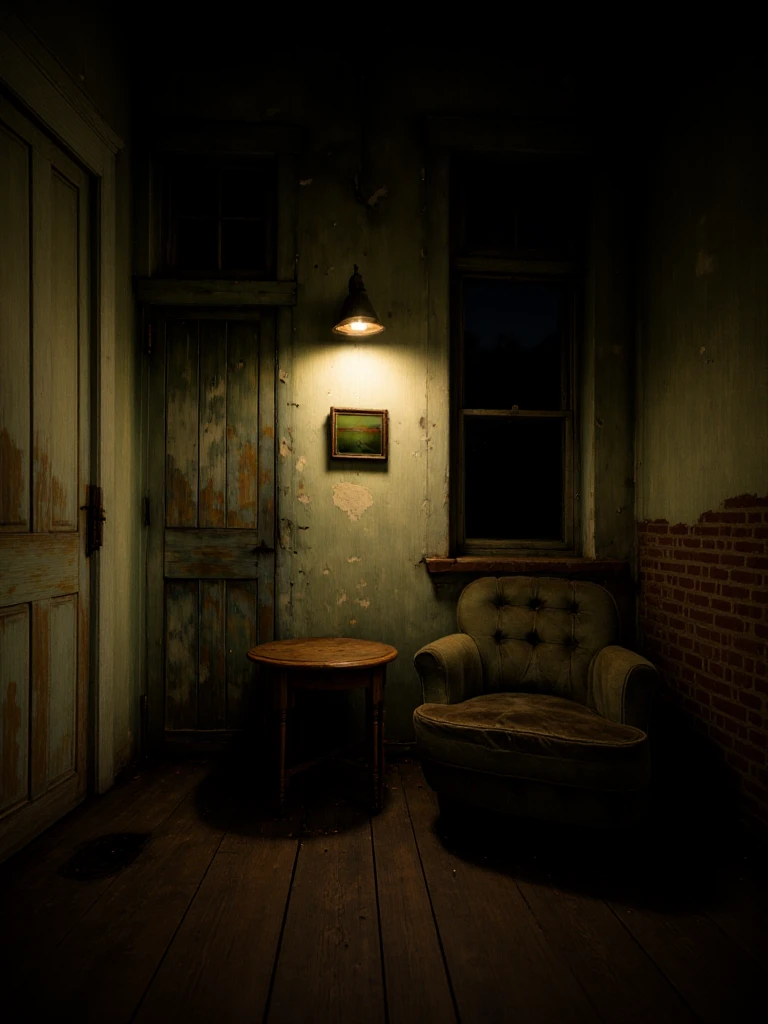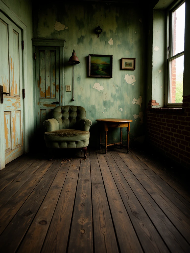 Rustic, melancholic, forgotten room suspended in time, where peeling green walls and weather-worn wood tell the story of quiet abandonment. A sagging armchair rests in stillness beside a small, scarred table, as if waiting for someone who will never return. Soft, muted light brushes the surfaces, revealing dust, cracks, and faded colors, while the narrow space amplifies a sense of solitude. The scene breathes nostalgia and decay at once - a melancholic interior shaped by memory, silence, and the slow passage of years.