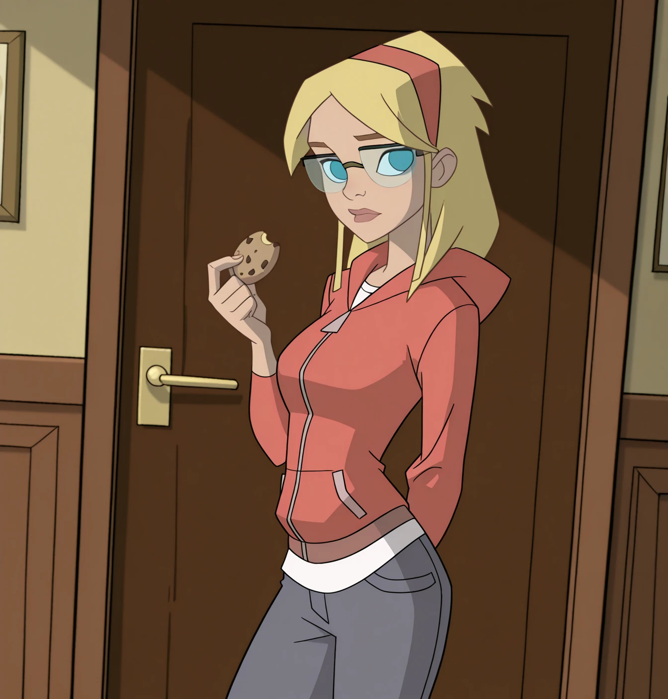 Gwen Stacy: gw3n, 1girl, solo, no pupils, medium breasts, long hair, blue eyes, blonde hair, long sleeves, red jacket, glasses, lips, hoodie, red jacket, black-framed eyewear, red hairband, over-rim eyewear, shirt, pants
