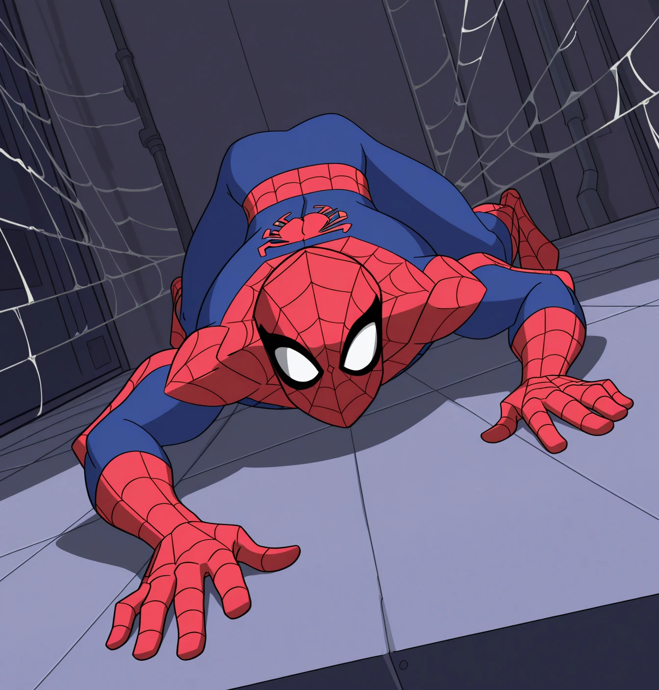 Spider-Man: spider-man, solo, 1boy, male focus, mask, bodysuit, red gloves, superhero, red bodysuit, blue bodysuit, spider web print