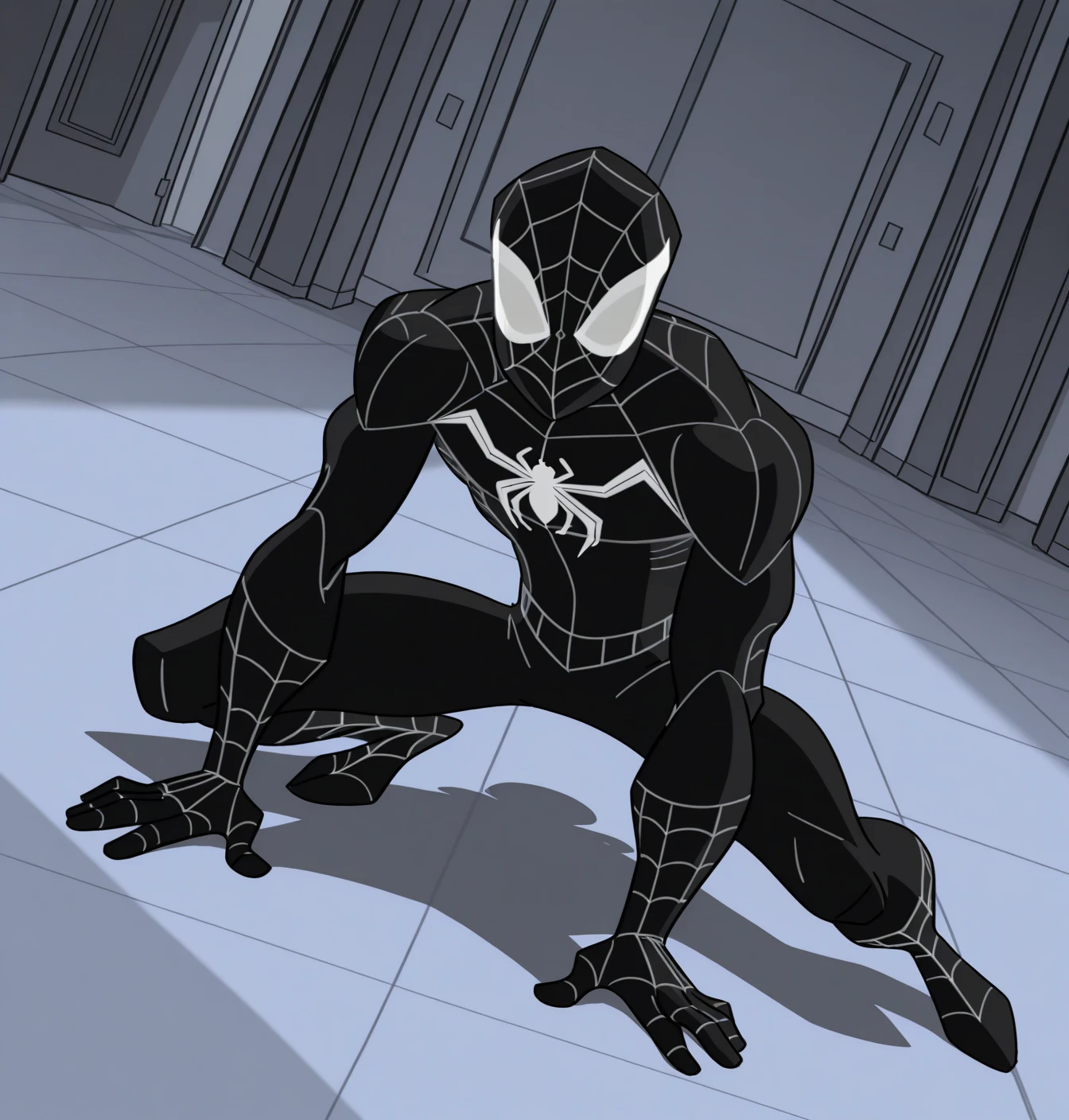 // Black Bodysuit: spider-man, solo, 1boy, male focus, mask, black bodysuit, black gloves, superhero