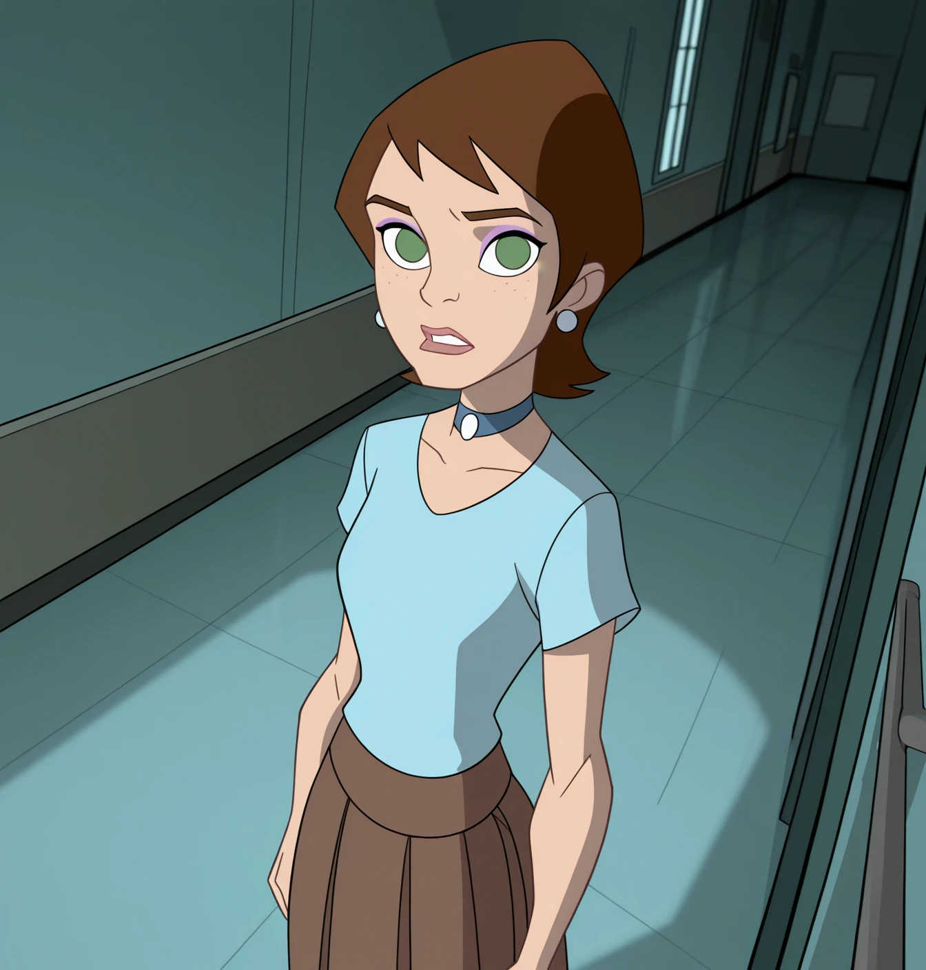 Betty Brant: (b3tty), 1girl, solo, short hair, brown hair, green eyes, makeup, earrings, jewelry, borwn skirt, blue shirt, choker, short sleeves