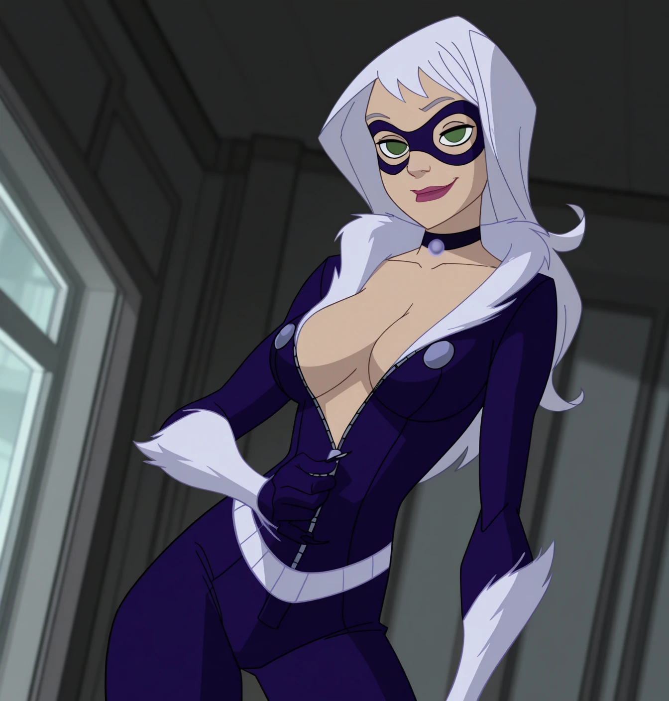 Black Cat: black cat \(marvel\), 1girl, solo, large breasts, long hair, green eyes, white hair, black choker, white fur, fingernails, makeup, mask, domino mask, purple bodysuit, lipstick, claws, long firgernails, purple gloves