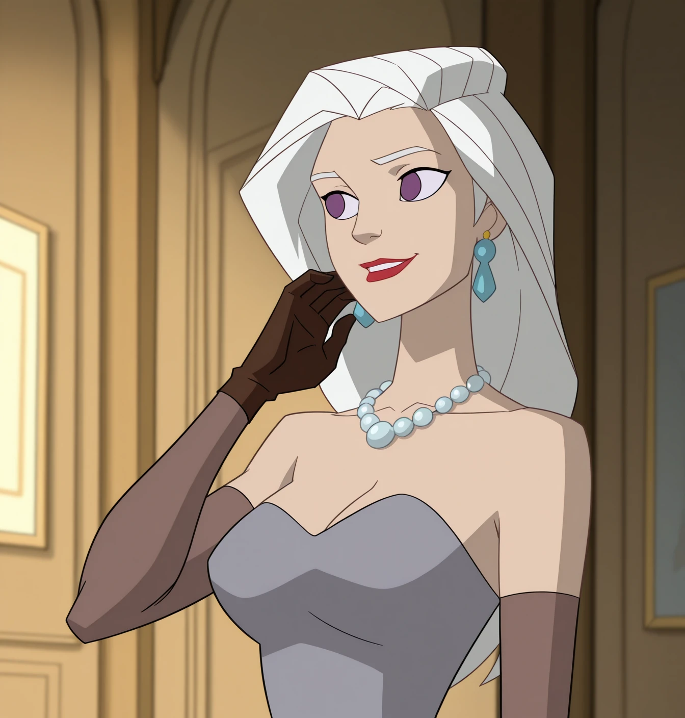 Silver Sable: s4bl3, 1girl, solo, large breasts, long hair, no pupils, smile, gloves, dress, jewelry, bare shoulders, purple eyes, collarbone, white hair, earrings, medium breasts, elbow gloves, grey dress, necklace, lipstick, red lips, pearl necklace, brown gloves